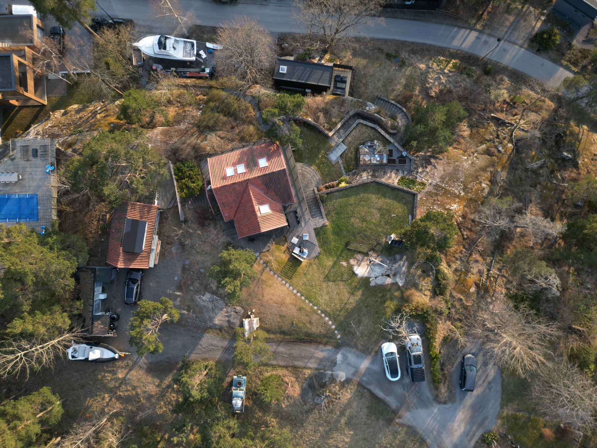 Fastigheten angörs såväl via Askvägen som Friggvägen och skapar två distinkta nivåer på tomten. På fastigheten finns ett huvudhus om ca 73kvm med bl.a. bergvärme, tre sovrum på övre plan och badrum med bastu på källarplan. Intill huvudhuset finns även ett separat gästhus med såväl kök och badrum. På tomten finns ytterligare förrådsbyggnad samt ett fint växthus.