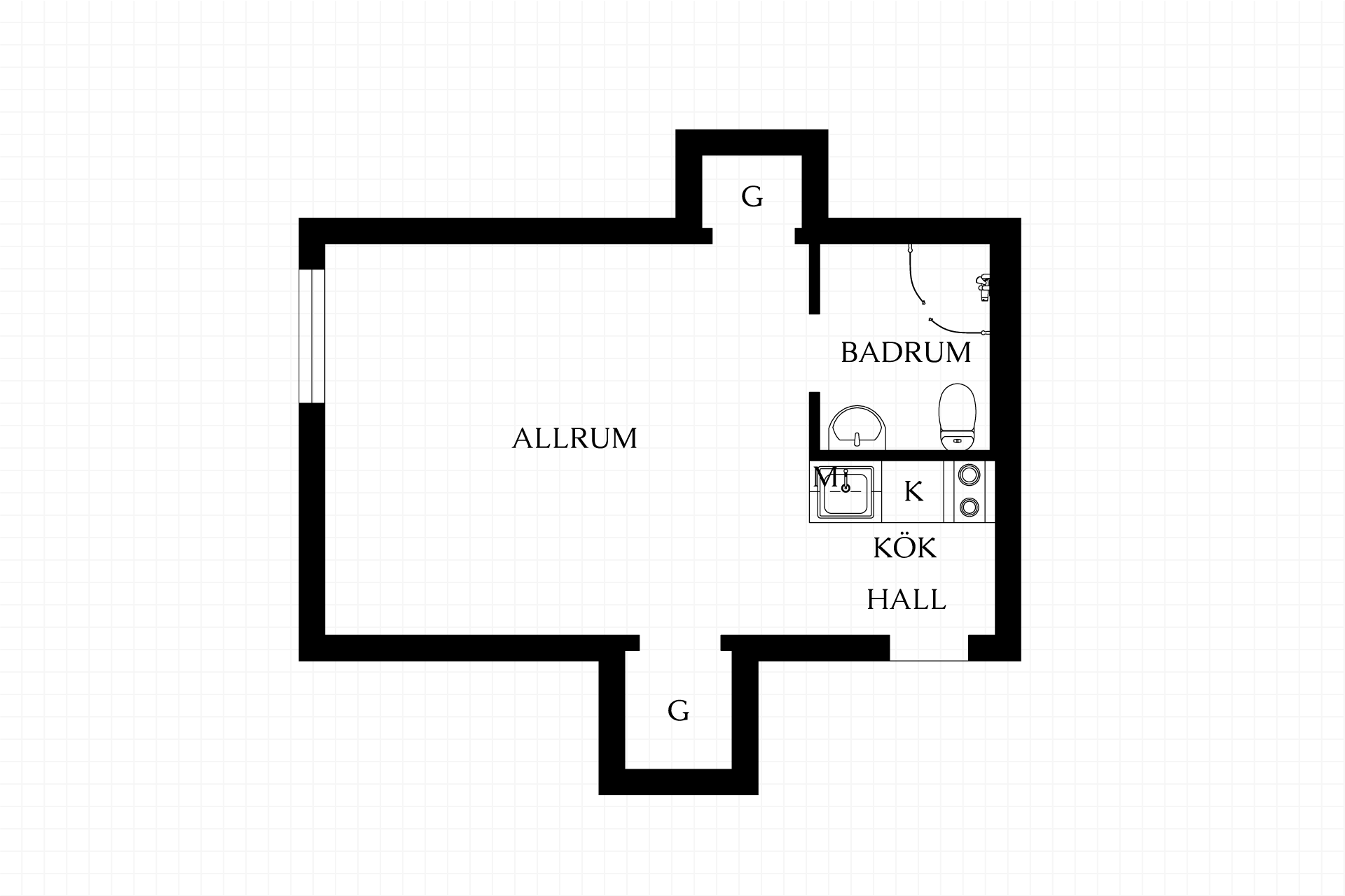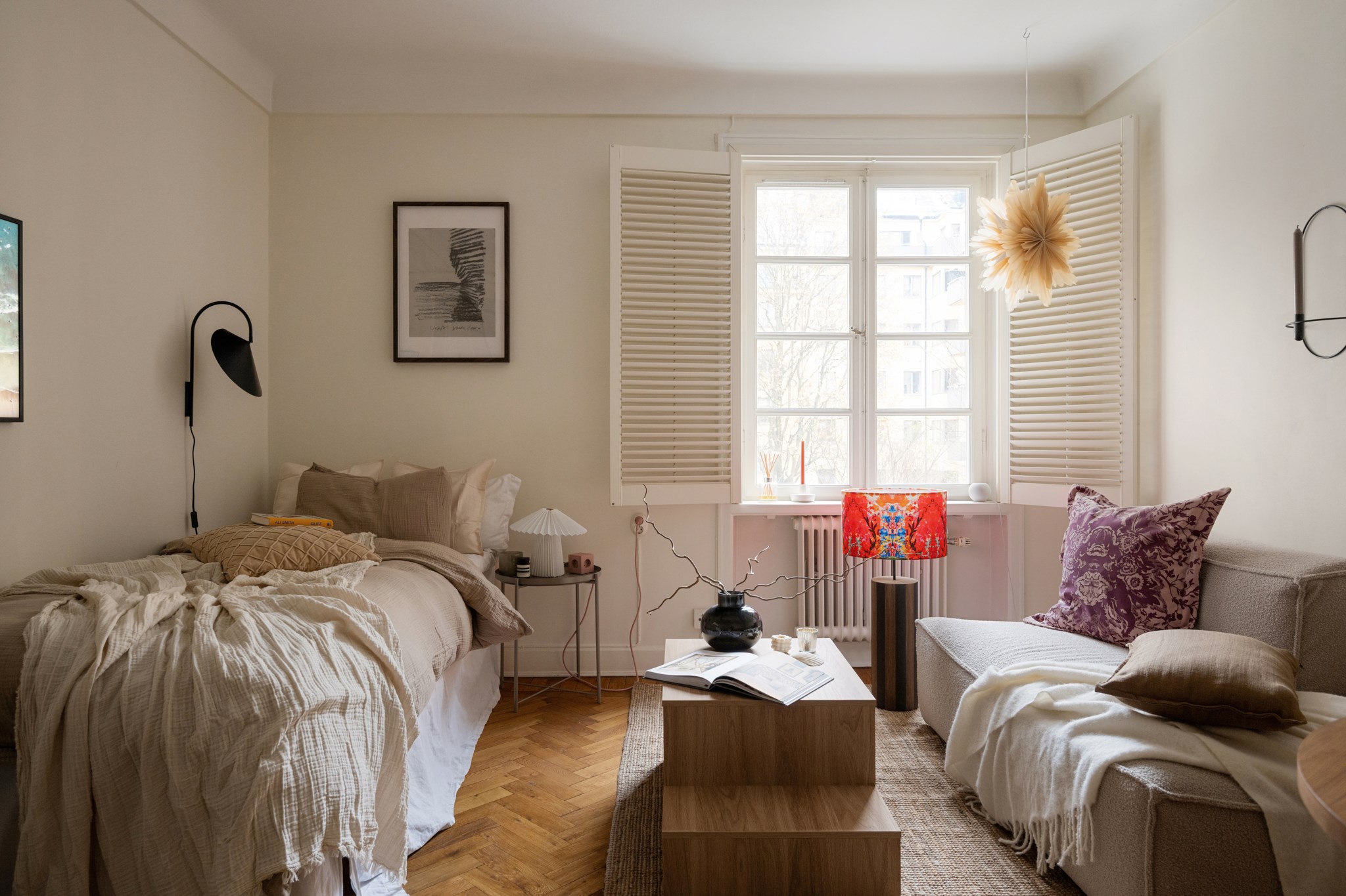 Ljust och luftigt allrum med väl tilltagen takhöjd, elegant fiskbensmönstrad parkett och vackert fönster med spröjs. Här finns plats för både säng, soffhörna och matbord. Gott om förvaring erbjuds tacka vare två inbyggda original garderober med speglade dörrar.