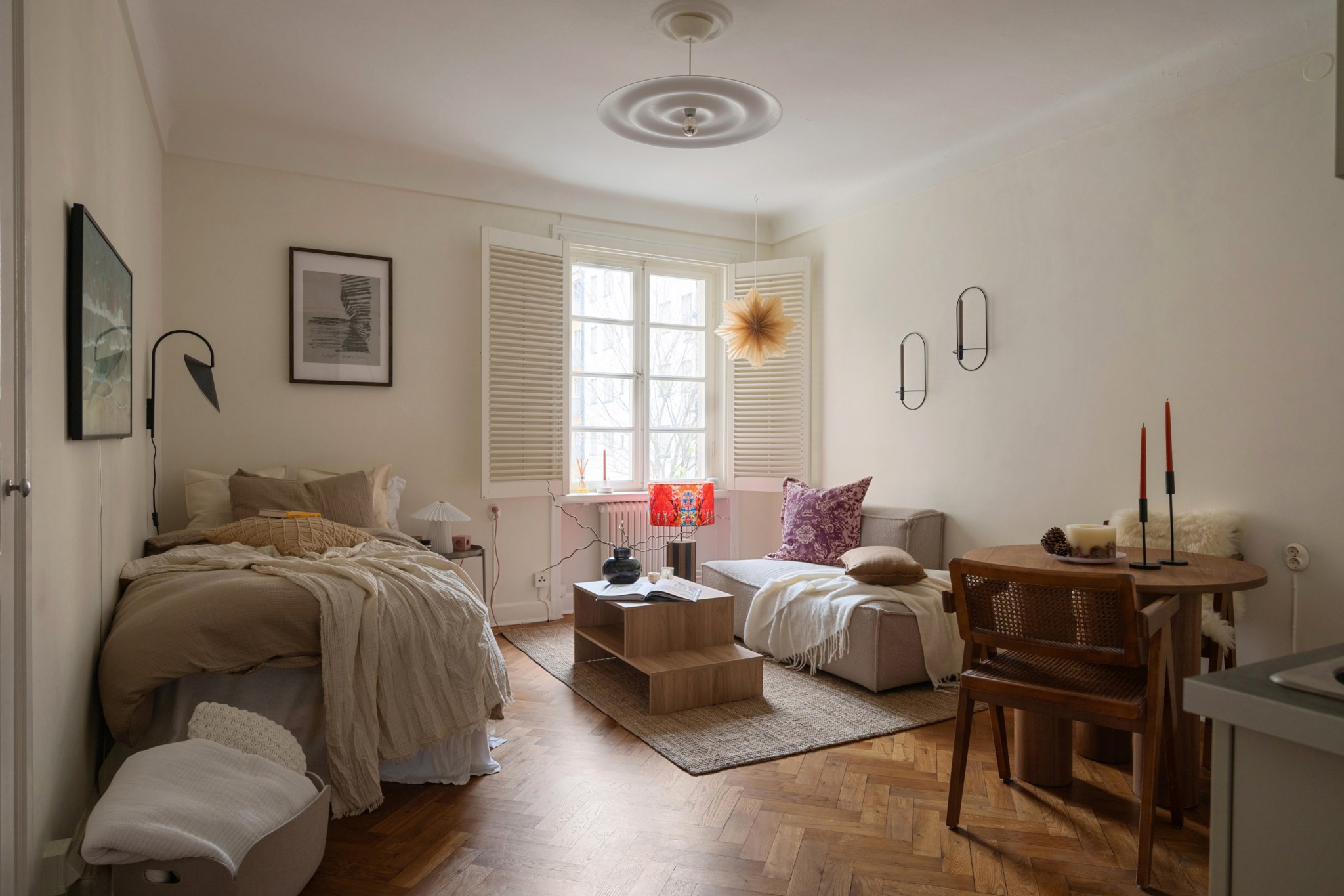 Ljuvlig studioetta där historiskt charm och modern komfort möts. Här bor du i ett vackert hus från 1929 på lummiga, lilla Bjurholmsplan ett stenkast från Nytorget. Lägenheten har en tidstypisk charm med väl tilltagen takhöjd, vackra golv, fönster med spröjs och djup fönsterbänk samt speglade dörrar som samspelar med moderna materialval i kök och badrum. Gott om förvaringsmöjligheter i inbyggda garderober med vackra speglade dörrar. Fönstret vetter mot innergården som bjuder på vy över trädkronor, vackra hus och blå himmel.
