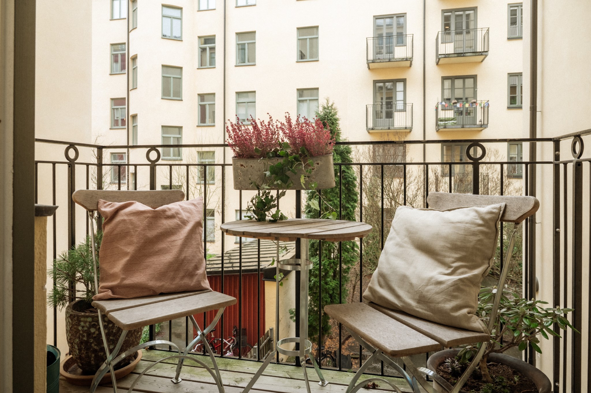 Balkong med plats för bord, stolar och planteringar. Söderläge.