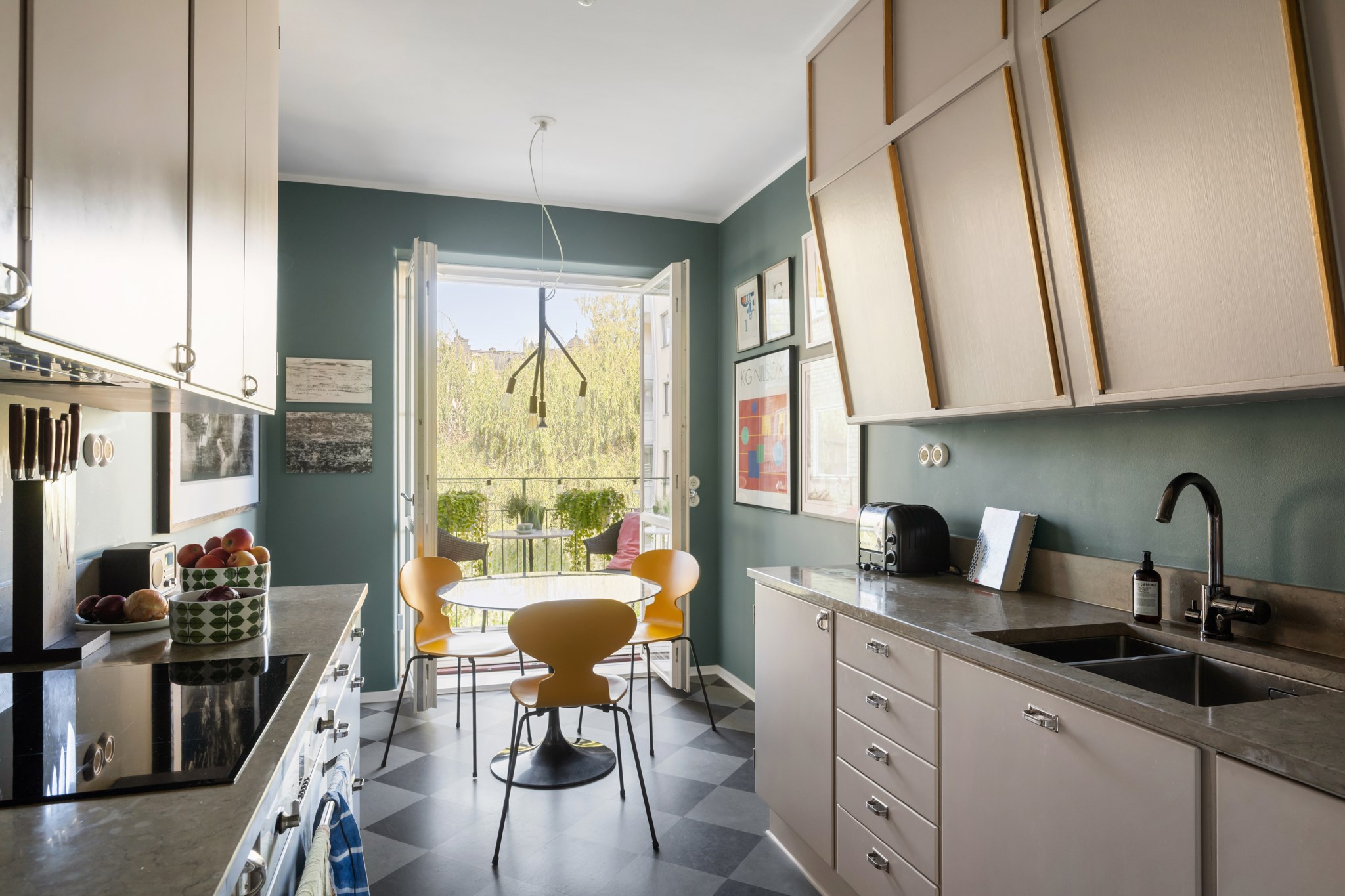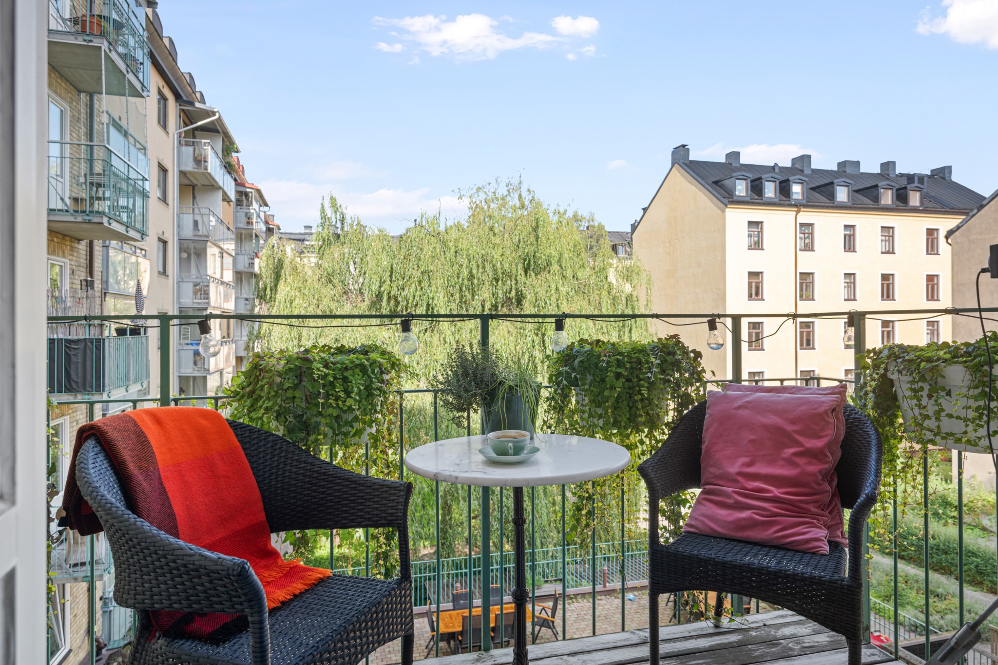 Lägenheten är smakfullt renoverad med stilrena materialval och en sober färgsättning som skapar en harmonisk helhet. Köket är både funktionellt och inbjudande, med gott om arbetsytor, förvaring och plats för matbord – härifrån nås balkongen som blir en lugn oas under årets varmare månader. Vardagsrummet är luftigt och socialt med fint ljusinsläpp från stora fönster mot stadsdelen. Sovrummet är rofyllt placerat mot gården och erbjuder goda förvaringsmöjligheter i originalgarderoberna. Badrummet är helkaklat och utrustat med dusch, tvättmaskin och golvvärme, vilket gör vardagen enkel och bekväm.