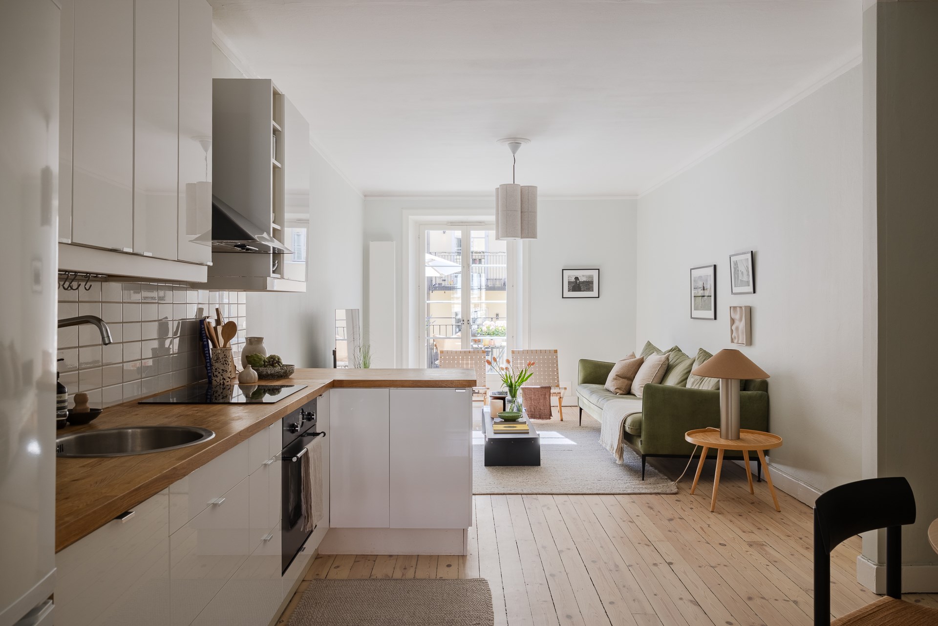 Ljust och rymligt kök i öppen planlösning med gott om förvaring, goda arbetsytor och bra matplats för många vänner och familj. Sociala ytor som inbjuder till mingel och middagar med öppet till vardagsrummet med en avskärmande "köksö". Här finns vitvaror i form av kyl/frys, integrerad diskmaskin, häll, ugn och fläkt. Fint trägolv i original och ljusa väggar.