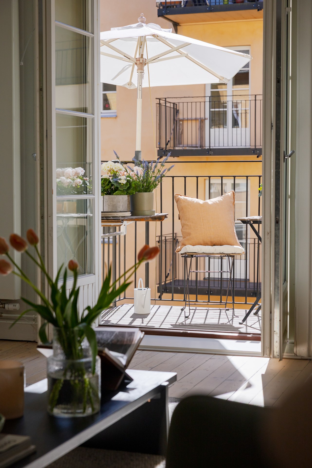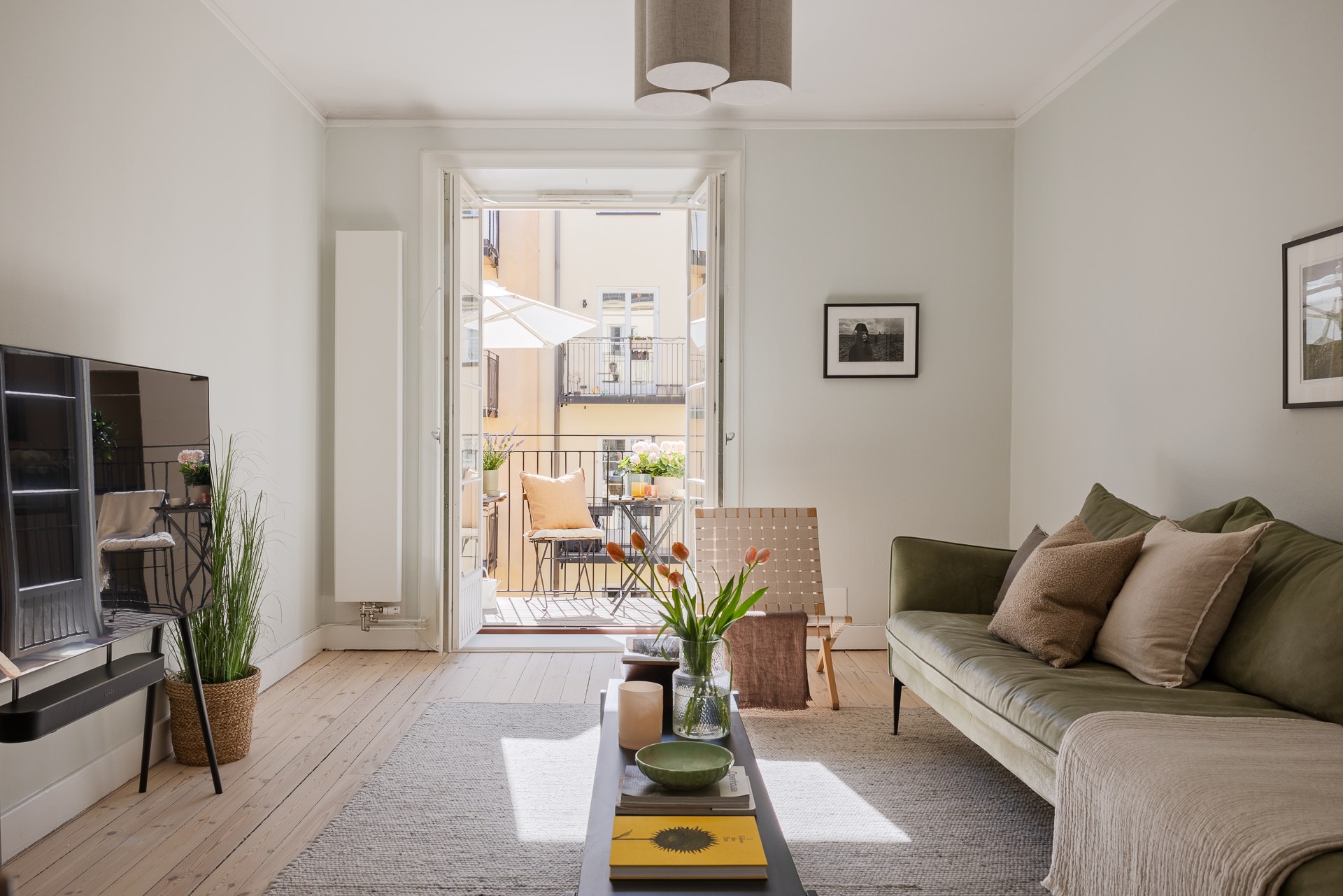 Lättmöblerat och luftigt sällskapsrum med glasad pardörr till balkongen. Det höga läget gör rummet otroligt ljust. Vardagsrummet har plats för soffa, fåtölj, TV-möbel och övrigt möblemang. Samma fina originalgolv och ljusa väggar. Balkongen förlänger rummet ytterligare under sommarhalvåret och har gott om sol. Här finns plats för bord, stolar och planteringar. Lugnt och tyst mot lummig gård där körsbärsträdet blommar under våren.