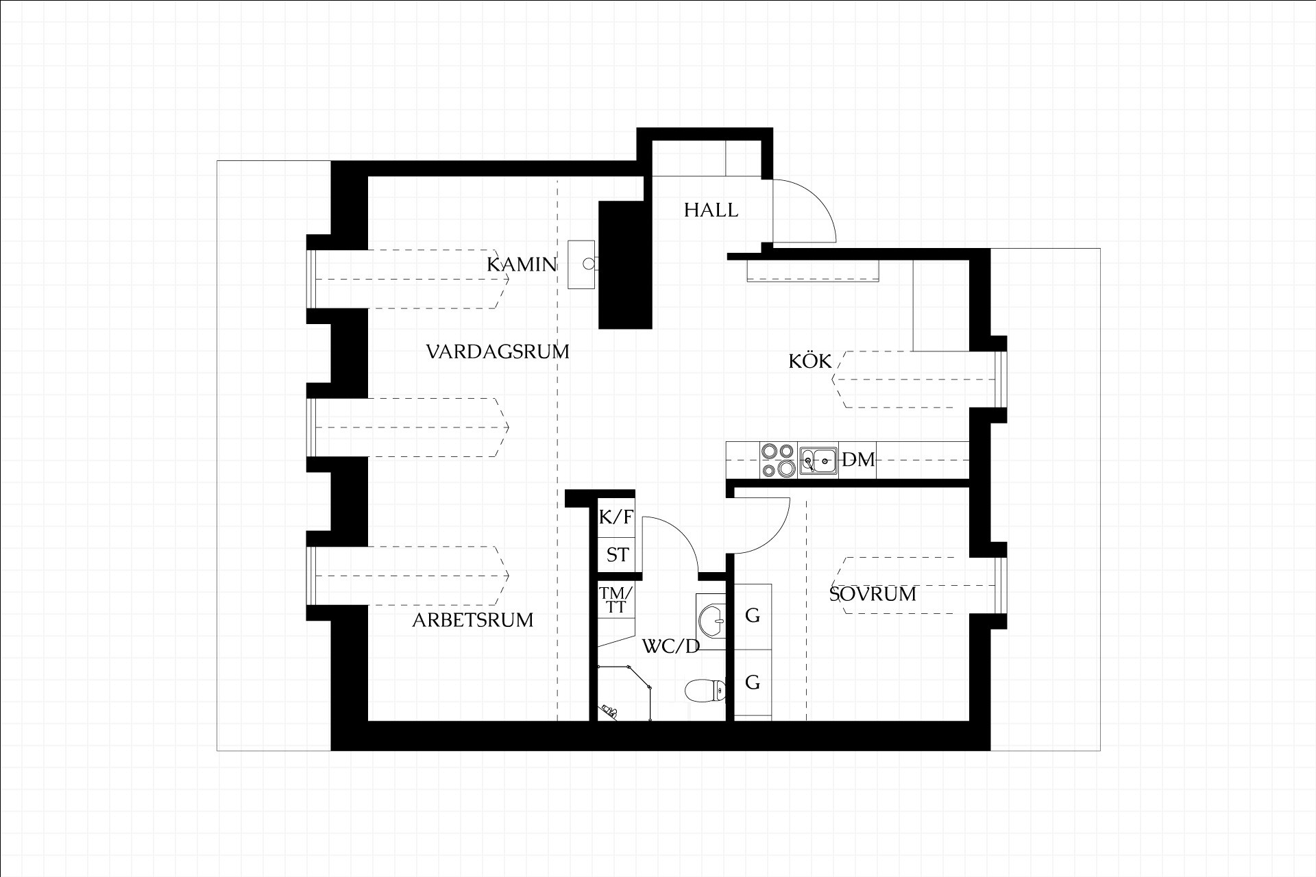 Luftigt och socialt vardagsrum med öppen planlösning mot kök. Genomgående planlösning med fönster i två väderstreck och generöst ljusinsläpp från tre fönster, belägna mot lugna Brännkyrkagatan. Vardagsrummet ligger i öppen planlösning mot kök och matplats med en centralt placerad braskamin. Vindskaraktären gör sig påmind med synliga bjälkar och utsikt över himmel och tak. Ytan är luftig och rymmer både ett rejält matbord för ca 8 -10 personer, en stor soffa, fåtöljer och Tv-bänk. Här kan den som önskar enkelt dela av rummet och få ett barnrum, gästrum eller kontor.