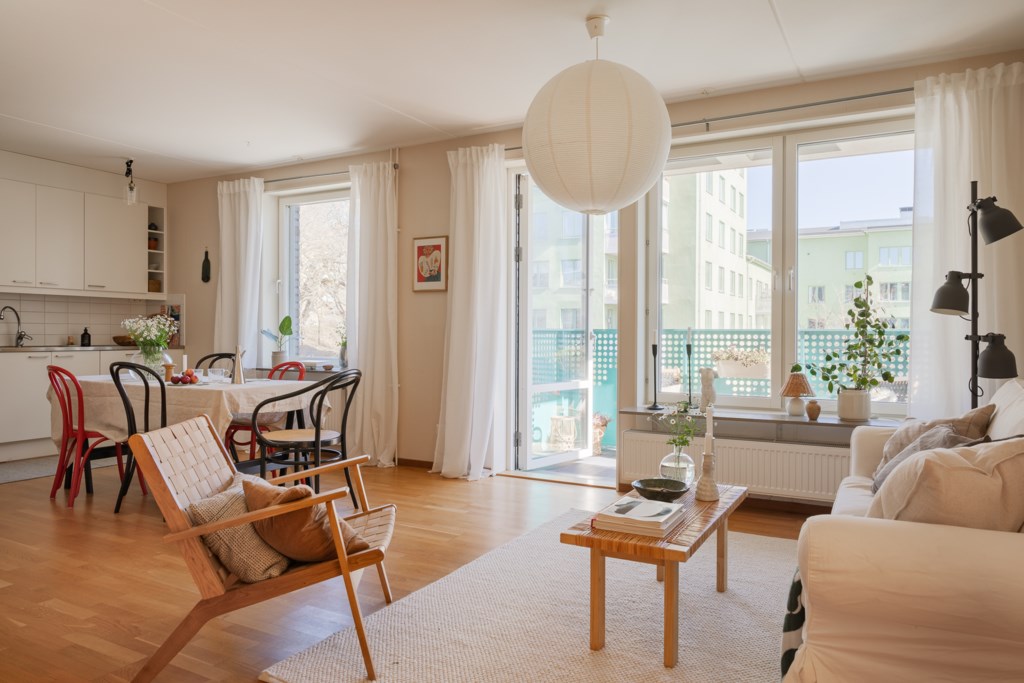 Lägenheten har ovanligt stora sällskapsytor med luftigt vardagsrum med vackert burspråk. Här finns gott om plats för såväl större soffgrupp som TV-möbel och bokhyllor. Det ljusa och väl tilltagna köket, som är utrustat med moderna vitvaror erbjuder också goda arbetsytor och en rejäl matplats som rymmer både släkt och vänner. Från köket har man dessutom utgång till den soliga balkongen som vetter ut mot trädgården och förlänger umgängesytorna ytterligare. Ljuvligt sovrum med rofyllt läge och fönster i två väderstreck. I sovrummet finns det plats för den större dubbelsängen och i sovrummet erbjuds även ypperliga förvaringsmöjligheter i en platsbyggd garderobsvägg. Inbjudande hall med utmärkt förvaring samt ett stambytt badrum med badkar och fönster. Hela lägenheten håller en sober färgsättning och bjuder på en underbar atmosfär som måste upplevas på plats!