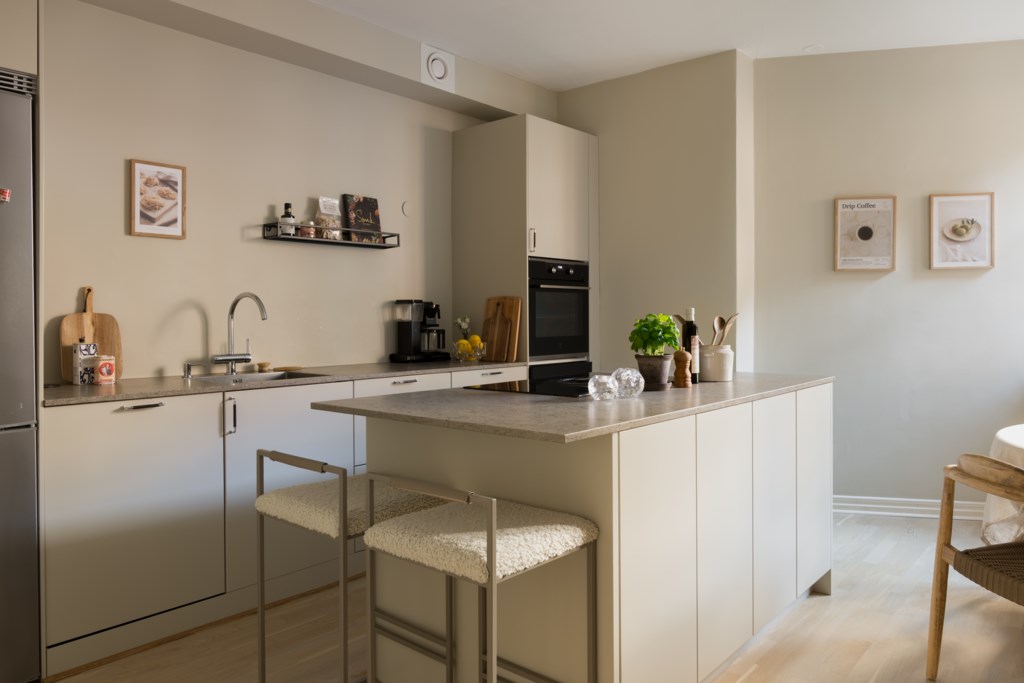 Den öppna planlösningen mellan kök och vardagsrum bjuder in till sociala middagar och sena samtal, medan färgsättningen – med djärvt målade tak och genomtänkta detaljer – skapar en känsla av nu. Detaljer som speglade innerdörrar, originalspröjs och mjuka trägolv knyter an till husets historia, samtidigt som designvalen är redo för ett trendigt 2025.