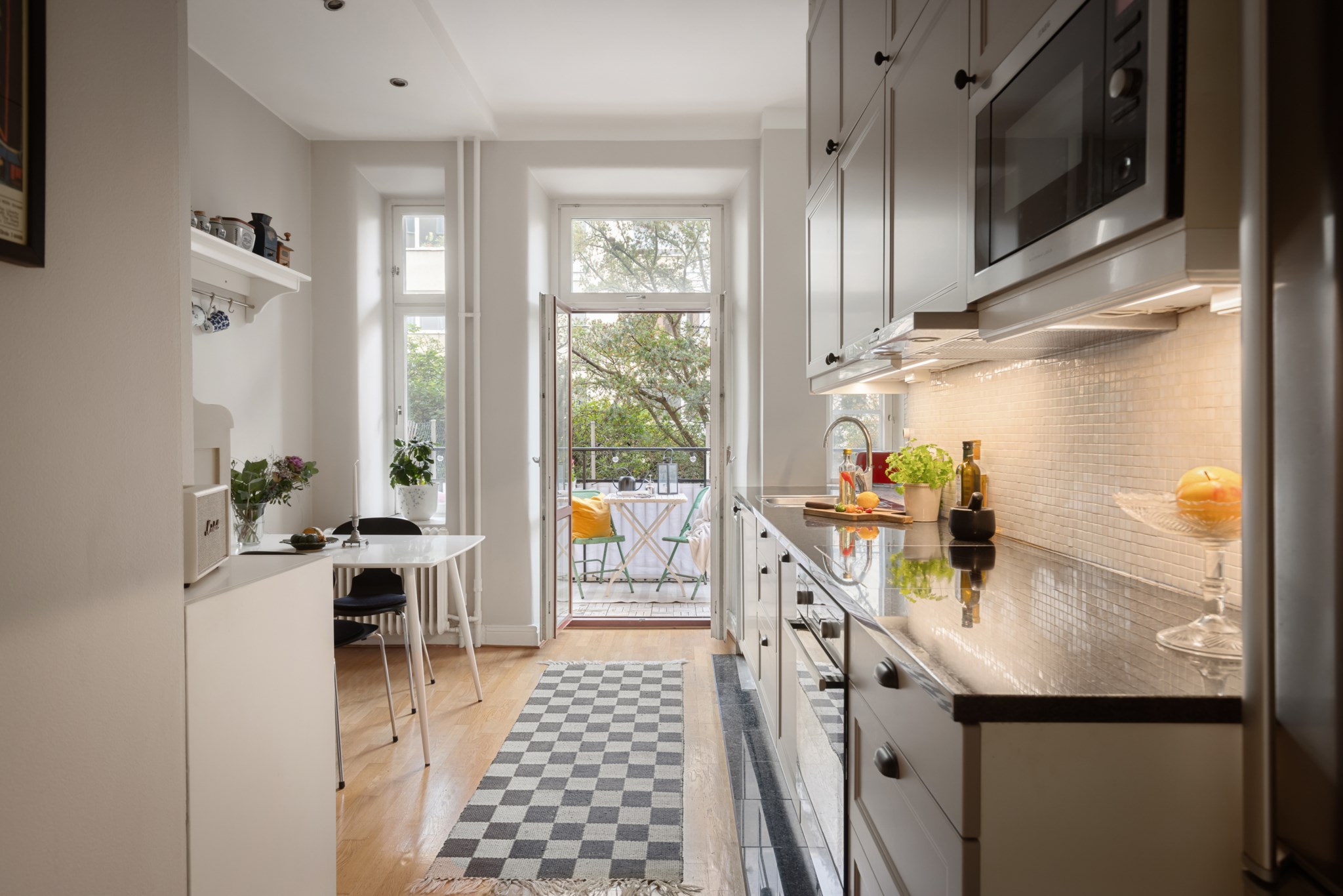 Fiskbensparkett, höga fönster och över tre meter i tak skapar rymd och karaktär – en miljö som känns både varm och inbjudande. Balkongen vetter mot gården och blir en självklar plats att sitta, koppla av och njuta av lugnet mitt i hjärtat av Södermalm.