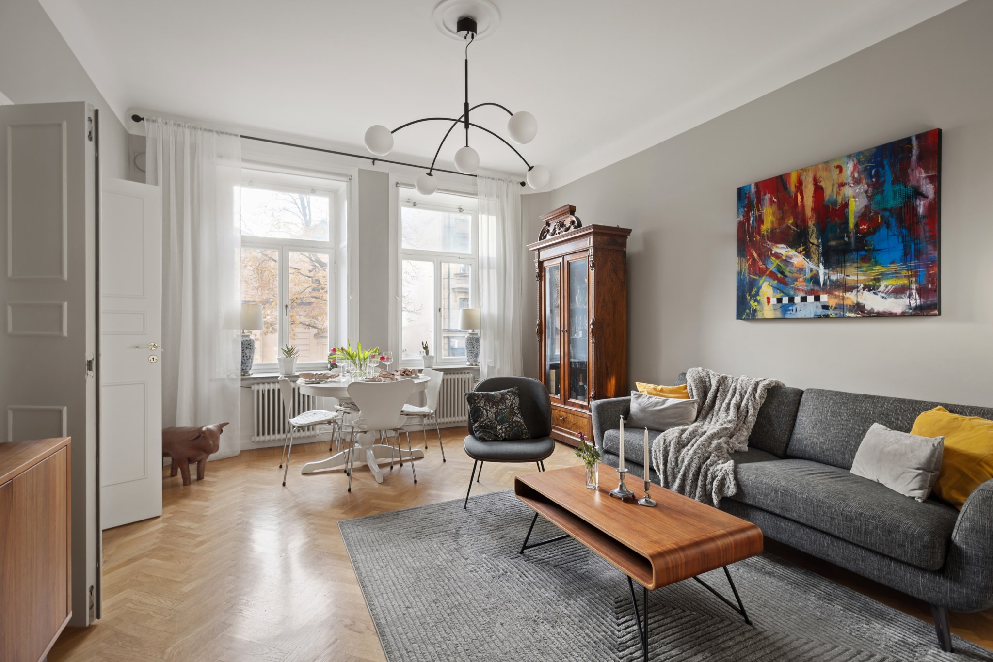 Vardagsrummet imponerar med sin luftiga känsla och fint ljusflöde från två vackra parfönster med låg bröstning och hög höjd. Här finns gott om utrymme för soffgrupp, fåtöljer, TV-hörna samt en matplats med utrymme för stora middagssällskap. Fönstren i söder ger ett härligt ljus och bjuder på utsikt mot Folkungagatan, trädkronor och anrika Folkungakyrkan på andra sidan gatan. Väggarna är målade i en behaglig ljus nyans som framhäver de vackra snickerierna och bryter av snyggt mot fiskbensparketten.