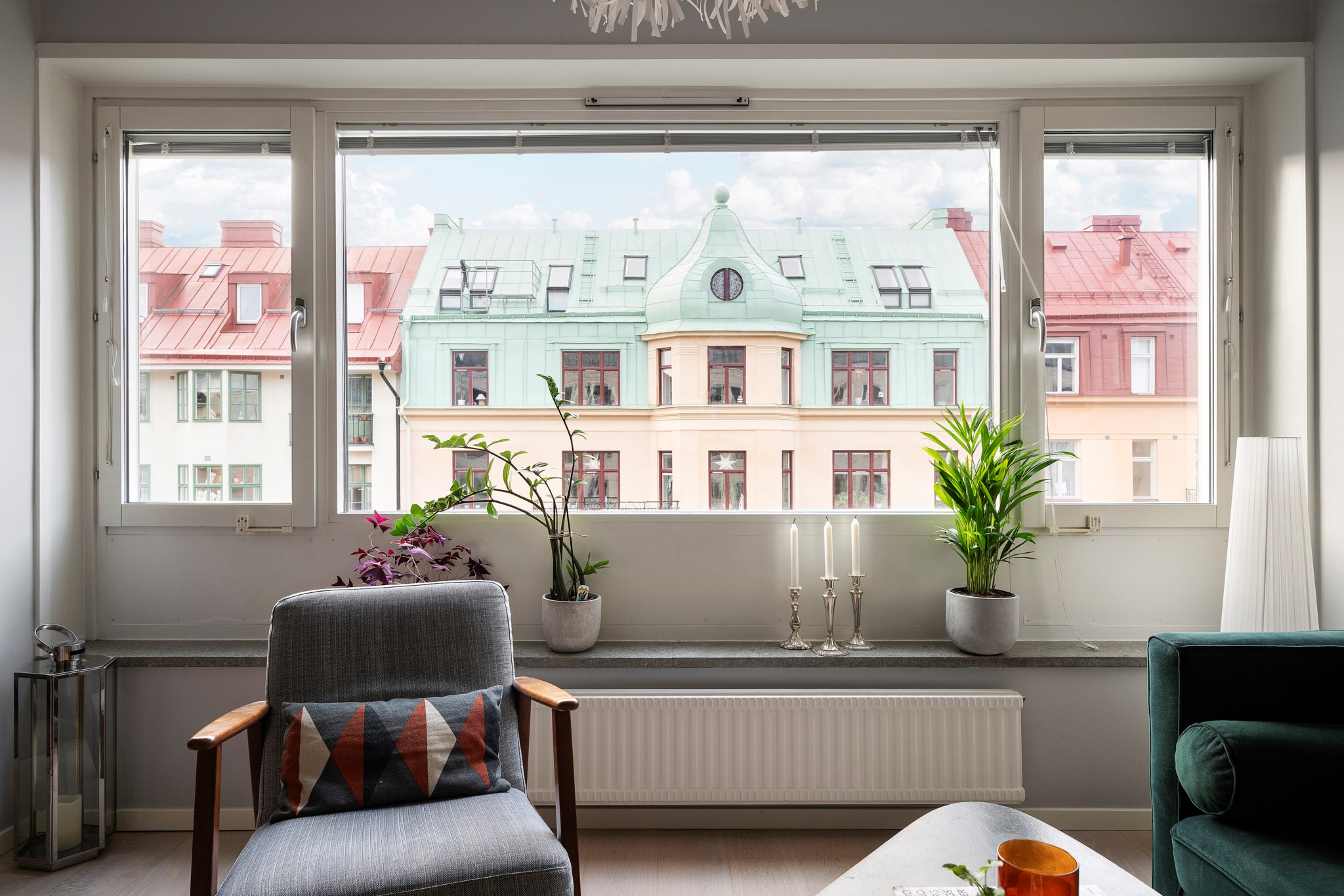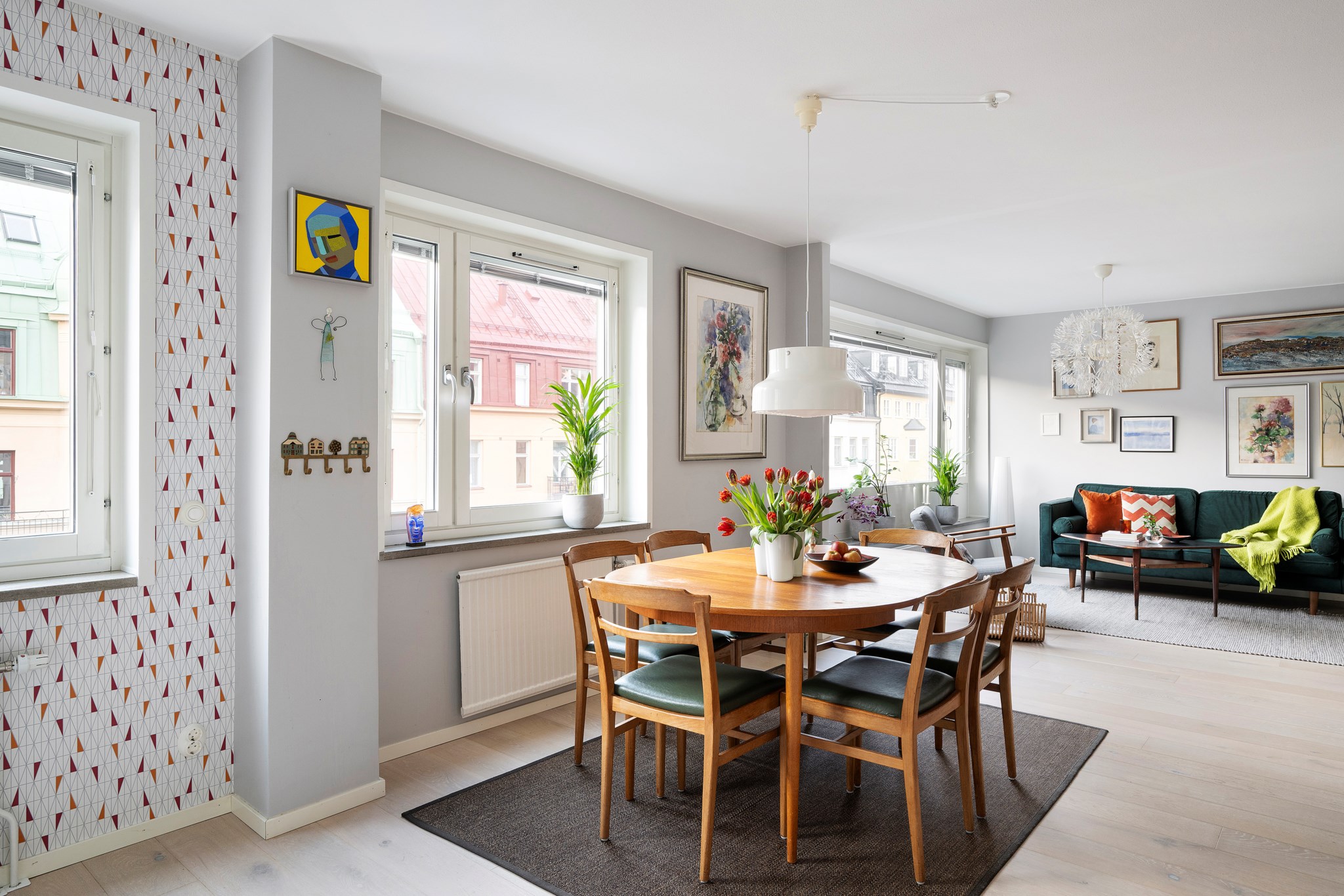 Ett luftigt och harmoniskt vardagsrum med fantastiskt ljusinsläpp från breda fönsterpartier. Här ryms både soffgrupp och ytterligare möblering utan att tappa känslan av rymd. Utsikten mot de pastellfärgade husen längs Gästrikegatan skapar en poetisk fond i vardagen. Parkettgolv och ljusmålade väggar.