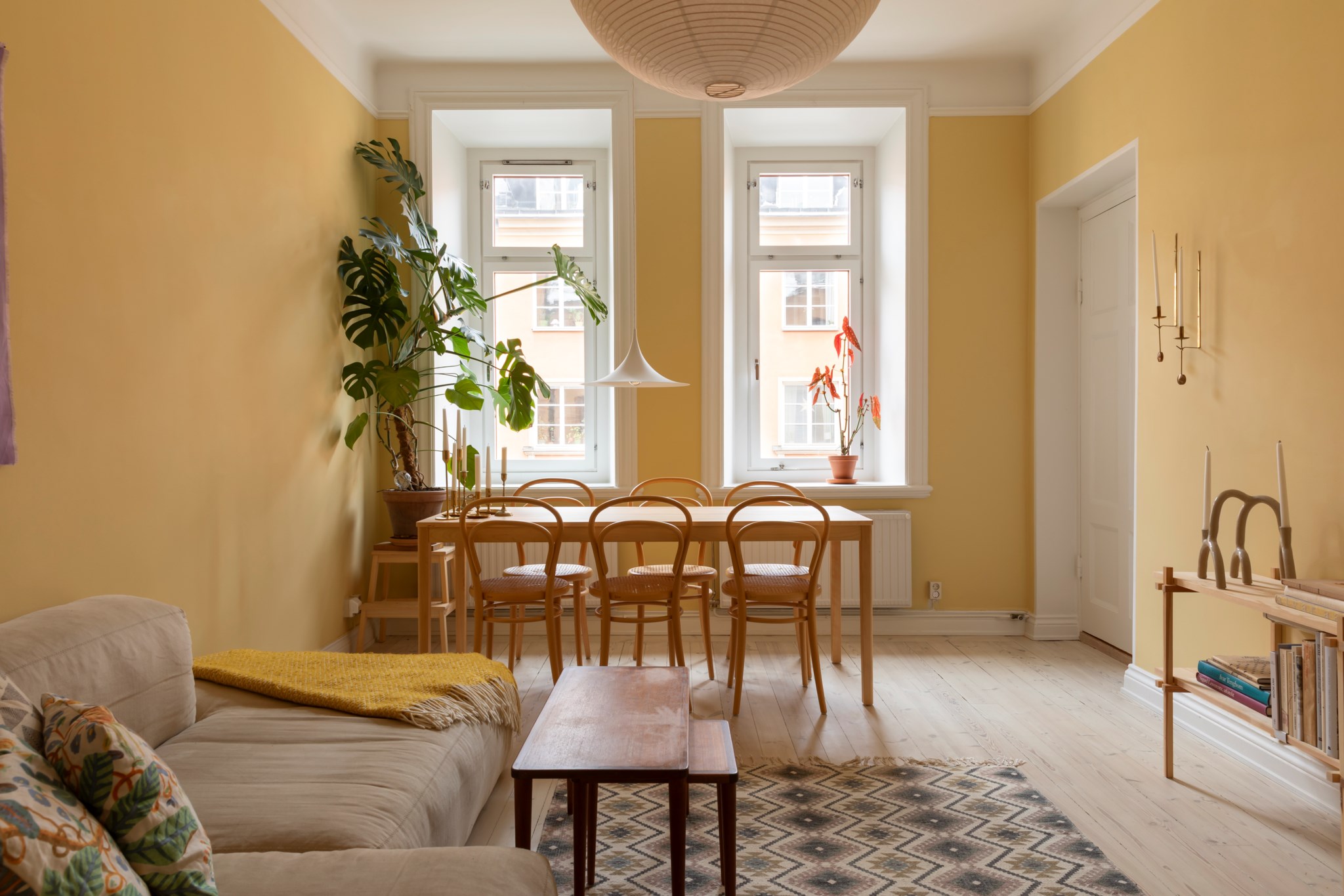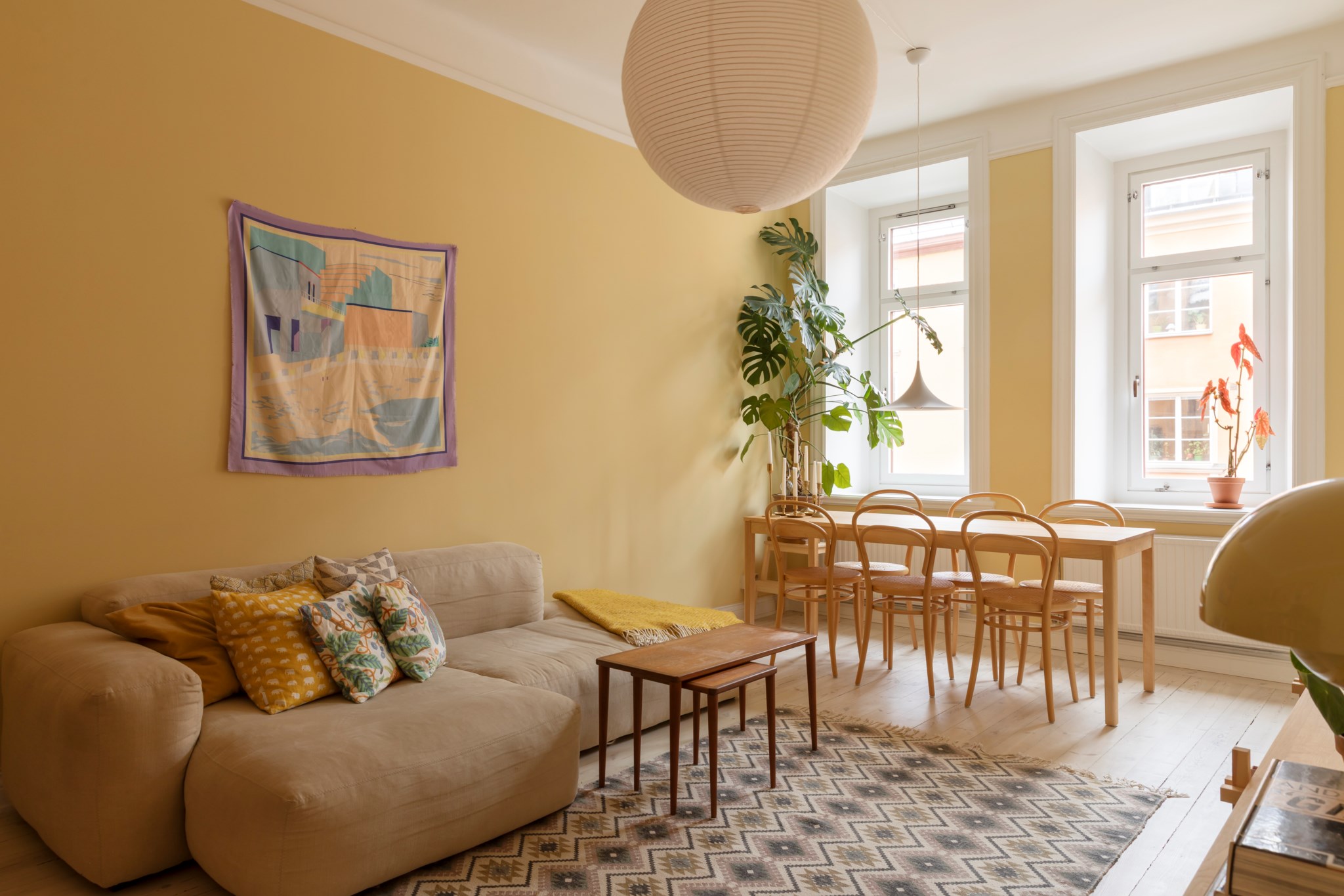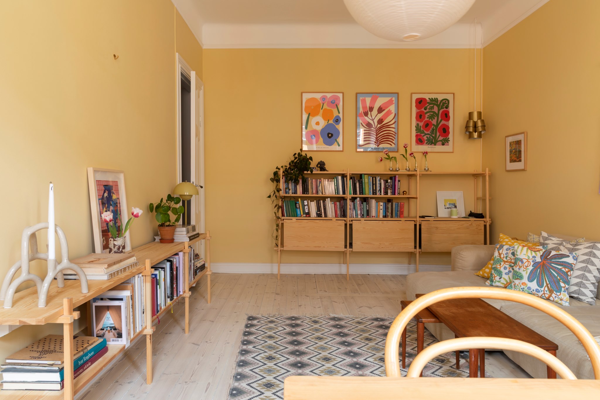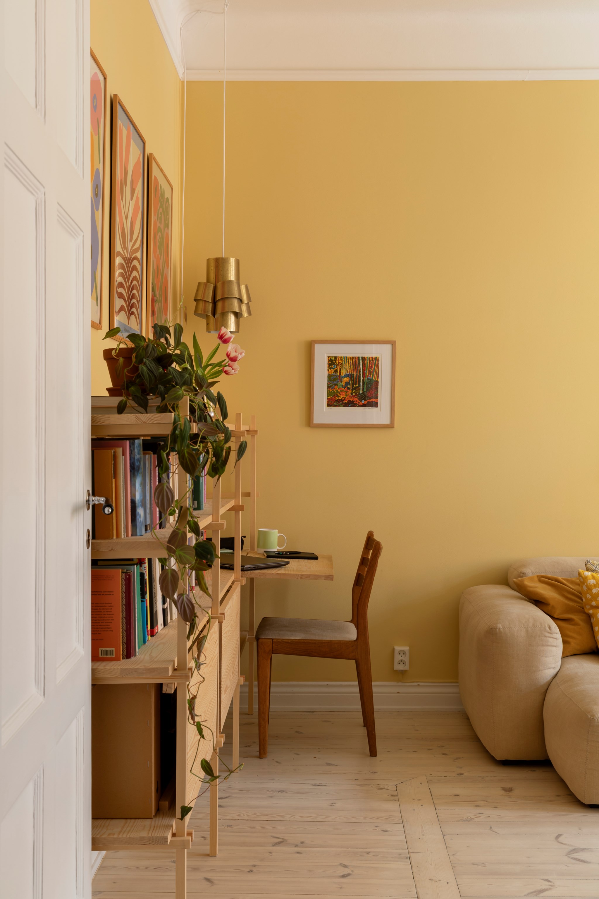 Med två fönster och ljusa trägolvet från byggåret rymmer vardagsrummet allt det behöver rymma. Här finns plats för ett större bord, soffmöbler, bokhylla, arbetshörna och tv. Väggarna är härligt ljusgula, de två fönstren släpper in ljus och takhöjden om 3 meter ger en härlig sekelskifteskänsla. Slår du dig ner i soffan ser du himlen ovan takåsarna!