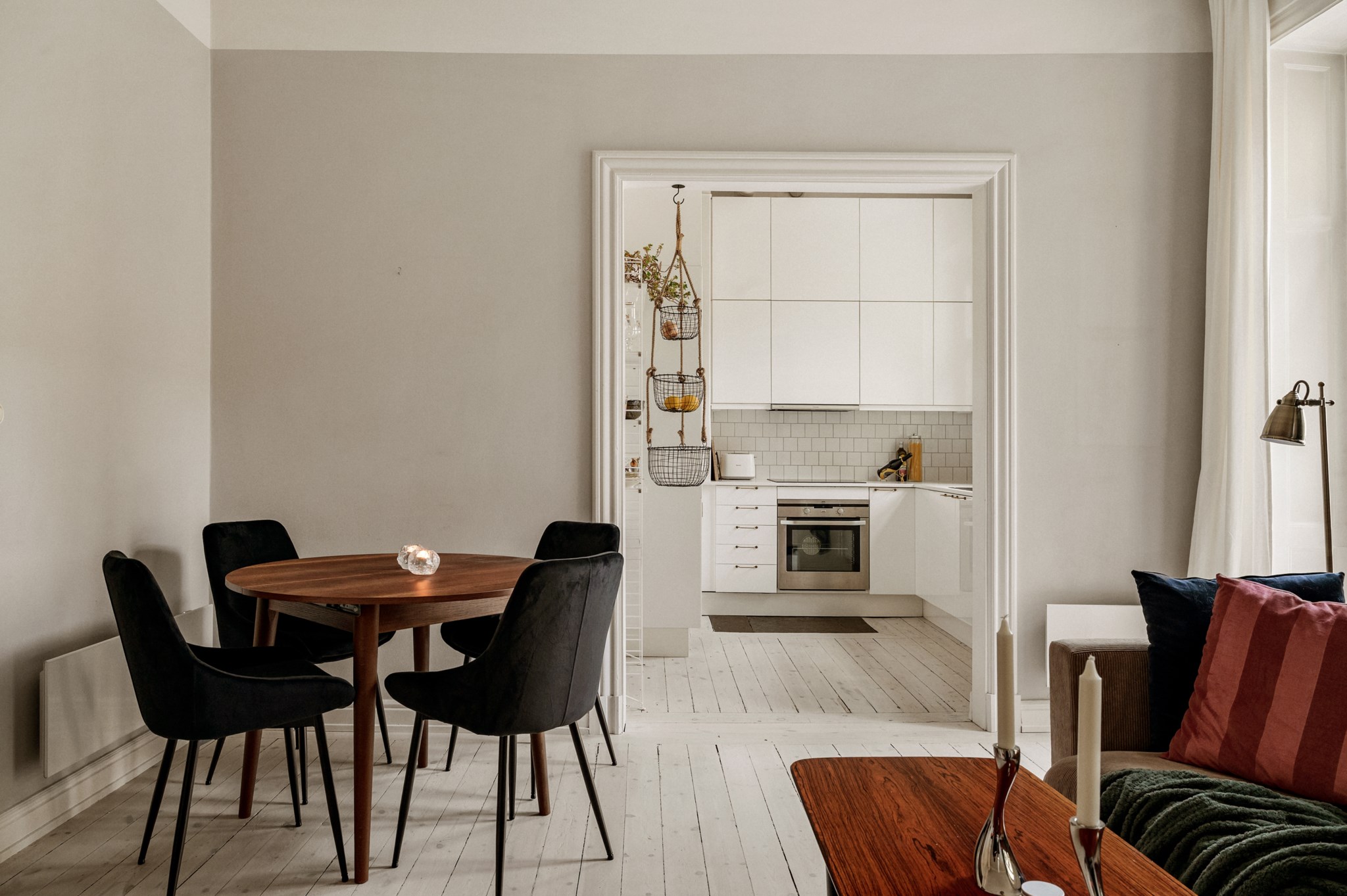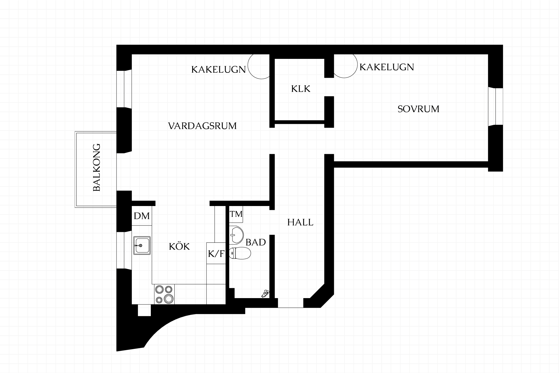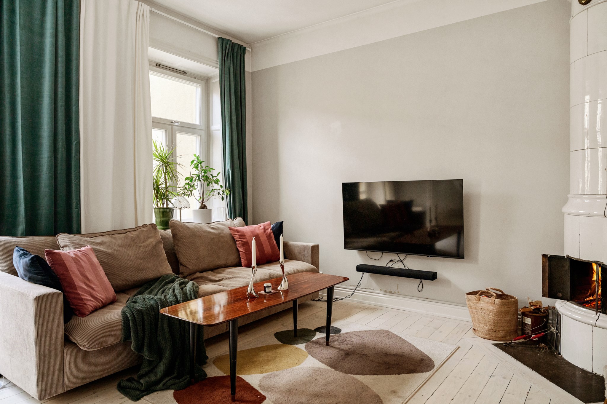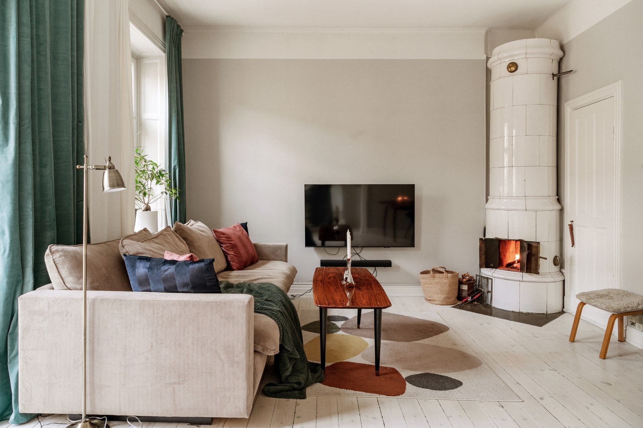 - Lättmöblerat vardagsrum med fungerande kakelugn, vitlaserade furugolv och utgång till balkongen.