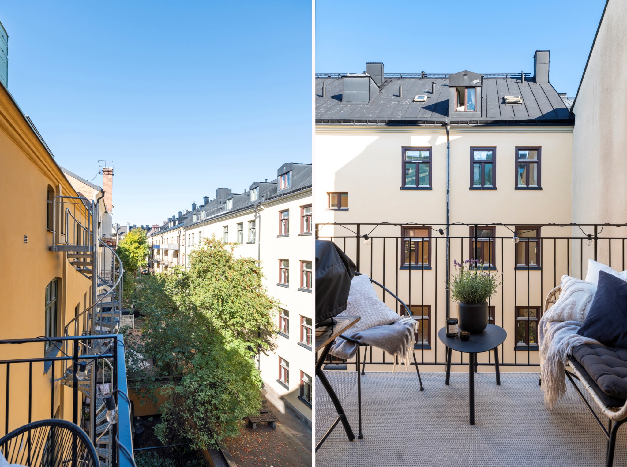 Fin gemensam innergård. Uteplats med sommarmöbler och grill.