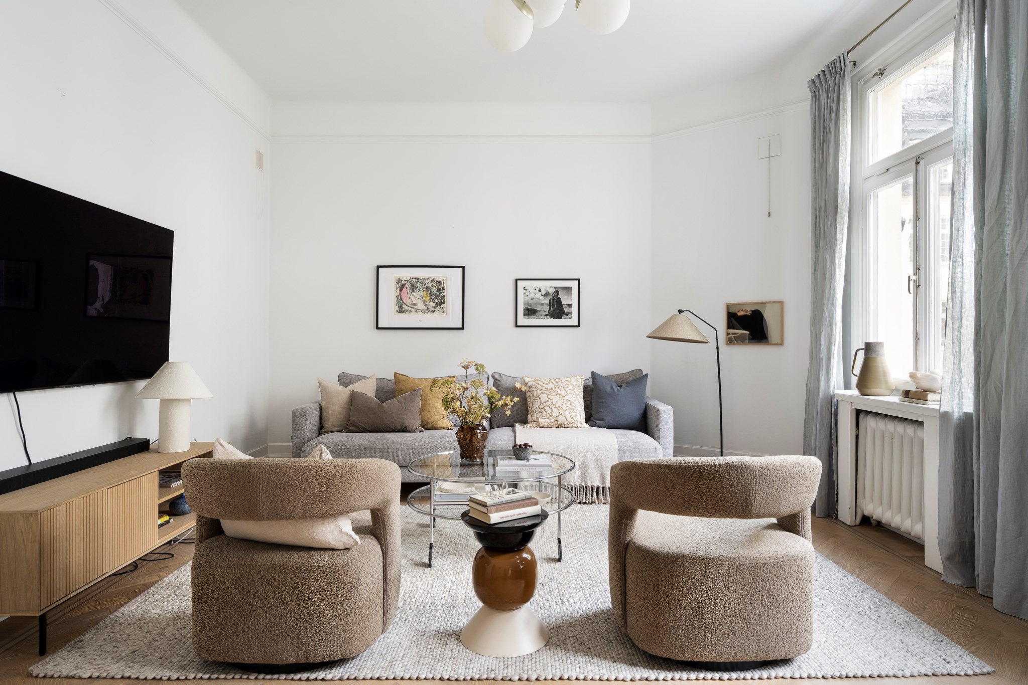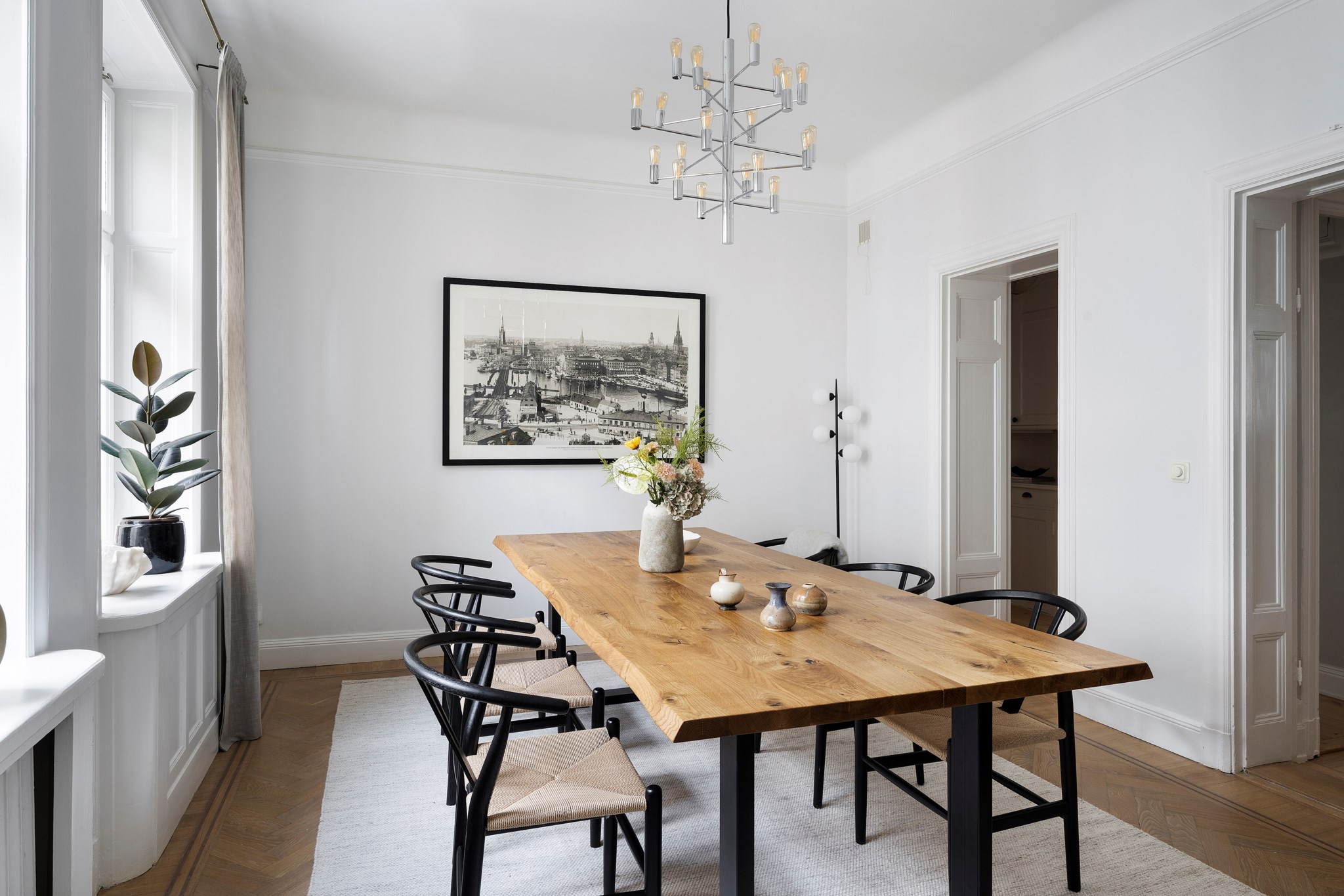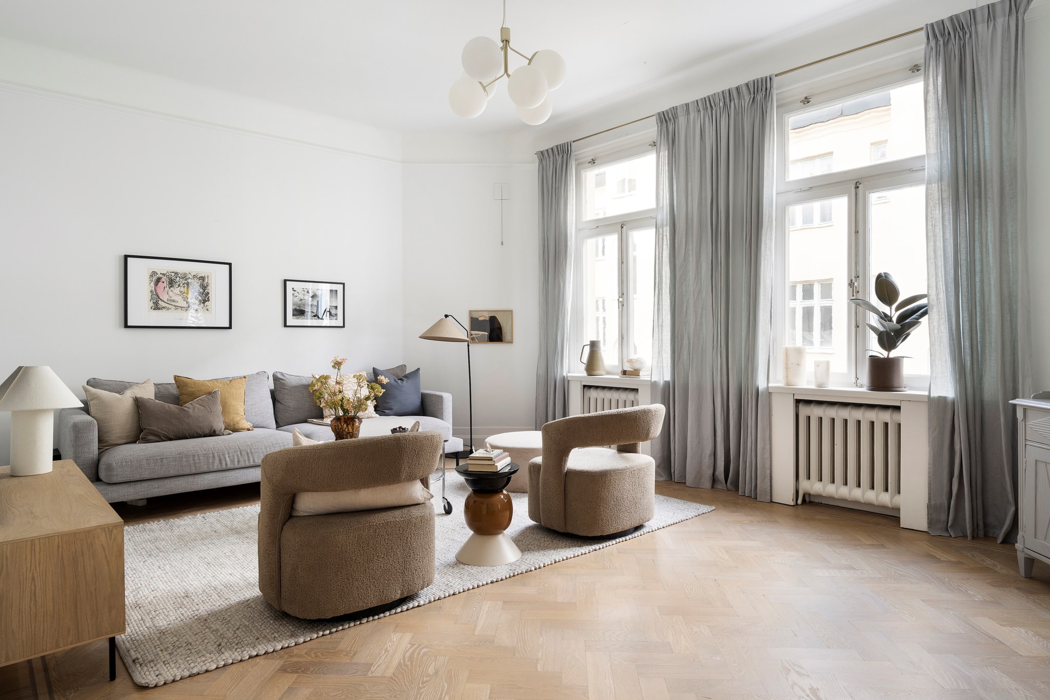 Ljusinsläpp från två väderstreck och rummen ligger i vacker fil, med trägolv, vägglister och stora fönster mot gårdarna. Här samsas sekelskiftets gedigna hantverk med nutidens bekvämligheter – som platsbyggt kök, diskmaskin och tvättmaskin. Ett hem som känns varmt, tidlöst och på samma gång innerligt personligt.