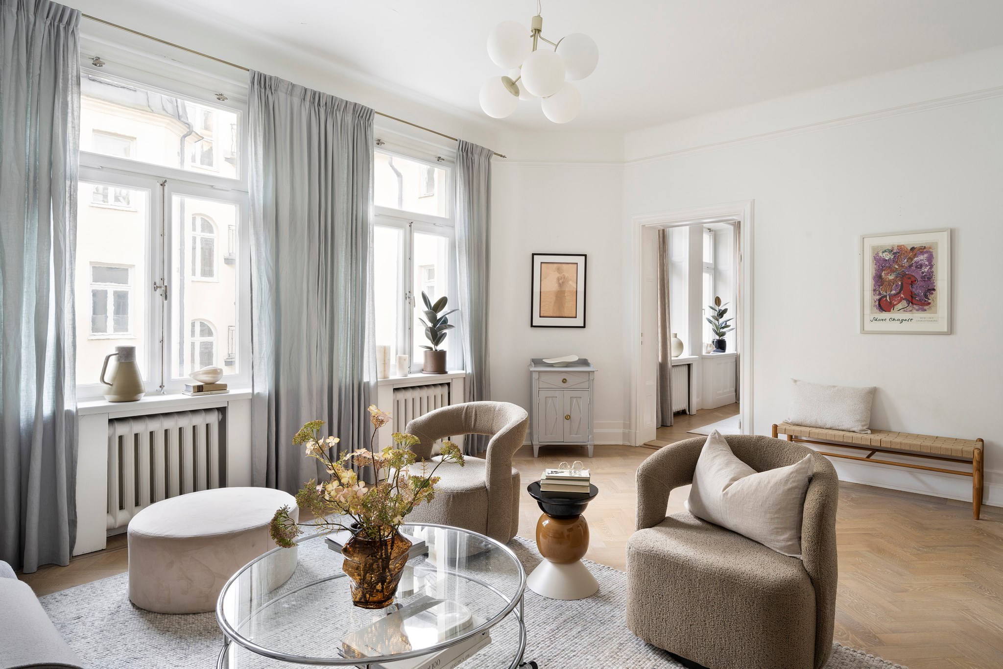 Generöst vardagsrum med vacker fiskbensparkett, ljusa väggar och dubbla fönster i söderläge mot gården. Här ryms både soffgrupp och större sällskapsdel. Den höga takhöjden, tidstypiska snickerierna och de eleganta radiatorerna skapar en lugn och representativ atmosfär.