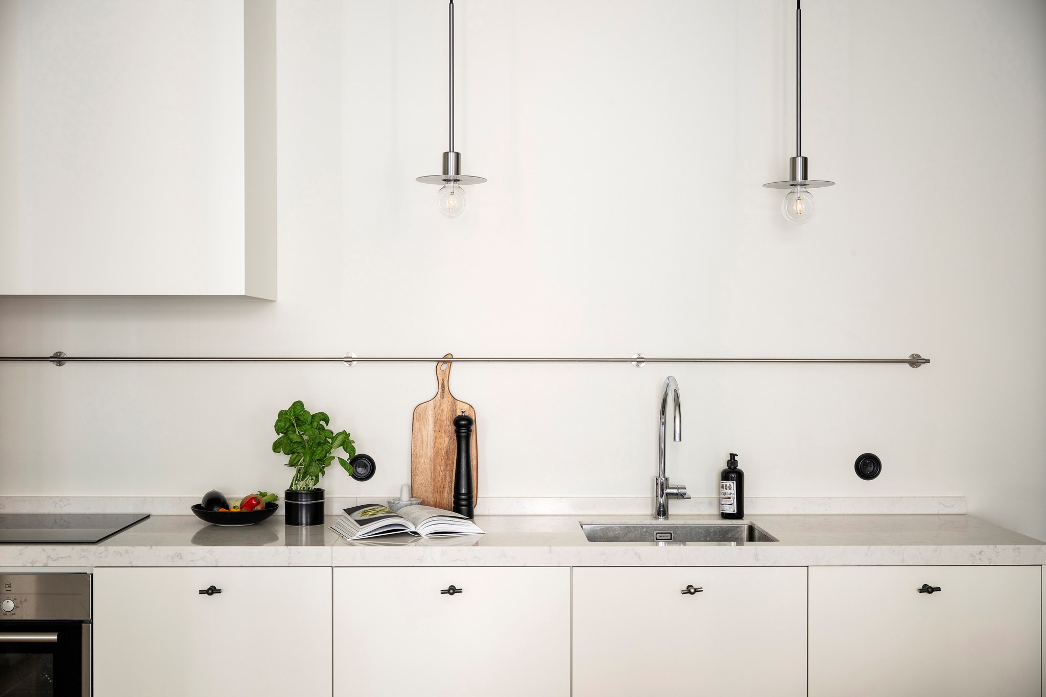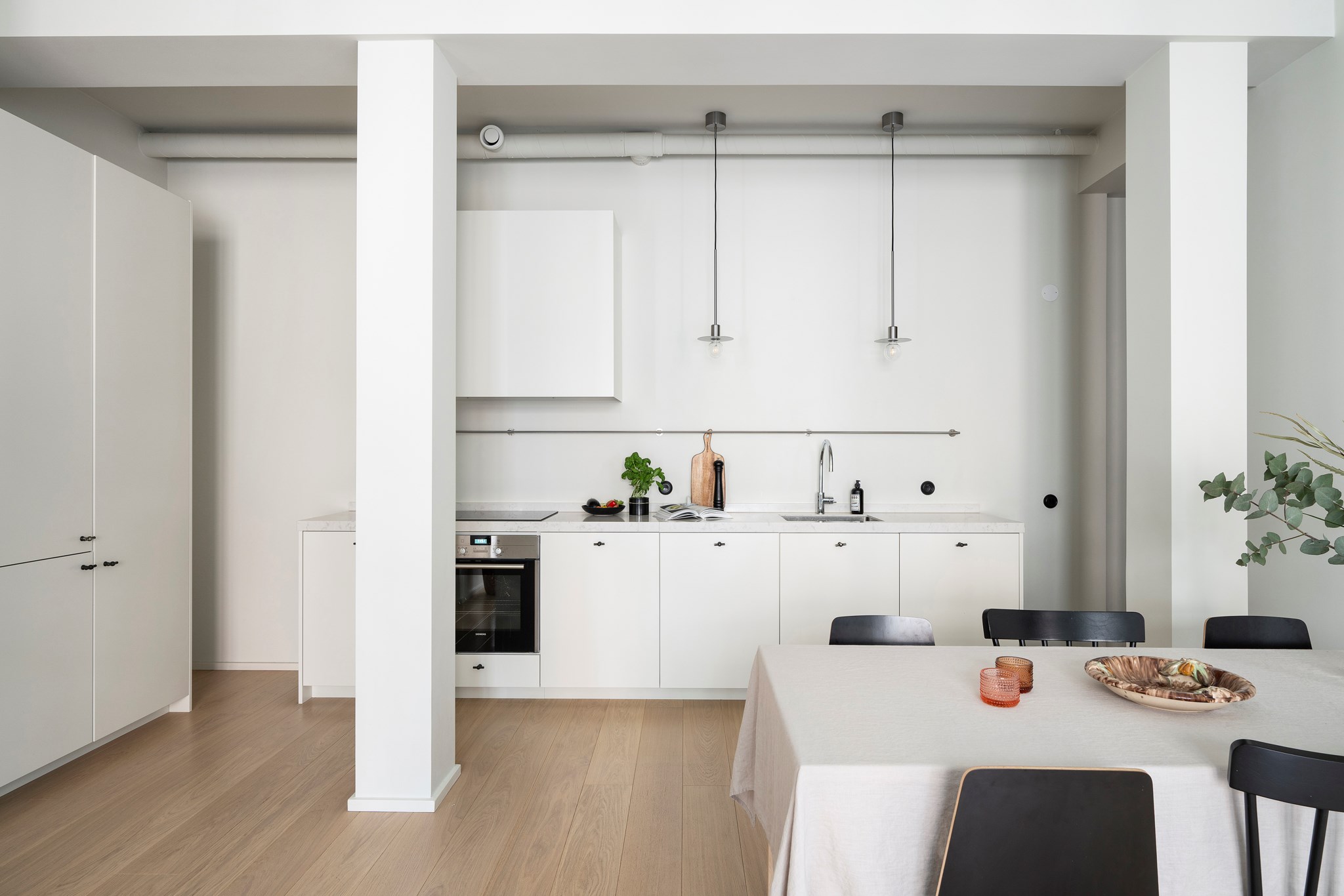 Stilrent och funktionellt kök i öppen planlösning mot vardagsrummet. Ljus skåpsinredning med bänkskiva i matchande ton och genomtänkt arbetsyta. Den maskinella utrustningen består av induktionshäll, ugn, fläkt, integrerad kyl/frys samt diskmaskin. Gott om förvaring i både under- och högskåp. Köket smälter fint in i helheten utan att dominera.