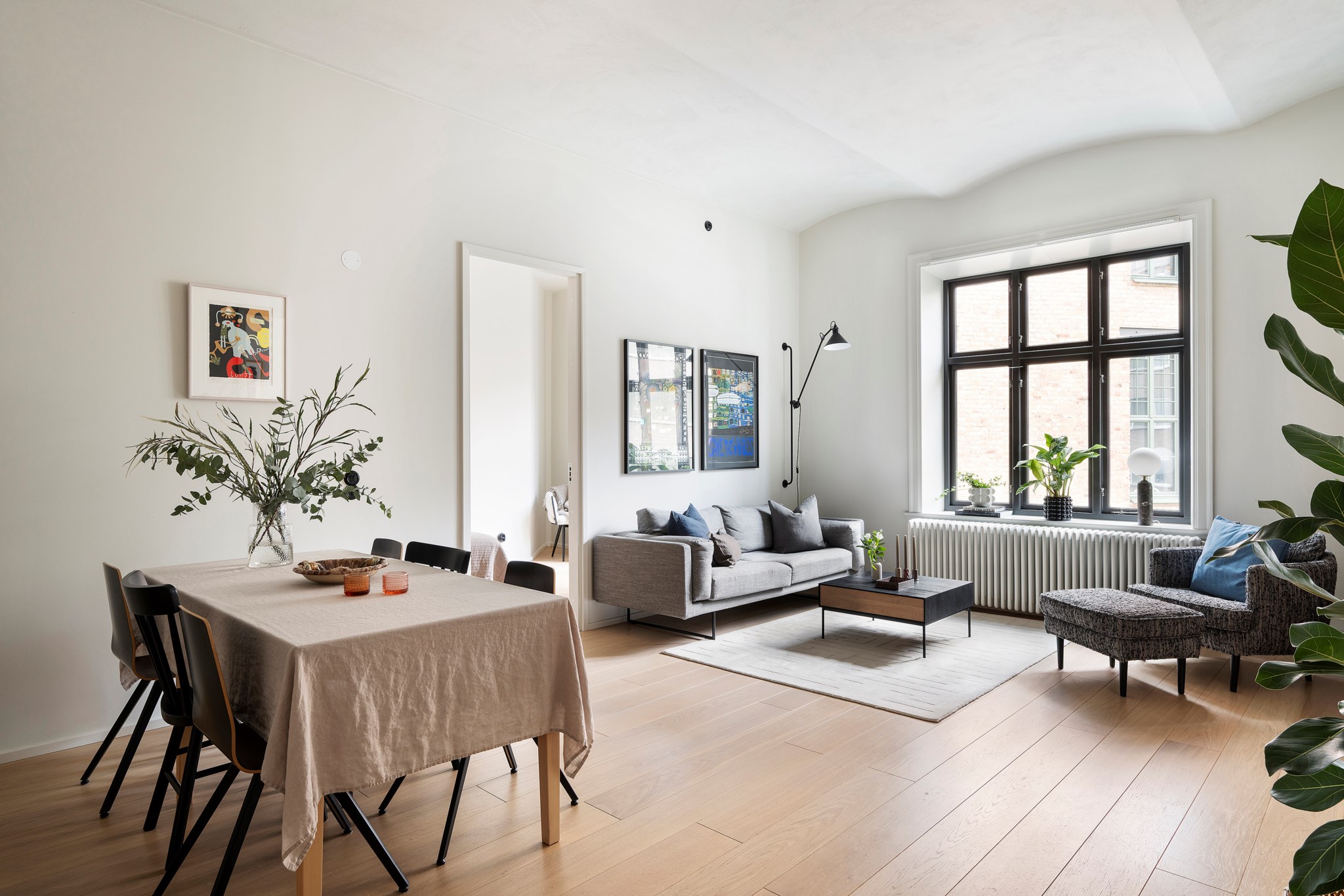 Generöst sällskapsrum med härlig rymd tack vare takhöjden. Rummet möbleras enkelt med både större soffgrupp och matplats för 6–8 personer. De stora fönsterpartierna med mörka ramar ger karaktär och vetter mot den lugna gården, vilket förstärker känslan av avskildhet.