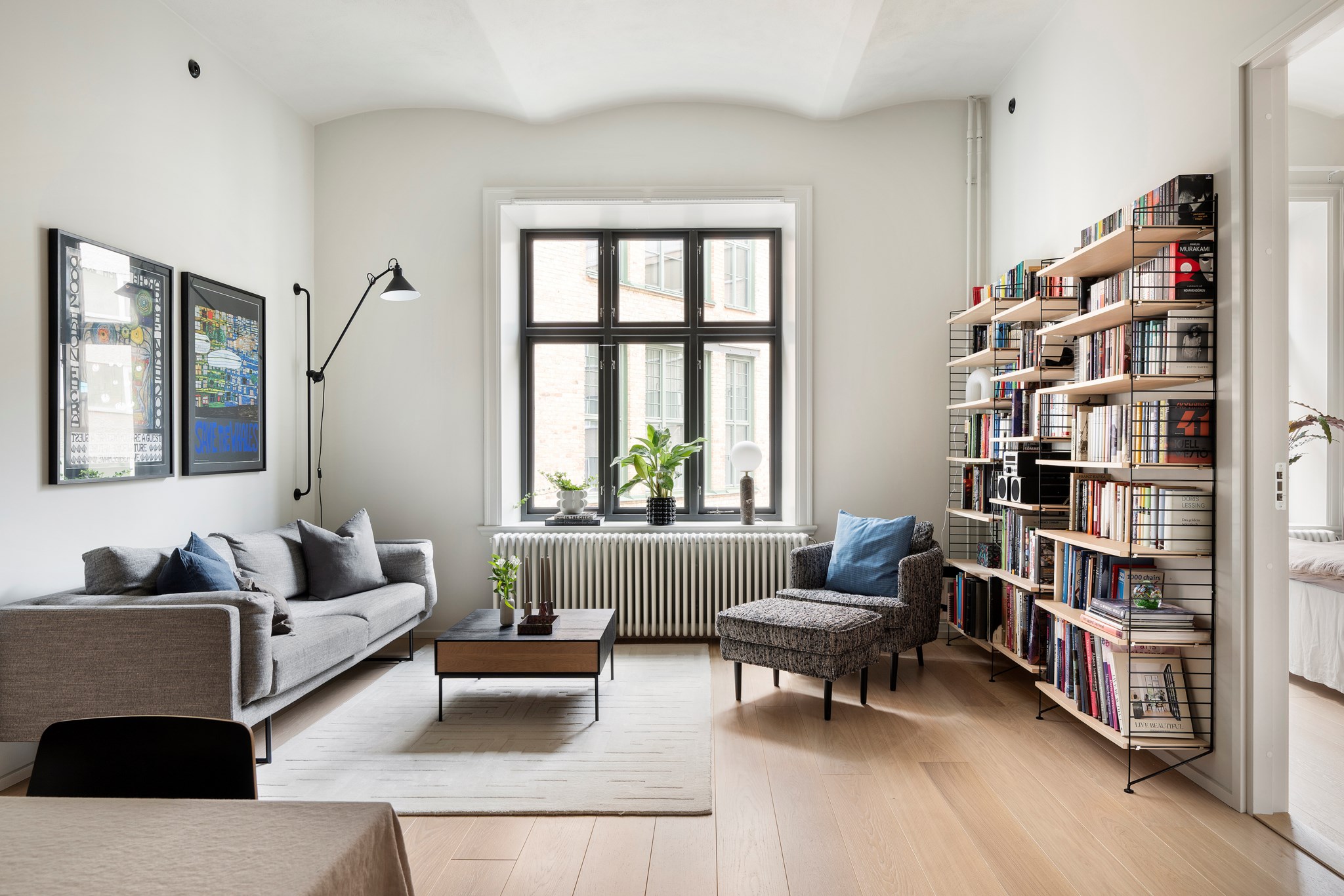 Alla fönster vetter mot gård, helt befriat från trafikljud, vilket skapar en ovanlig stillhet mitt på Kungsholmen. Takhöjden är generös (ca 3,3 meter) och ger rummen volym och karaktär, medan de mörka fönsterbågarna och den dämpade färgskalan förstärker den industriella känslan. Ljuset är mjukare än flödande – snarare ombonat än bländande – och bidrar till bostadens rofyllda uttryck.