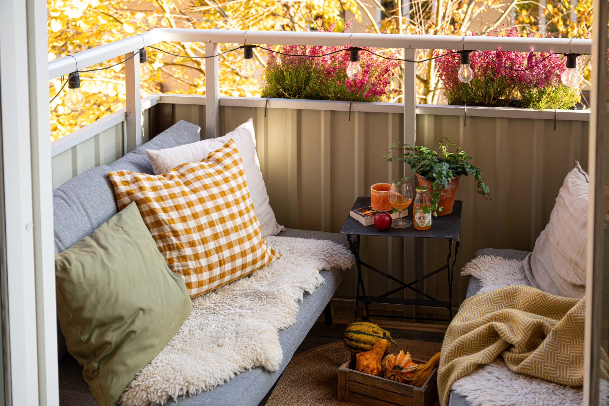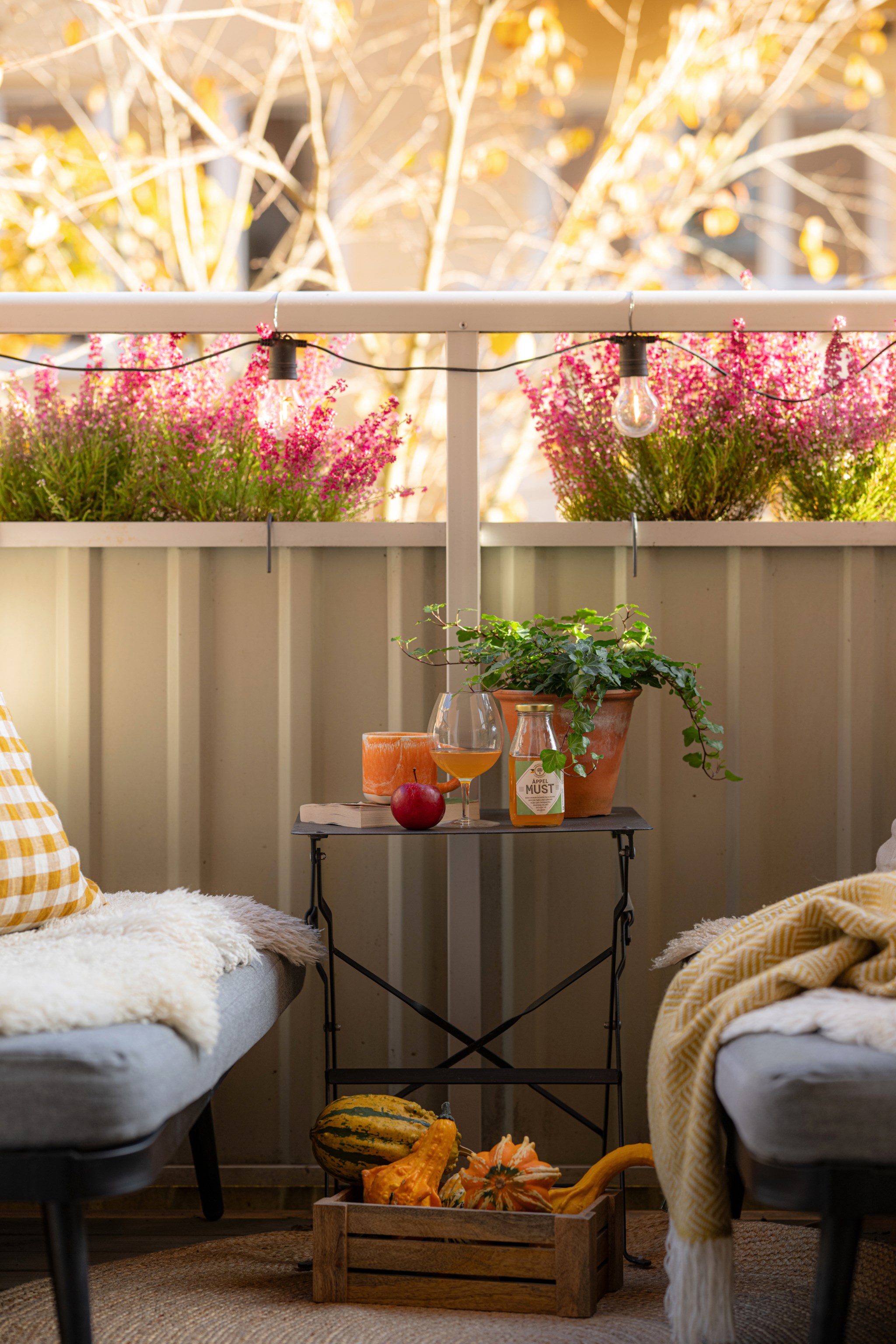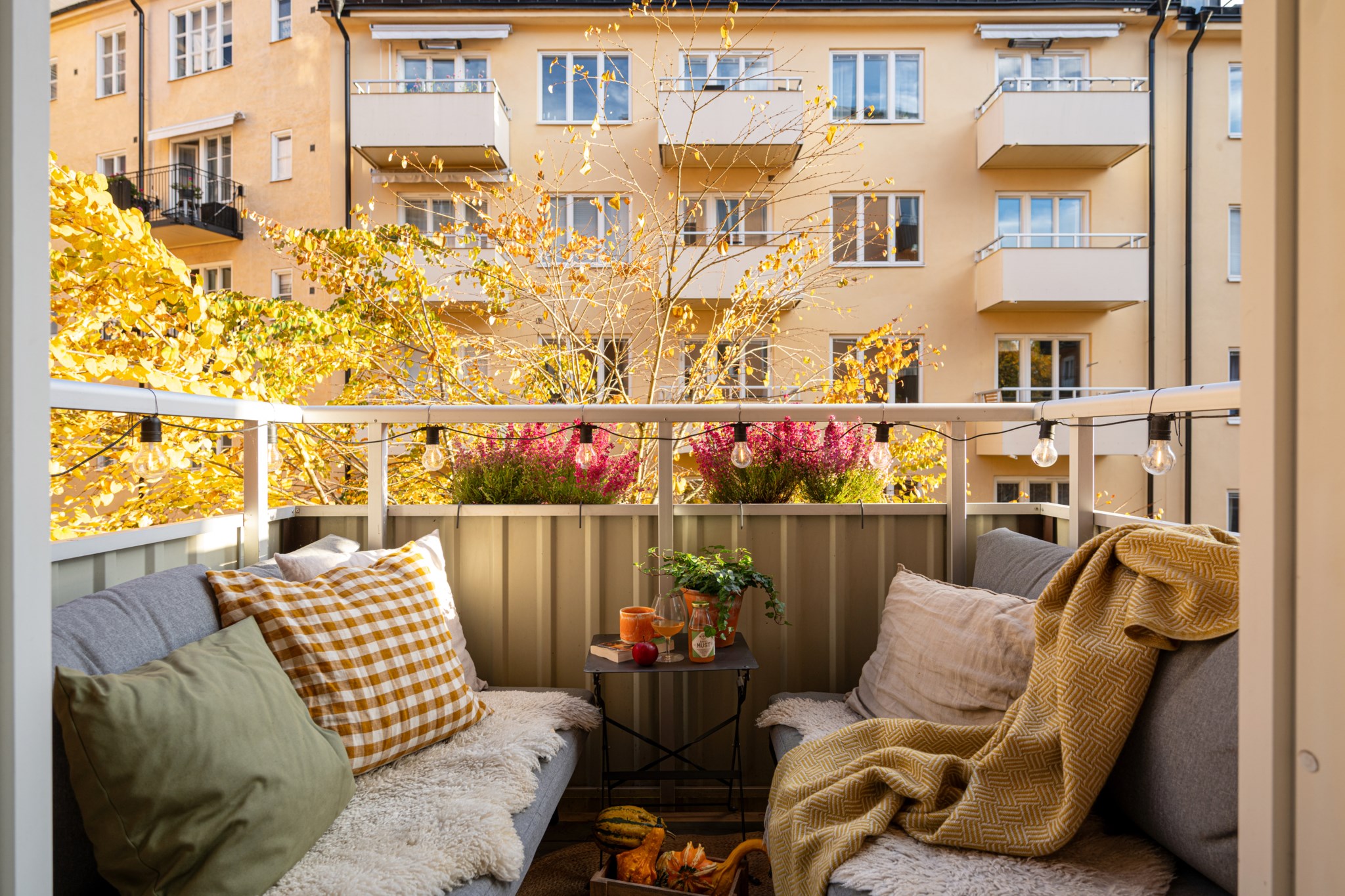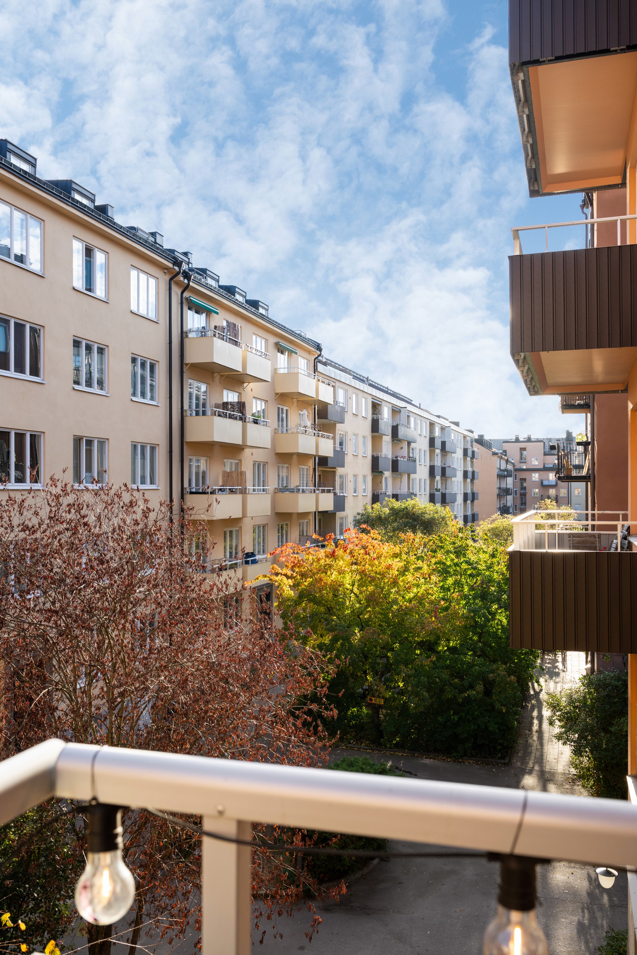 Balkong i sydost med utsikt över den lummiga innergården och ett vackert träd strax utanför – en plats att njuta av solen, kaffet och stillheten mitt i staden.