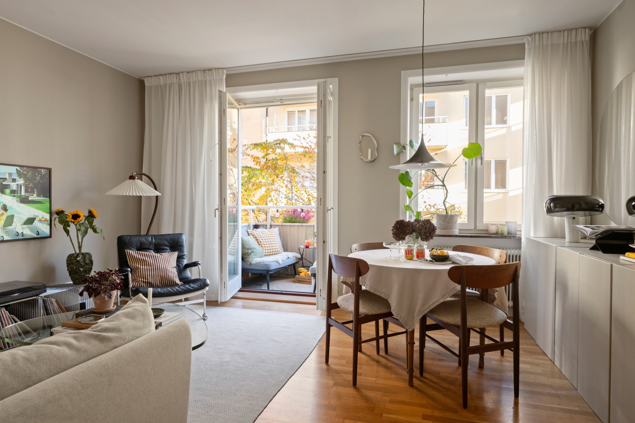 Ljust och luftigt vardagsrum med plats för både soffa och matbord. Det generösa ljusinsläppet och den fina takhöjden skapar en behaglig känsla av rymd. Härifrån nås balkongen som vetter mot gårdens grönska – en oas mitt på Södermalm.