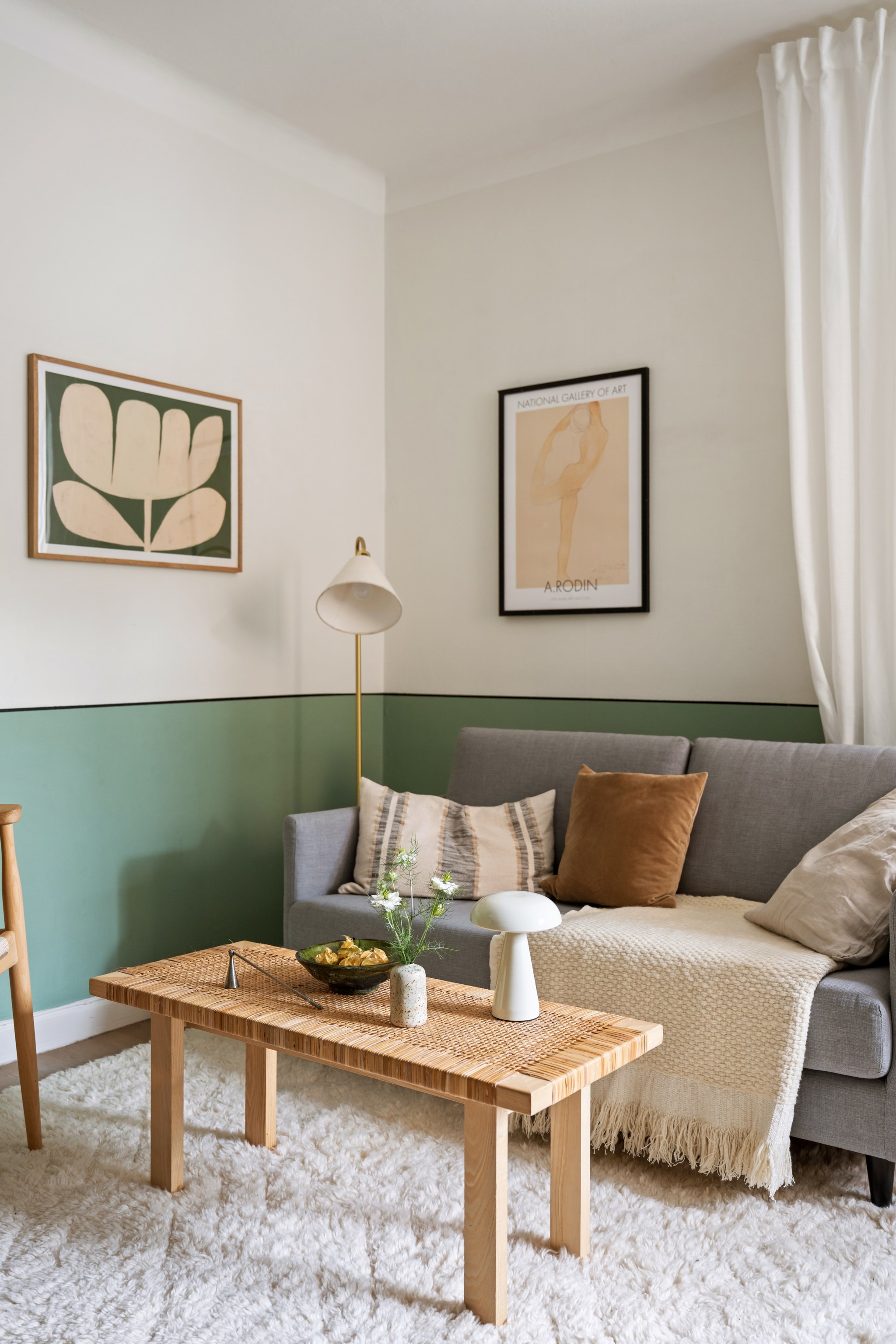 Från det ögonblick du kliver in möts du av ett luftigt vardagsrum med rikligt ljusinsläpp från fönster åt två håll och utsikt mot lummig grönska. Den stilrena fiskbensparketten ger karaktär och en ombonad känsla, medan golvsocklar och stenfönsterbänkar nyper åt den funktionalistiska stilen från byggåret. Det rymliga vardagsrummet erbjuder flexibel möblering – plats för både matsalsdel och soffhörna.