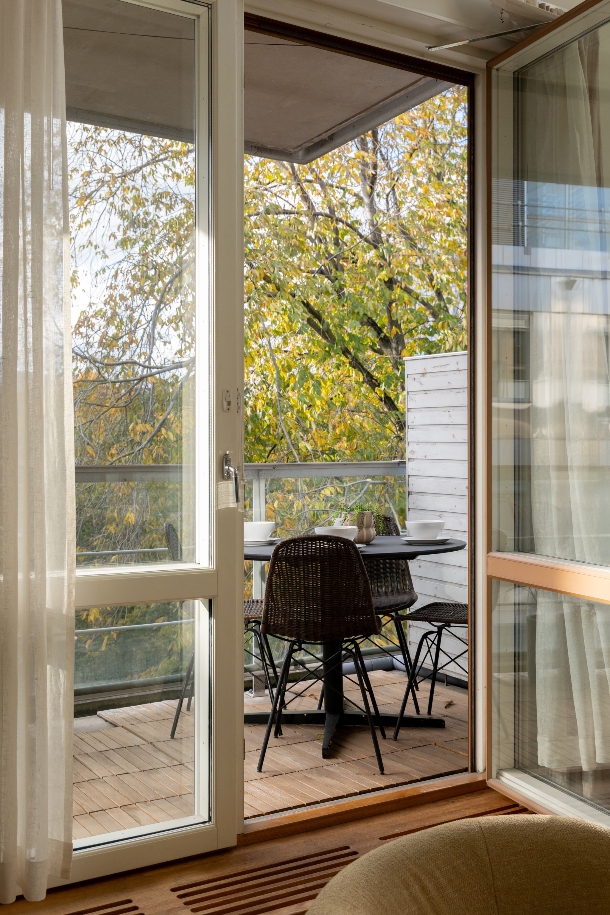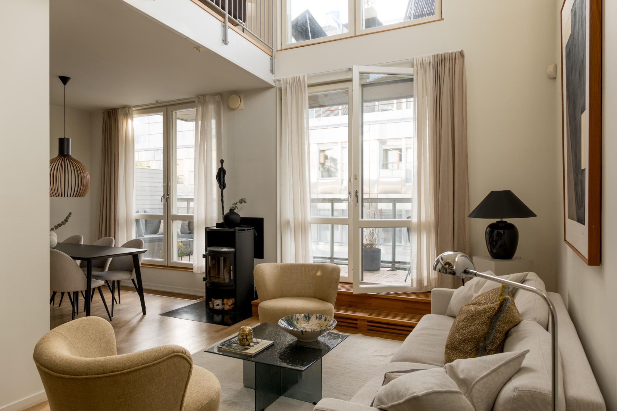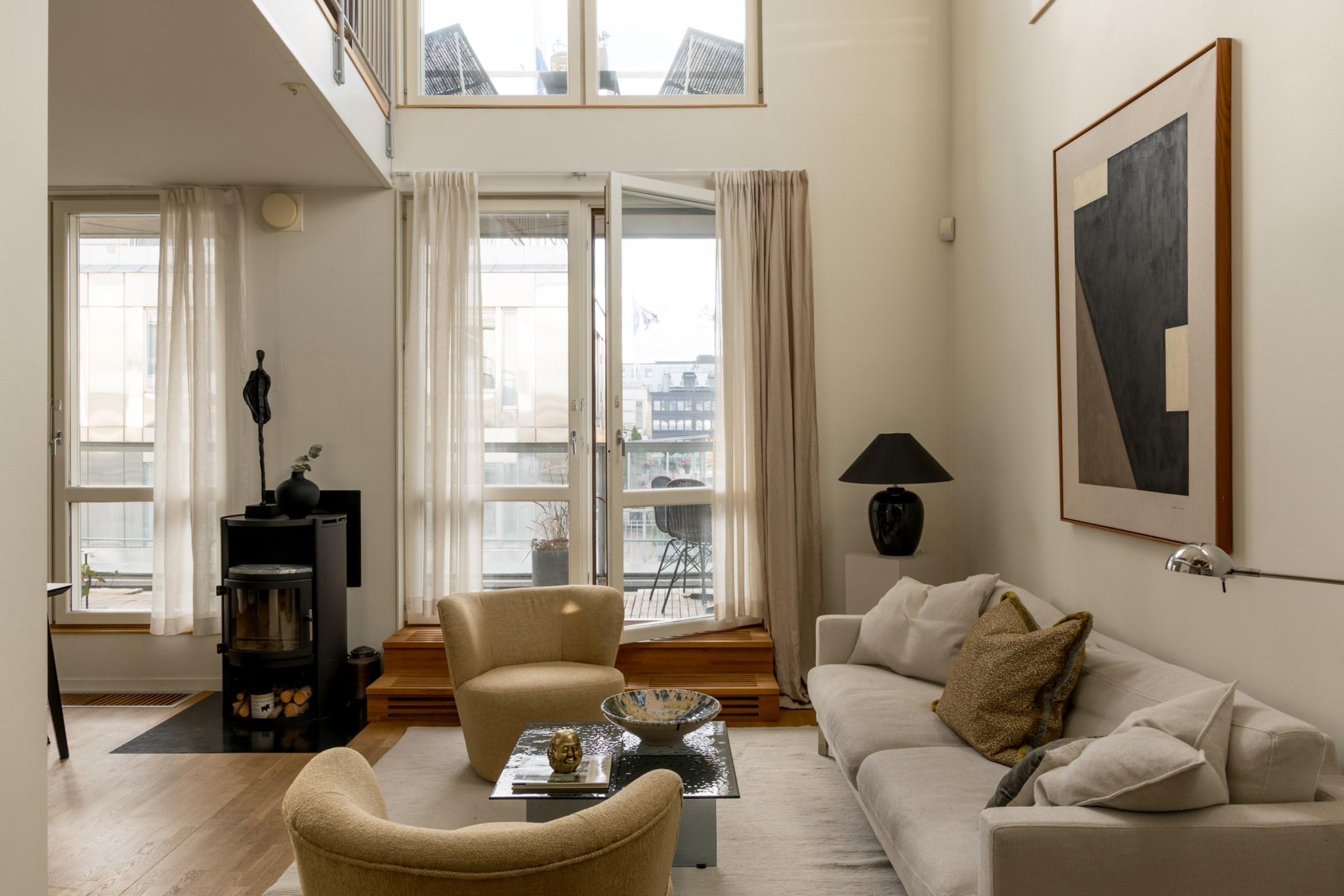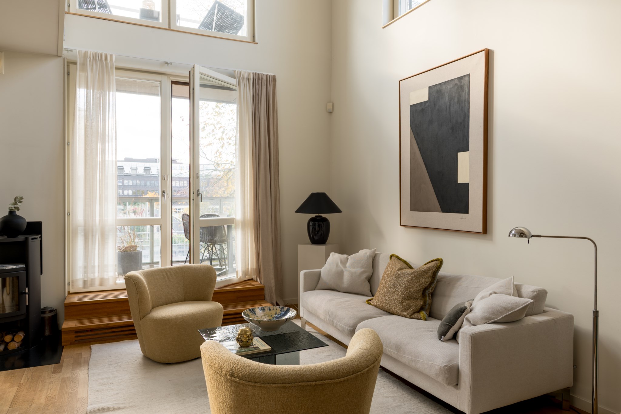 Våningen breder ut sig över husets två översta plan och har delvis öppen planlösning mellan våningsplanen vilket skapar en härlig känsla av rymd, ljus och volym. Tack vare det höga fria läget och fönster i tre väderstreck flödar dagsljuset in i varje rum.
