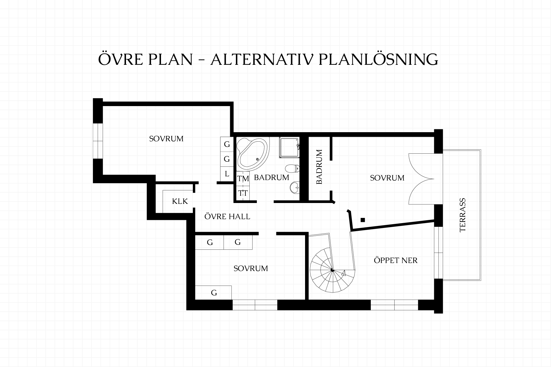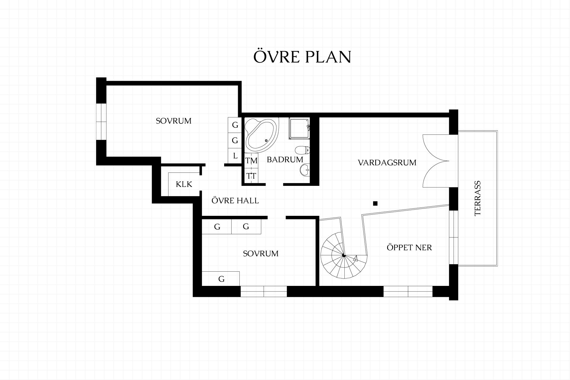 En trappa upp möts du av ett luftigt allrum med utgång till ytterligare en terrass och öppen vy ner mot entréplanet. Här finns även två rymliga sovrum varav det ena idag används som dressing room samt ett stort badrum med tvättmaskin och torktumlare.