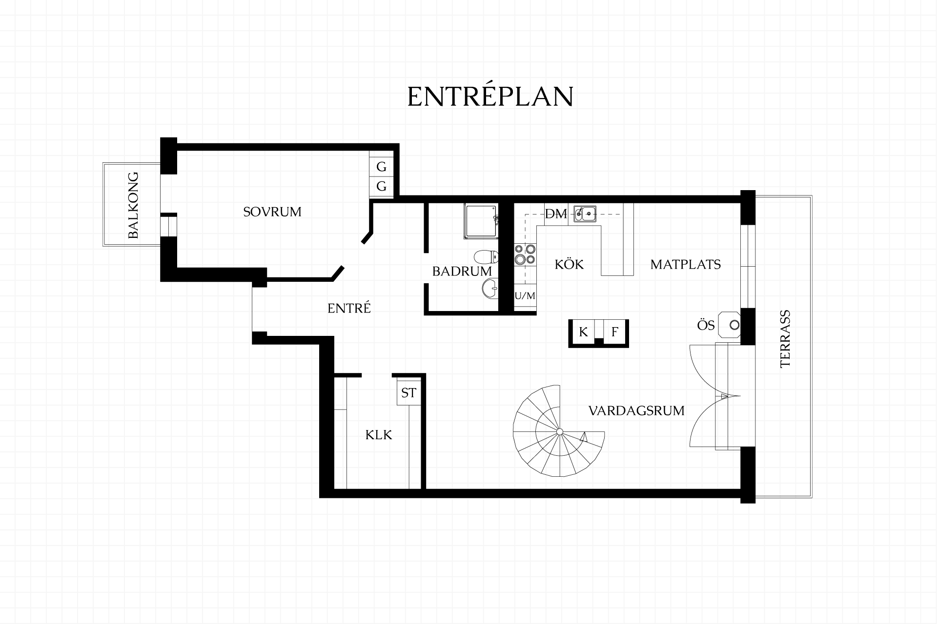 Entréplanet erbjuder en rymlig hall med gott om plats för avhängning och klädförvaring, ett stilrent kök med matplats i öppen planlösning mot vardagsrummet med braskamin och utgång till en solig terrass. Här finns även ett generöst sovrum med utgång till en balkong mot gården samt ett stort badrum.