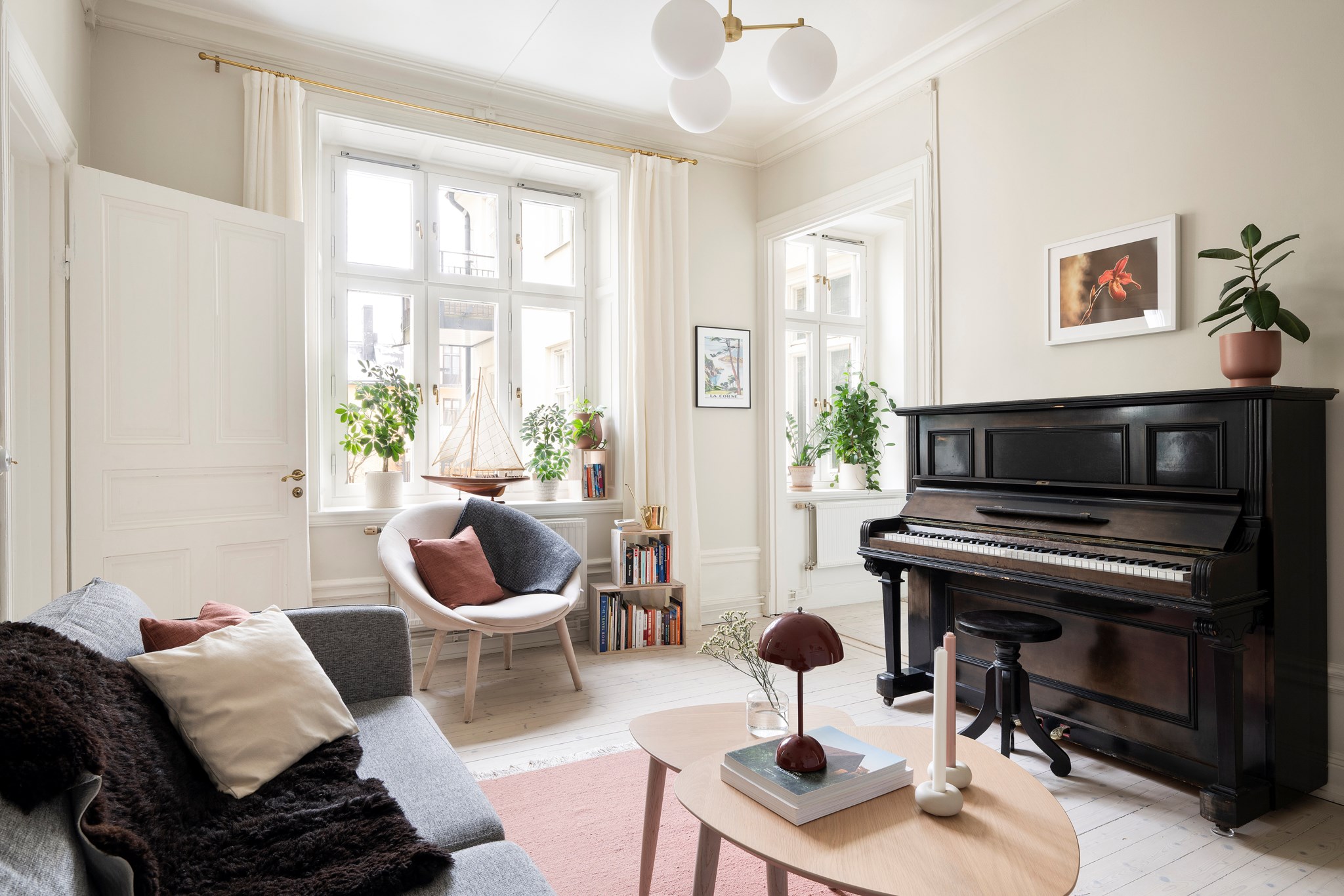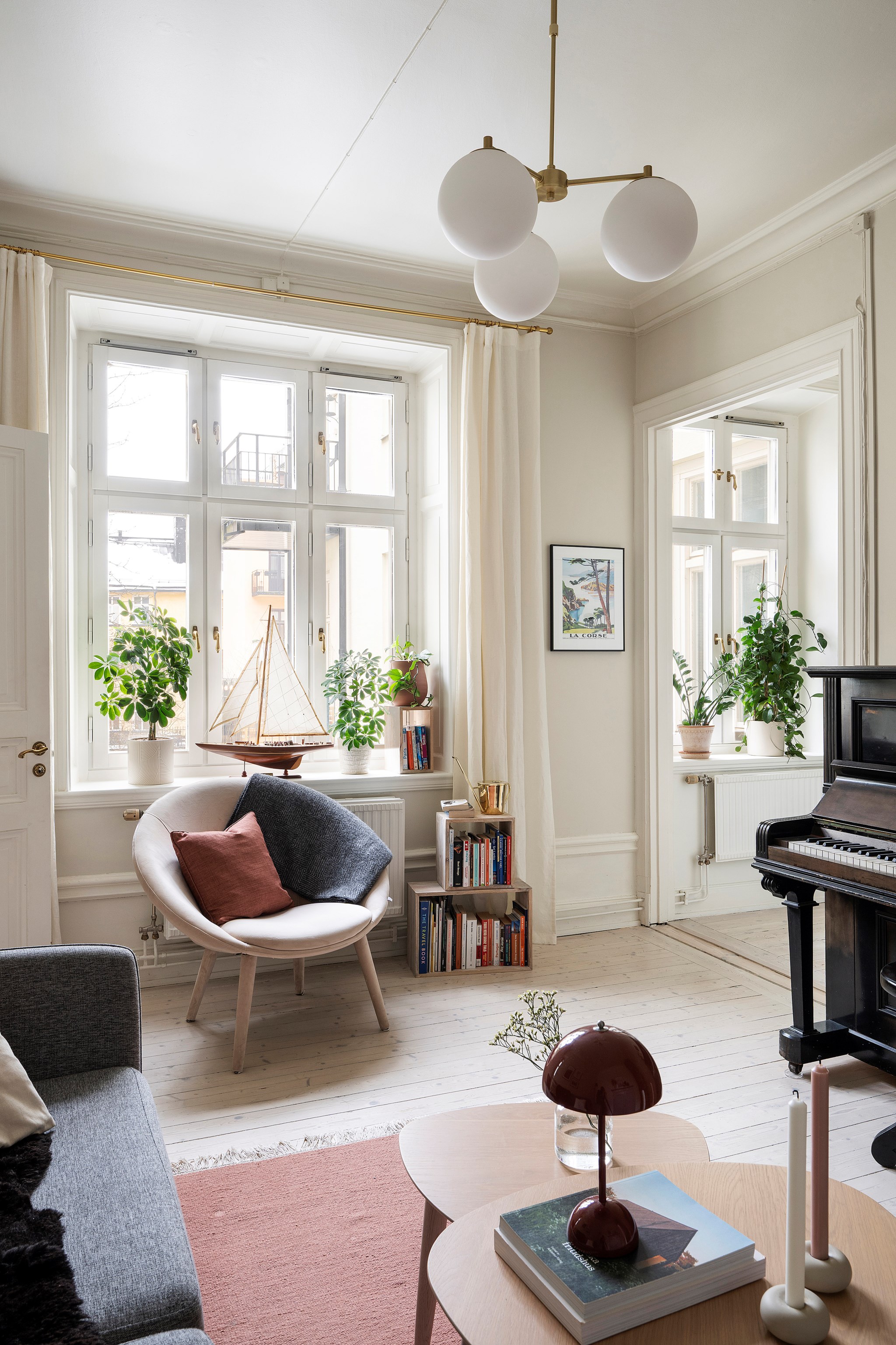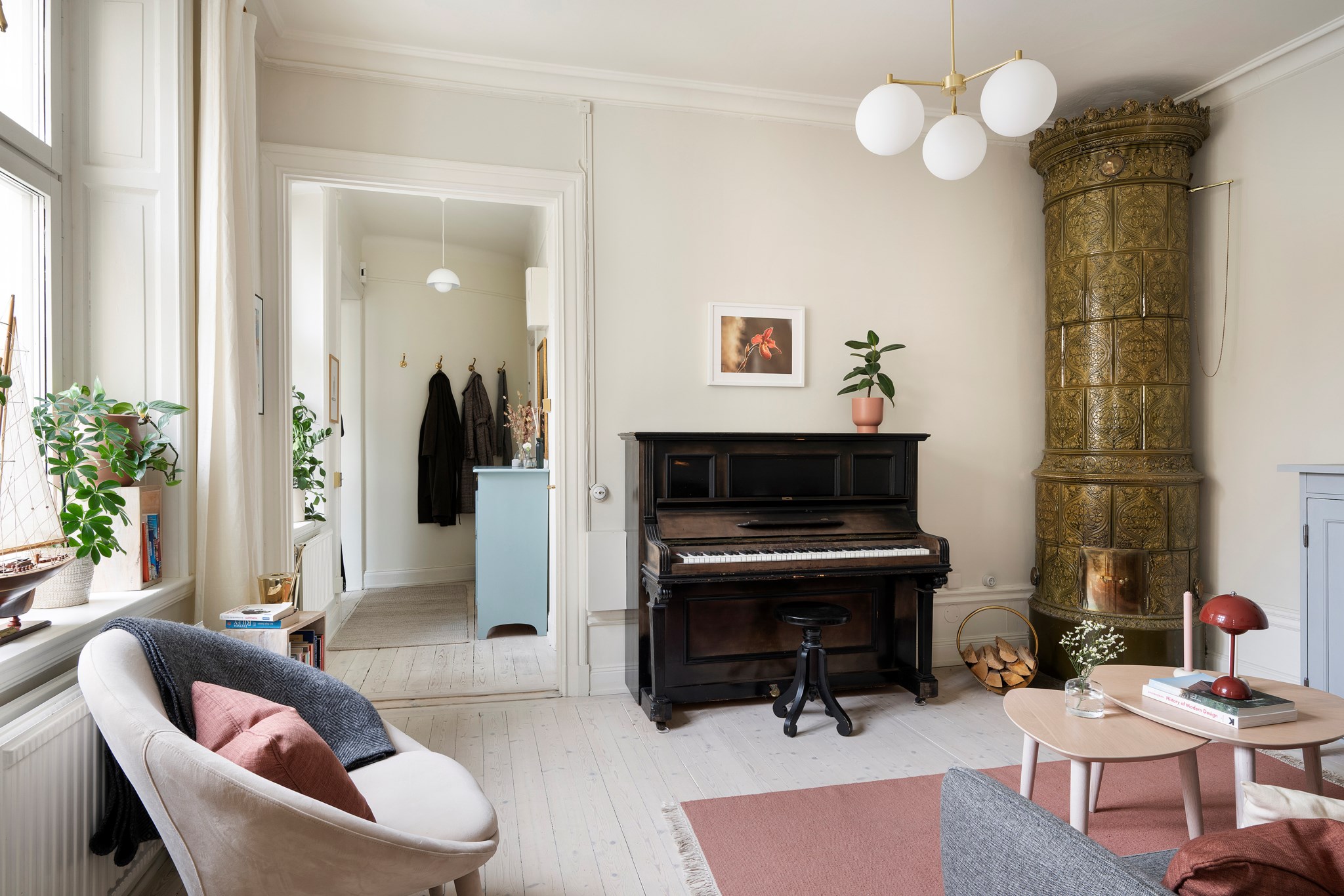 Bra hall med plats för avhängning. Här slås man direkt av ljuset och de många fönsterna. Charmig detalj med trapphusrundningen. Bostaden har genomgående högt till tak, speglade innerdörrar, vackra strömbrytare (det sitter i detaljerna!) och fina, väl omhändertagna ytskikt samt ljusa originalgolv. Tidsenlig säkerhetsdörr (pardörr).