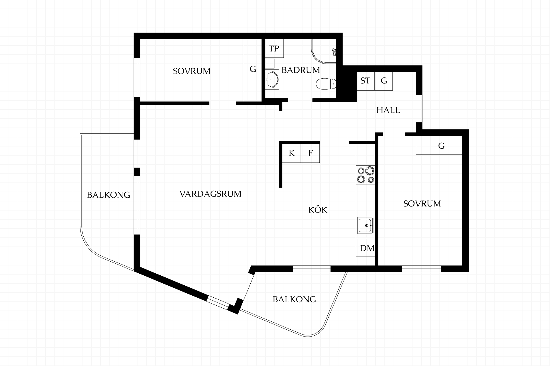 Lägenhetens utmärkta planlösning är optimalt disponerad och upplevs större. Här finns öppna sällskapsytor i stilrent, välutrustat kök och i vardagsrum med utgång till balkongerna. Två utmärkta sovrum, varav ett föräldrasovrum med plats för dubbelsäng och ett barn-, tonårs-, gäst- eller arbetsrum. Fräscht helkaklat badrum med tvättmaskin/torktumlare och hall med plats för ytterkläder och skor.