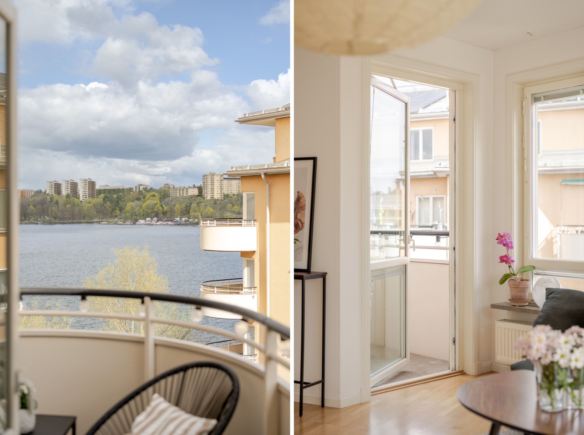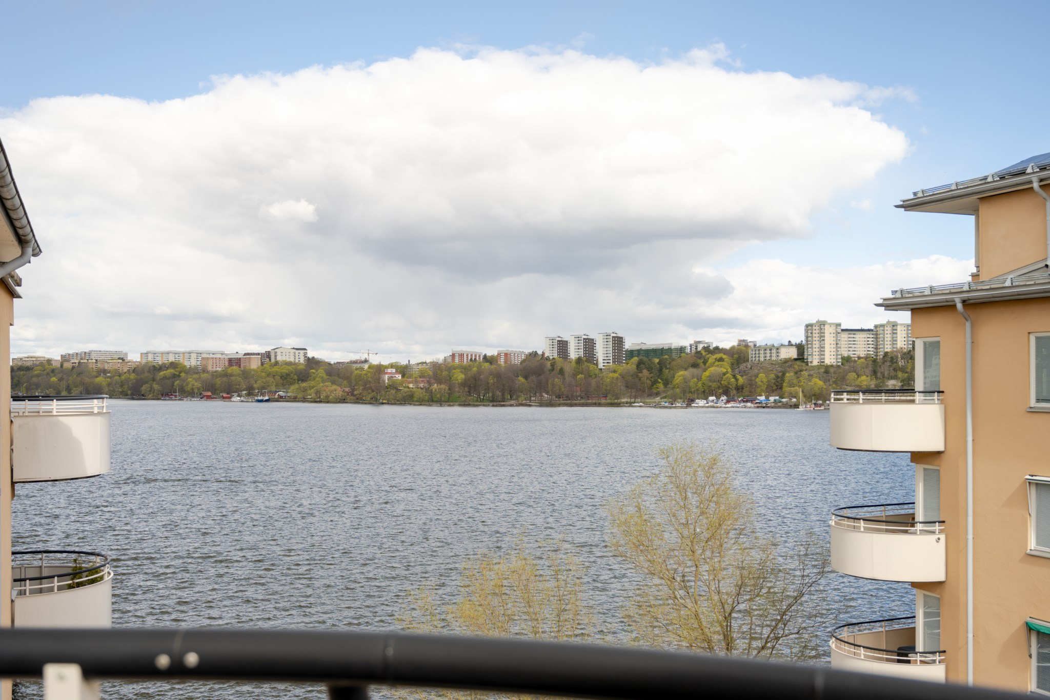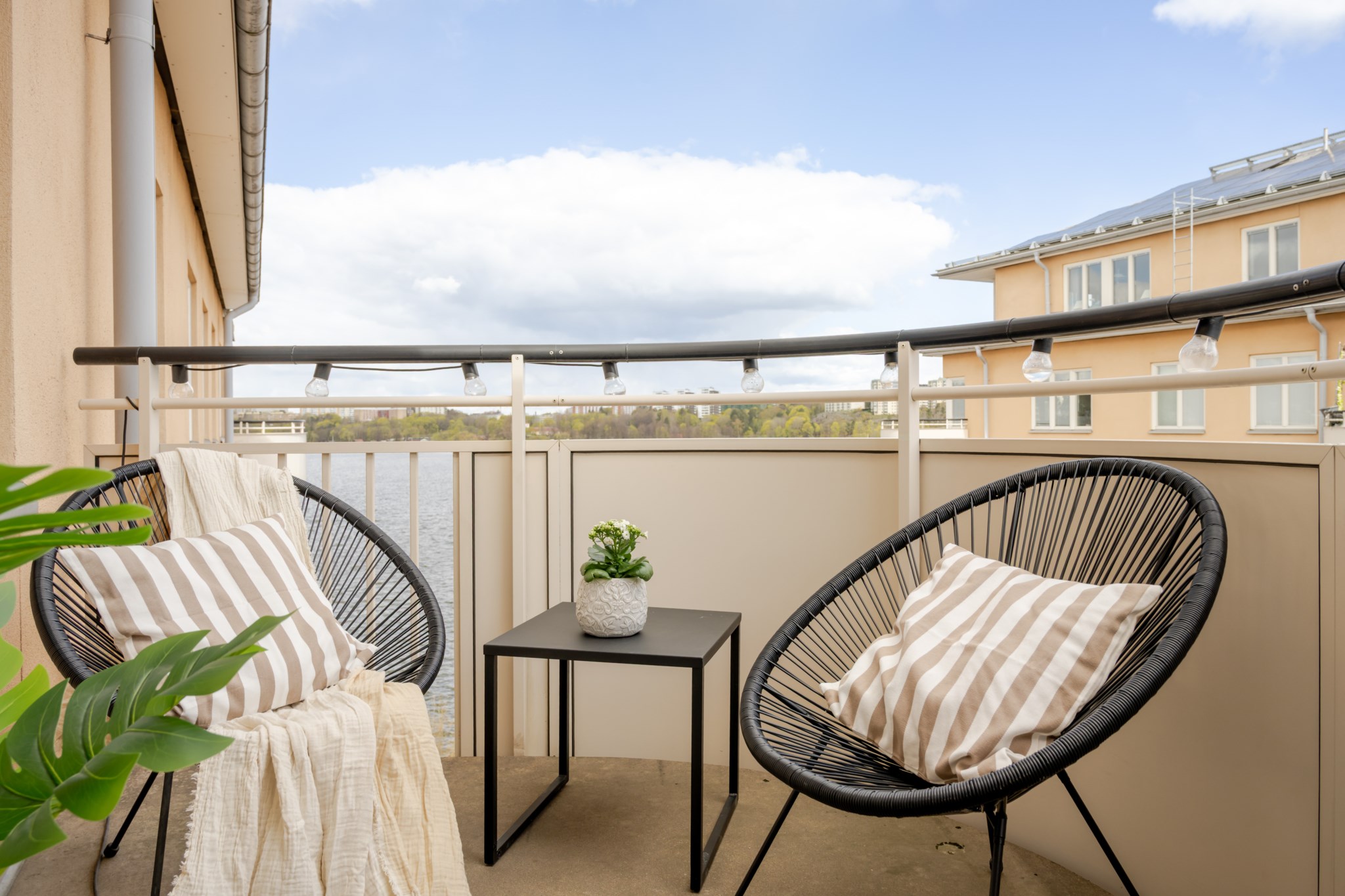 Två stora balkonger i högt fritt läge. Från den östervända balkongen avnjuts morgonsol med vy mot vattnet. Det här är den utmärkta platsen att blicka ut över båtlivet. Från den södervända balkongen ges sol resten av dagen.