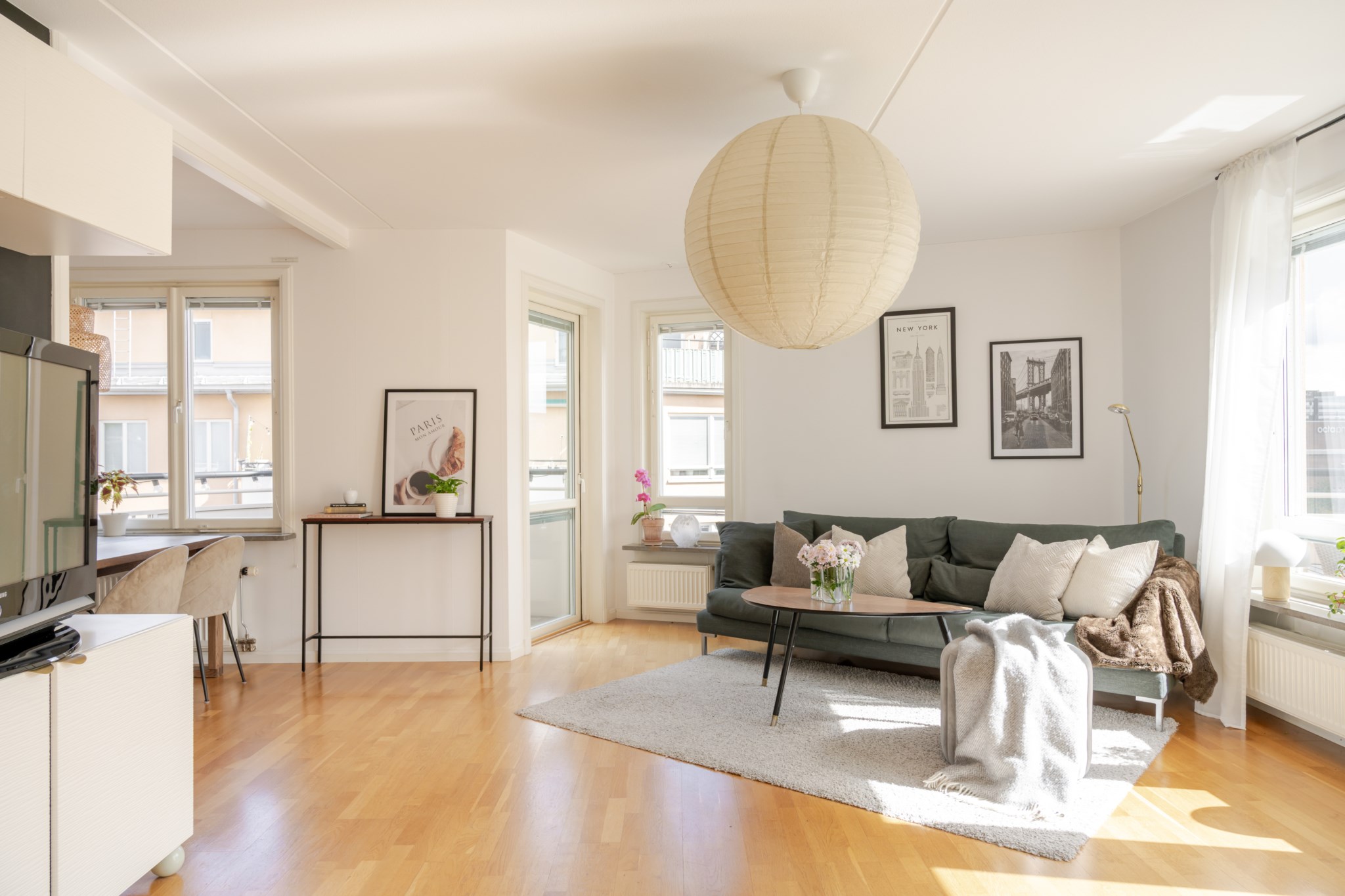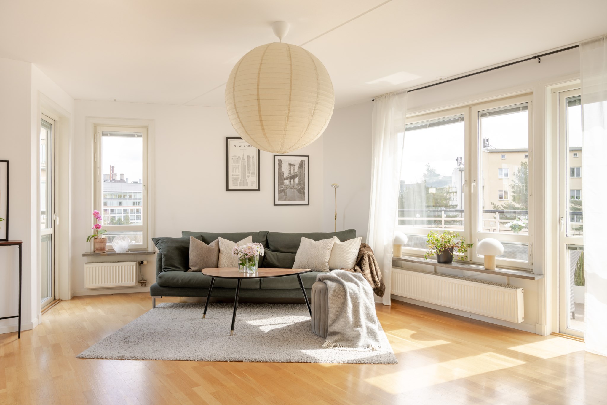 - Härligt vardagsrum med fönster i två väderstreck och utgång till två balkonger. Den ena balkongen har förmiddagssol och fri utsikt mot Ulvsundasjön. Den andra är södervänd och har utsikt över grönska samt sol resten av dagen. Vardagsrummet integreras med köket och ger härligt öppna sällskapsytor med rikliga ljusinsläpp från två väderstreck. Parkettgolv och väggar i ljus kulör.