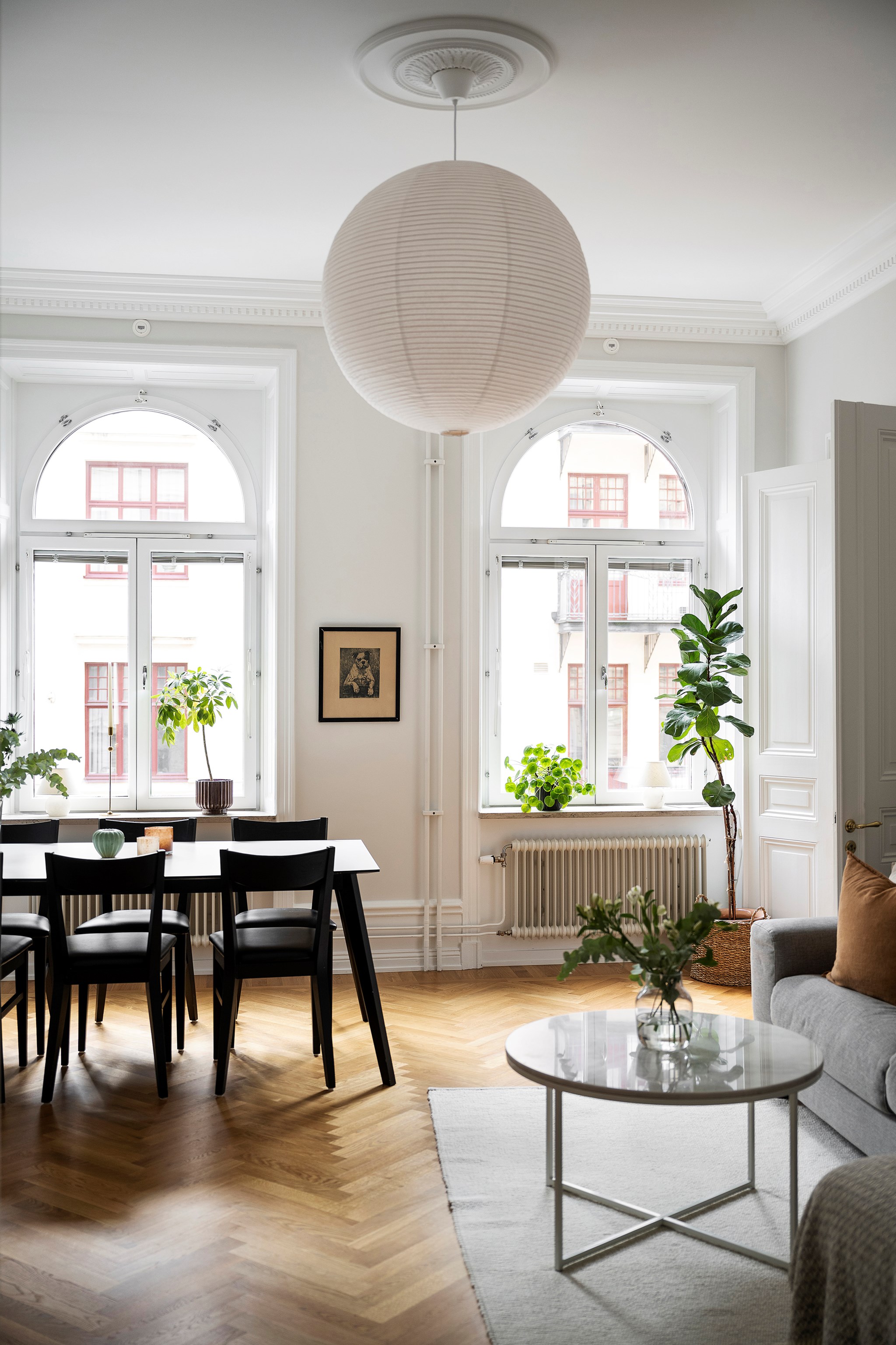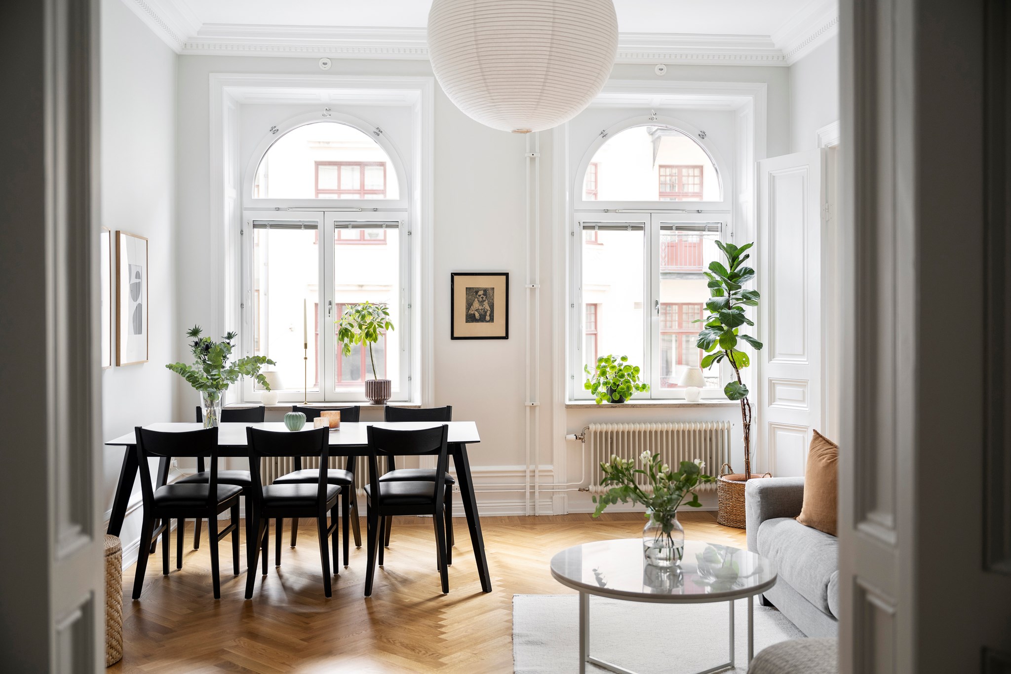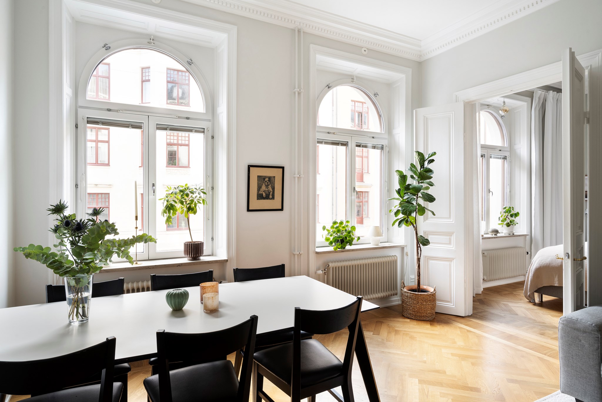 Ett ljust och luftigt rum med vacker fiskbensparkett, högt i tak och höga, välda fönster mot Kungsgatan. De vackra stuckaturerna och pardrörrarna ger rummet själ och karaktär, medan de tidlösa färgvalen och den sobra inredningen skapar en elegant helhet. Här ryms en större matgrupp, soffa, fåtöljer samt mindre möblemang.