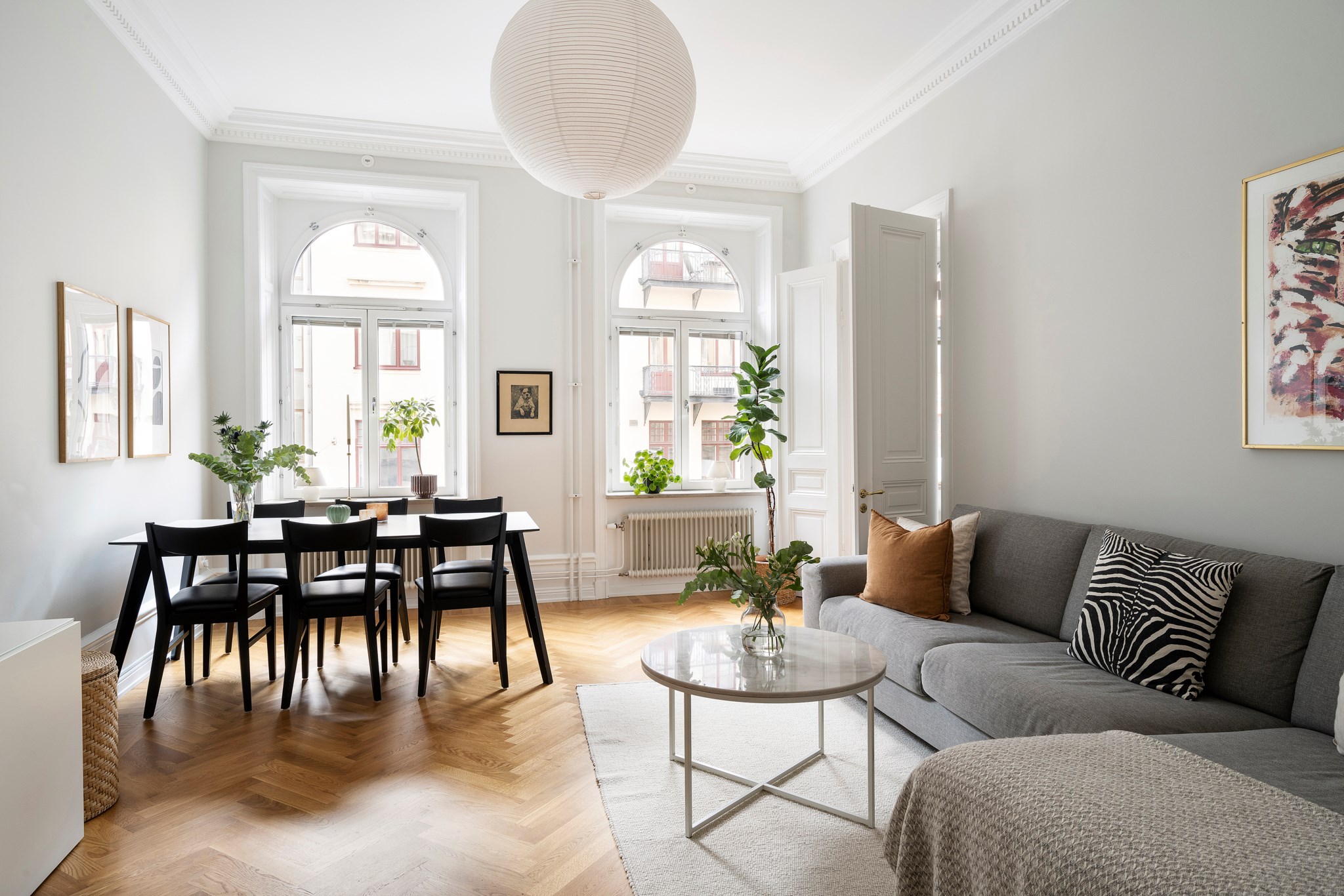 På den lugnaste delen av Kungsgatan, bara ett stenkast från vattnet och Kungsholmens gröna promenadstråk, väntar denna eleganta trea i en fastighet med anor från 1884. Här möts historia och nutid i vacker harmoni, där ljus, rymd förenas med utsökta materialval och tidlös stil. Bostaden är smakfullt renoverad de senaste åren med nytt kök, badrum och nya ytskikt. De härliga rumssambanden ger en våningskänsla och bjuder på generösa ytor, vackra detaljer och en atmosfär som andas tidlös elegans. Med en takhöjd om cirka 3,2 meter, stuckaturer, takrosetter och speglade pardörrar blir man lätt förälskad. Här möts ljus och rymd på ett sätt som är sällsynt, tack vare de stora, välvda fönsterpartierna i två väderstreck. Hela lägenheten är sobert färgsatt och har gott om förvaring. Detta är ett hem för familjen eller dig som söker en lägenhet med allt man kan önska sig.