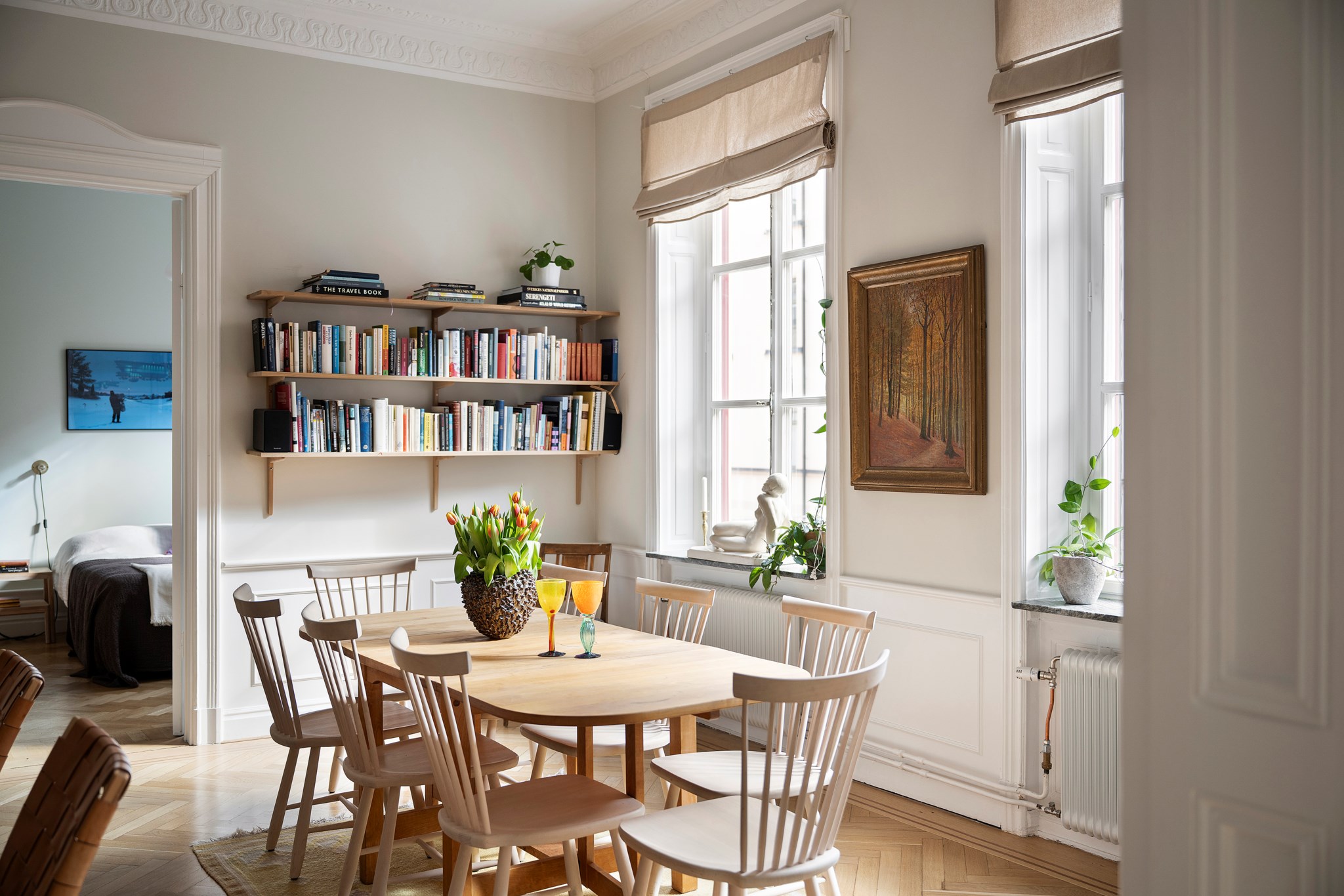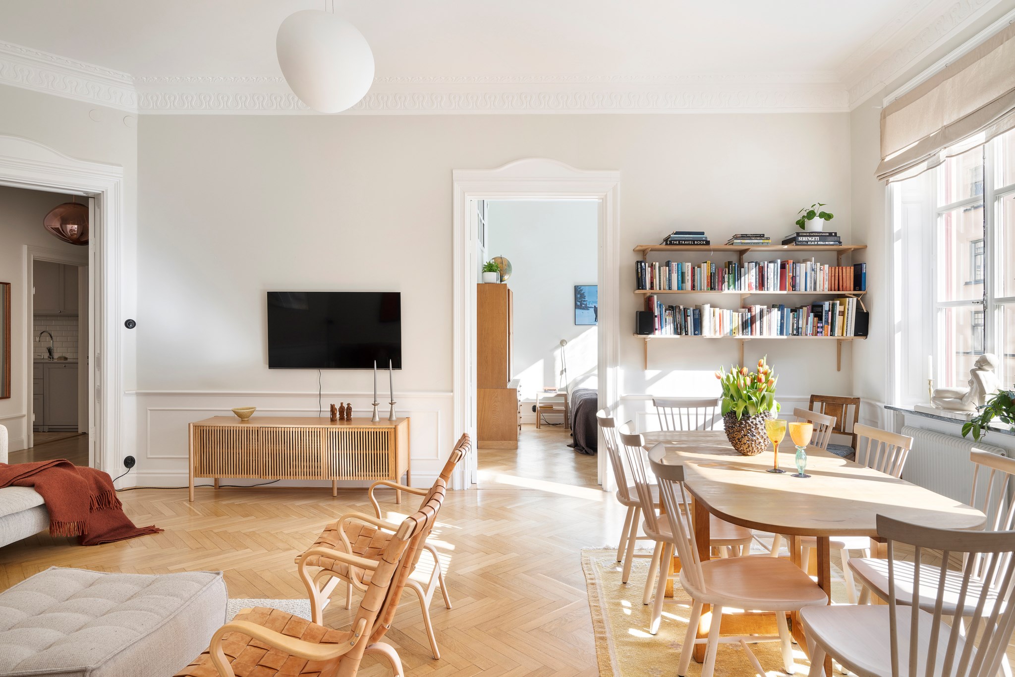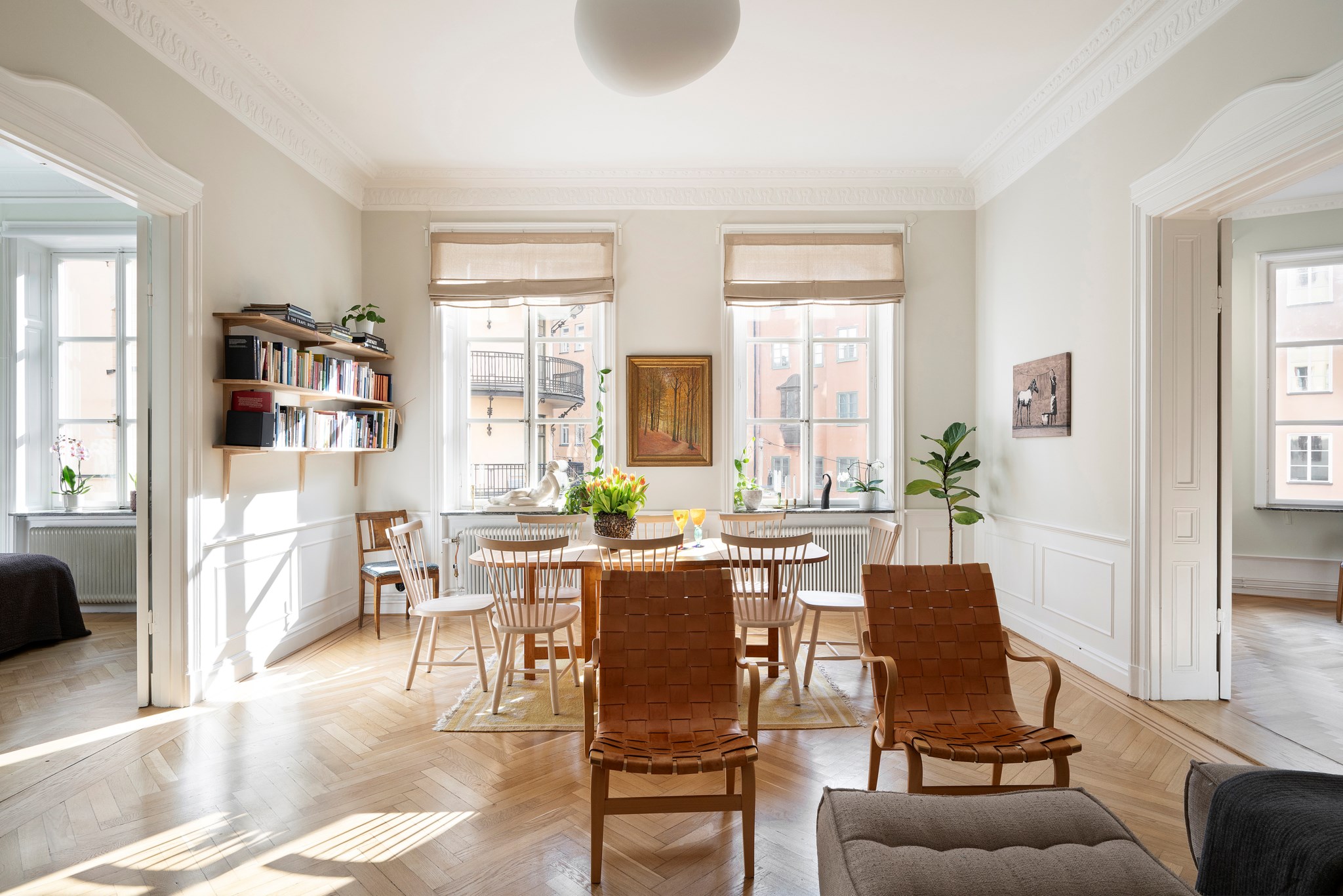 Takhöjden om ca 3,3 meter, stuckaturer, spegeldörrar, höga golvsocklar och fiskbensparkett ger bostaden den där självklara våningskänslan som bara riktigt gamla hus har. Rummen ligger i fil mot gatan och får ett fint ljusinsläpp från stora fönster med utsikt mot grönska och de klassiska fasaderna från förra sekelskiftet. Planlösningen gör att man kan ha både ett generöst vardagsrum och flera sovrum utan att förlora rymden.