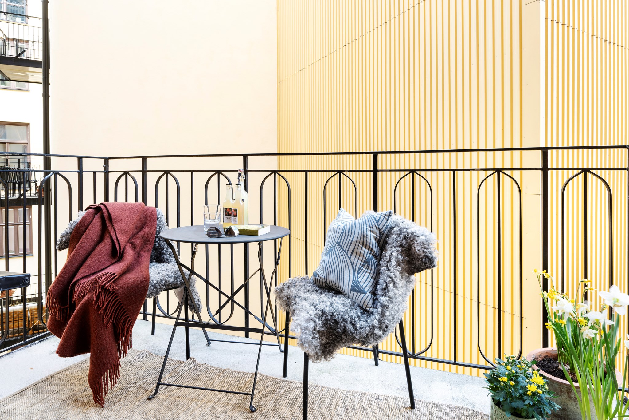 Balkong mot lugn innergård med plats för sittgrupp och växter. Ett skyddat läge som lämpar sig väl för både morgonkaffe och sena sommarkvällar.