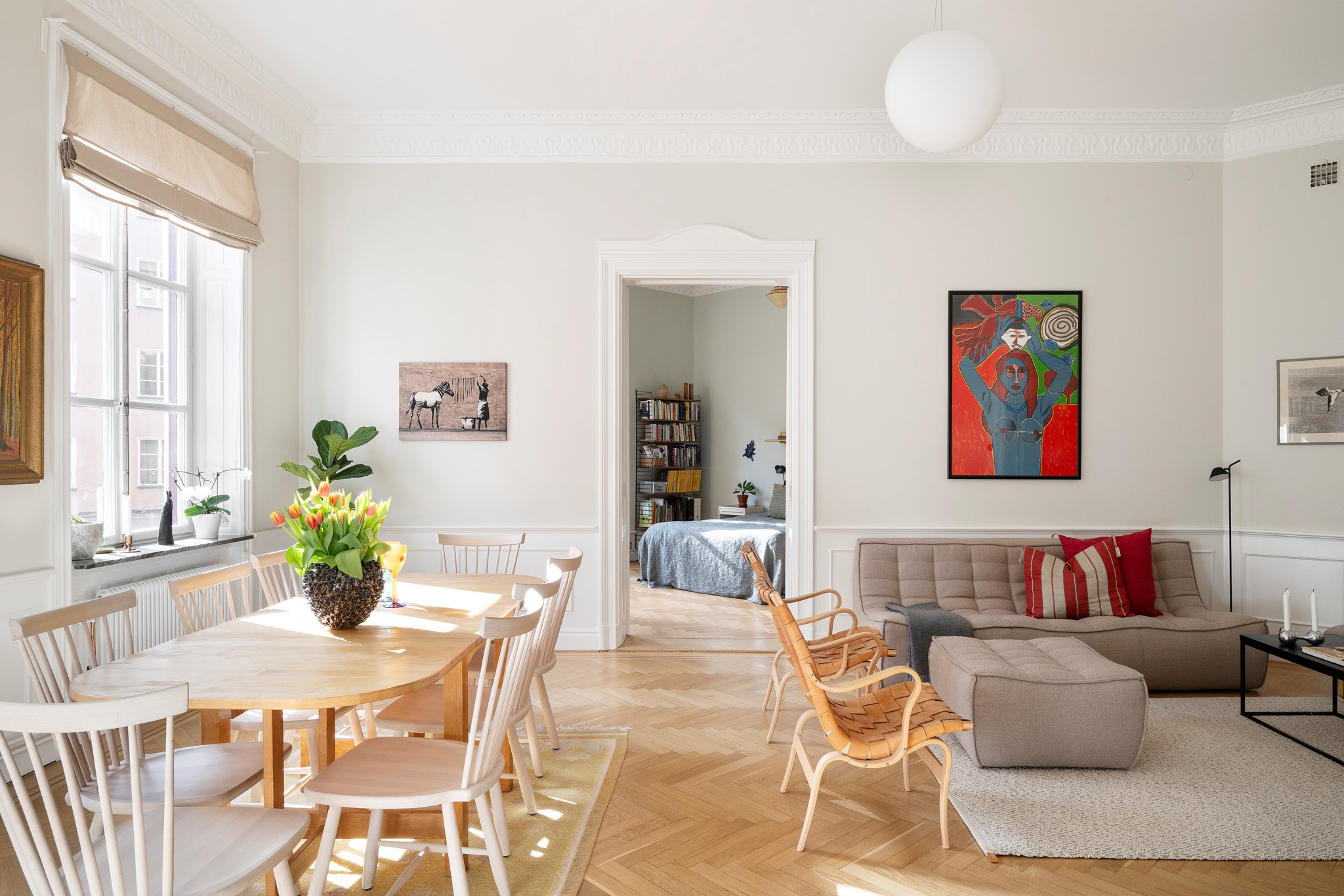 Stort och representativt vardagsrum med fiskbensparkett, höga golvsocklar och vacker stuckatur. Dubbla fönster ger ett fint ljusinsläpp och rummet ligger i fil med två intilliggande sovrumrum vilket skapar en klassisk sekelskiftesplanlösning med stor flexibilitet.