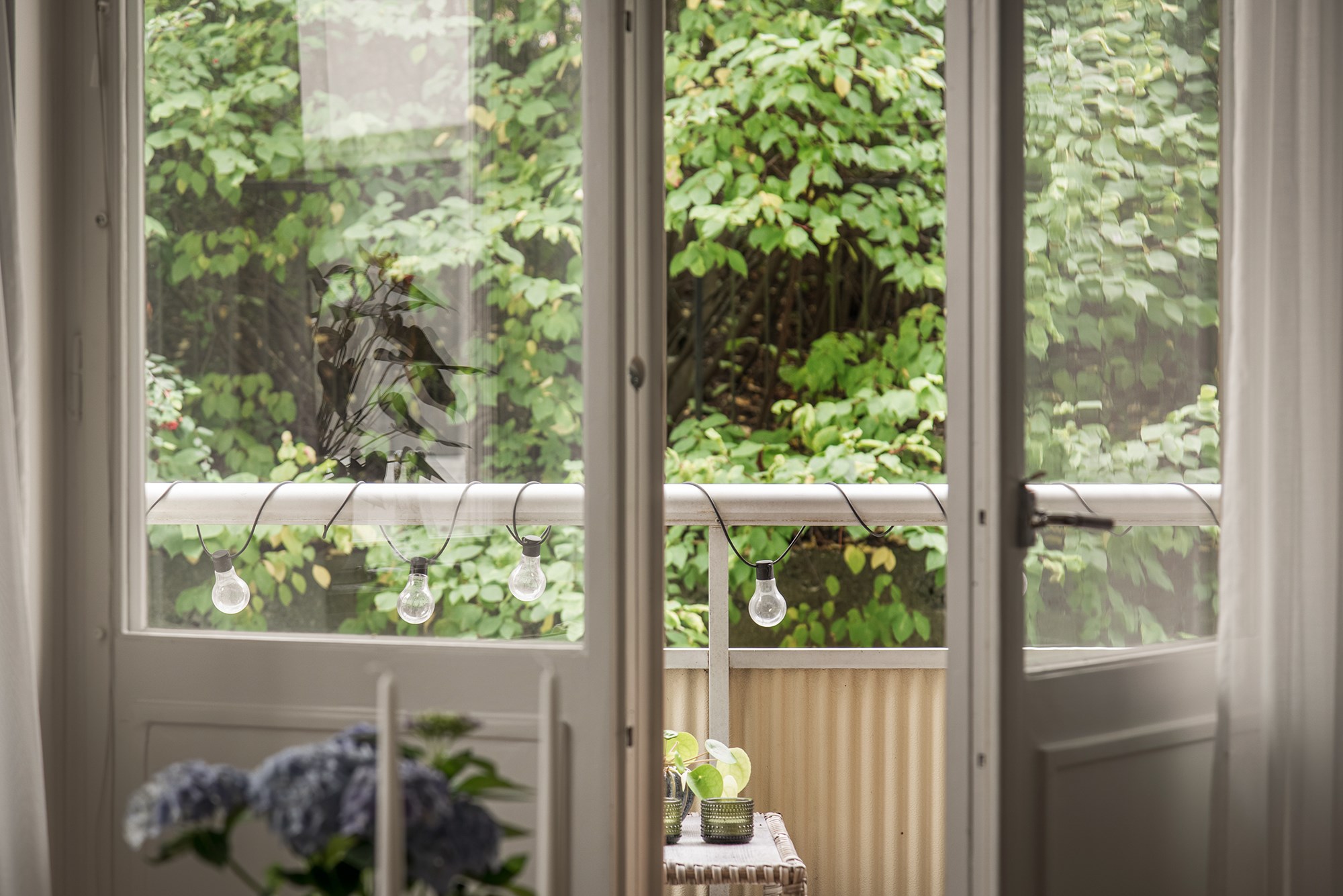 Möblerbar balkong i söderläge med utsikt mot om sommaren vackert grönskande ytor.