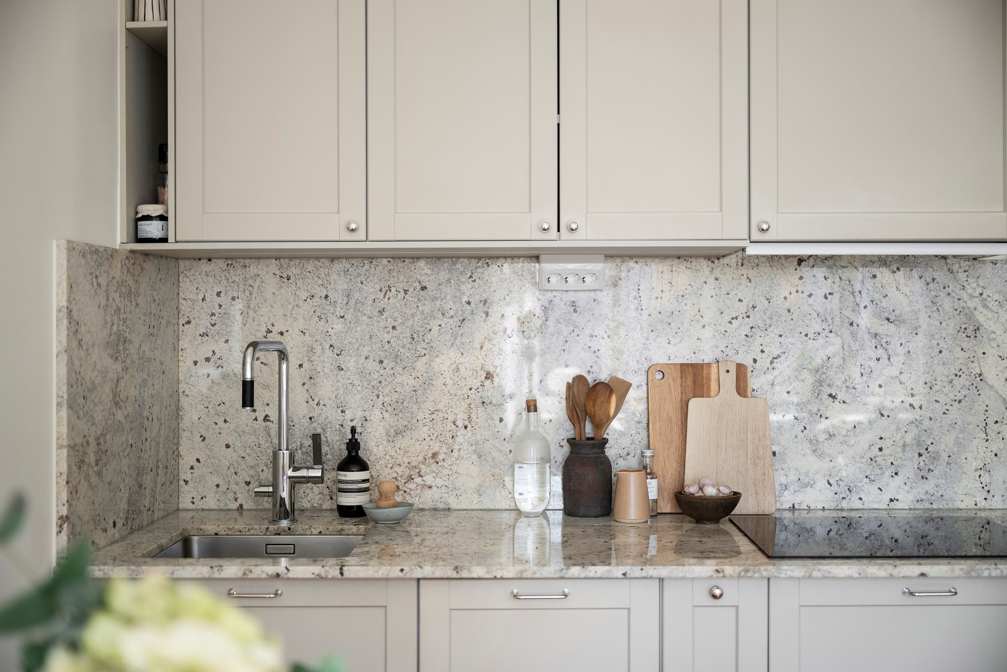Hela lägenheten renoverades 2023 med omsorg om både material och funktion. Släta luckor med ram i en mjuk kulör möter en påkostad granitbänkskiva och noggrant utvalda detaljer, i en helhet som känns lugn och genomtänkt. Badrummet är stilrent kaklat och utrustat med tvättmaskin, en praktisk bekvämlighet i vardagen.