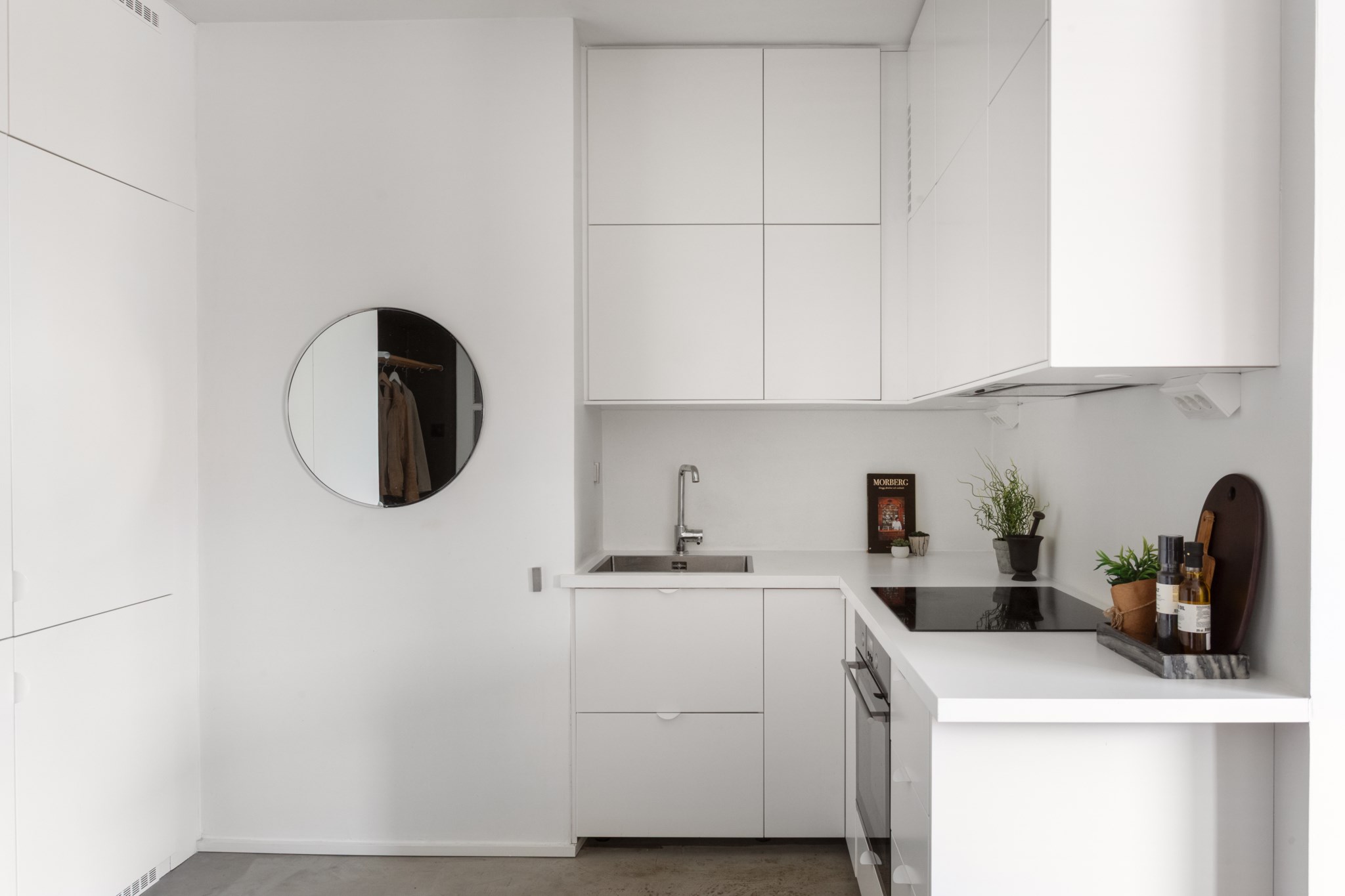 Det stilrena köket renoverades 2017 och är integrerat med vardagsrummet och skapar en harmonisk öppen planlösning. Här finns moderna vitvaror i form av spishäll, ugn och integrerad kyl/frys. Såväl skåpsluckor som arbetsyta är krispigt vita, vilket gör köket stilrent och snyggt.