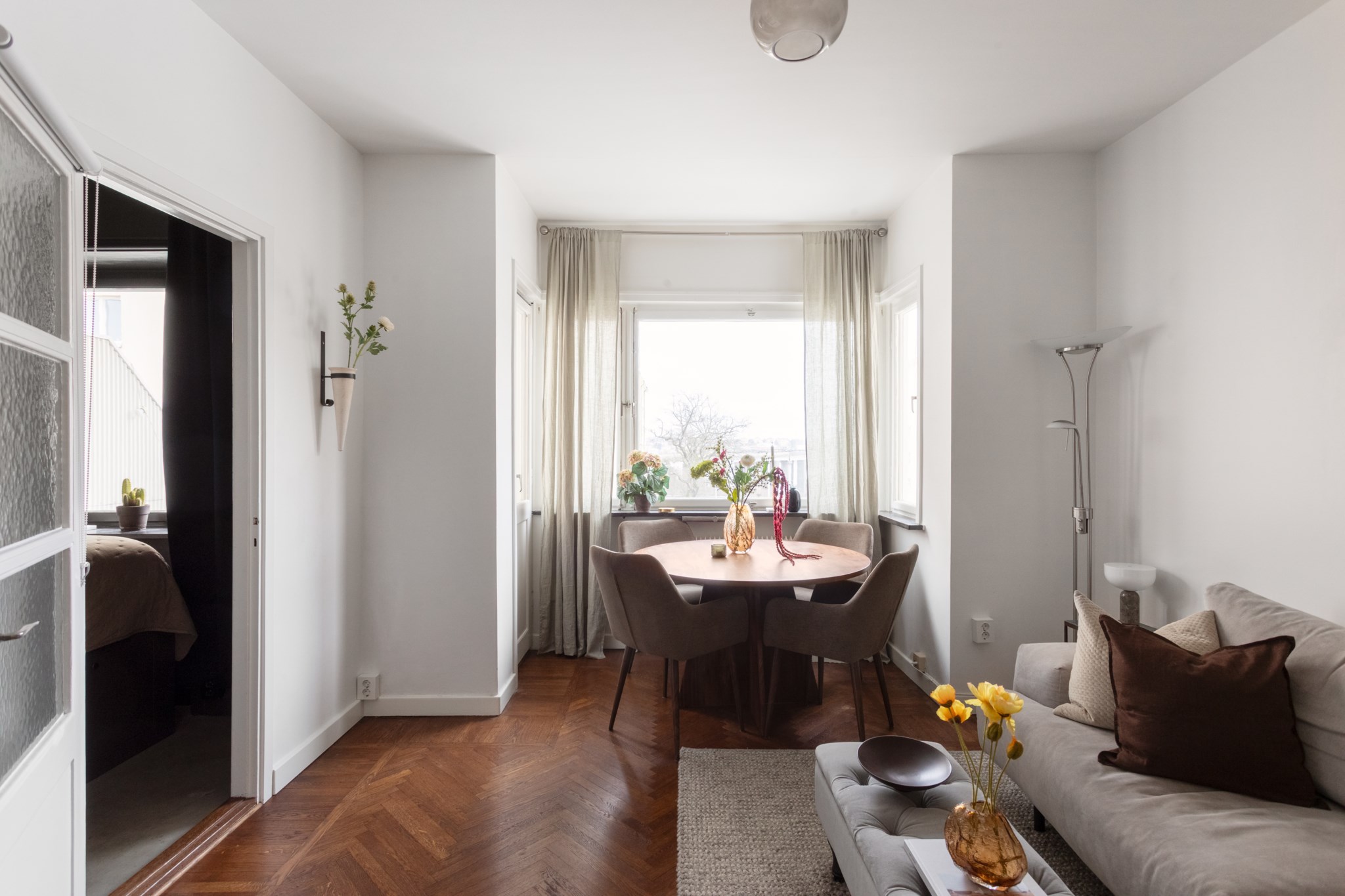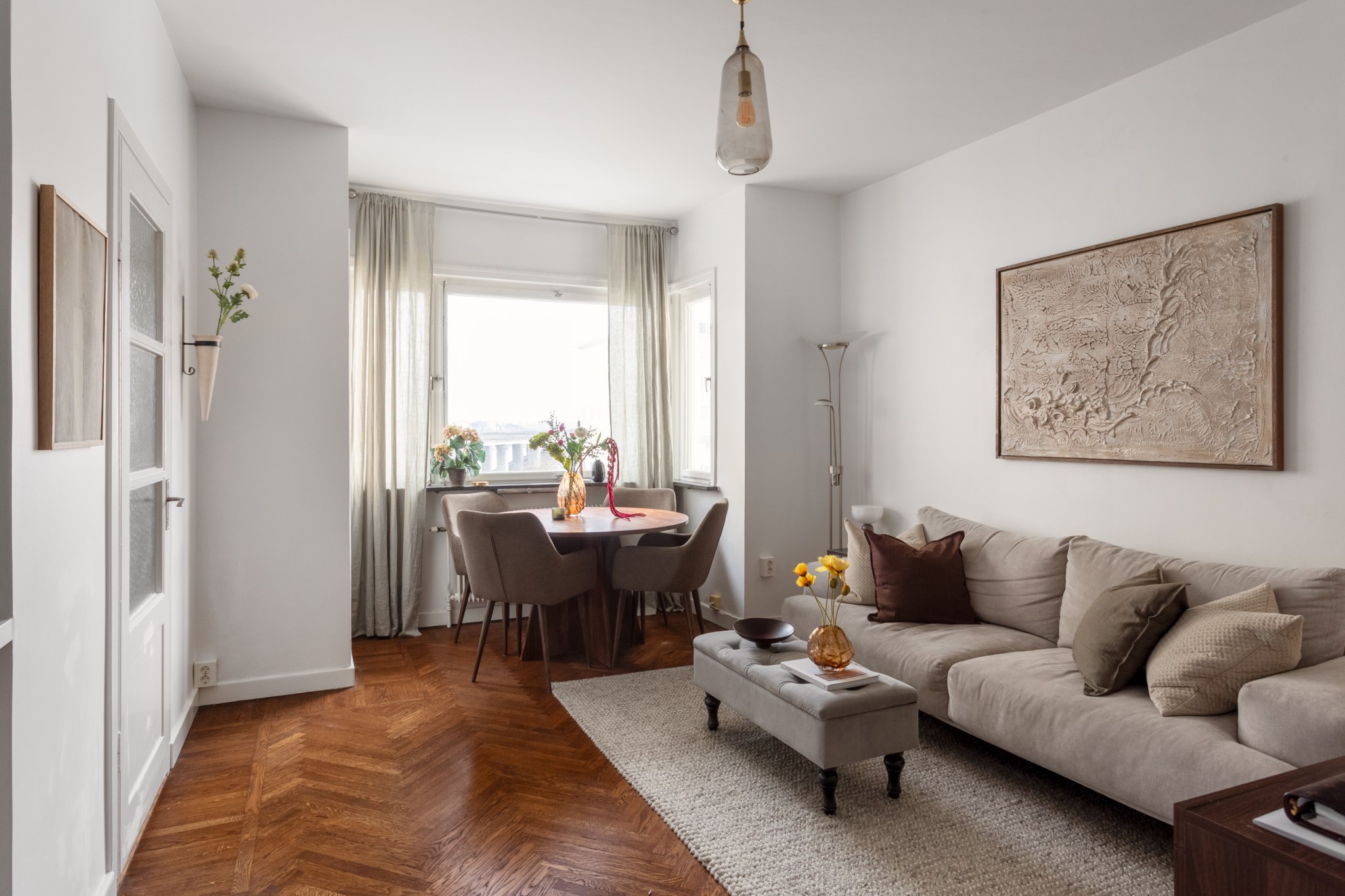 Bostaden har ett genomgående fint skick där moderna inslag samspelar med bevarade detaljer från byggnadsåret 1938. Planlösningen är social och lättmöblerad, med ett vardagsrum som rymmer både soffgrupp och matplats. Den klassiska fiskbensparketten ger rummet karaktär och värme, och härifrån nås den solsäkra balkongen i söderläge som blir en naturlig förlängning av bostaden under årets varmare månader.