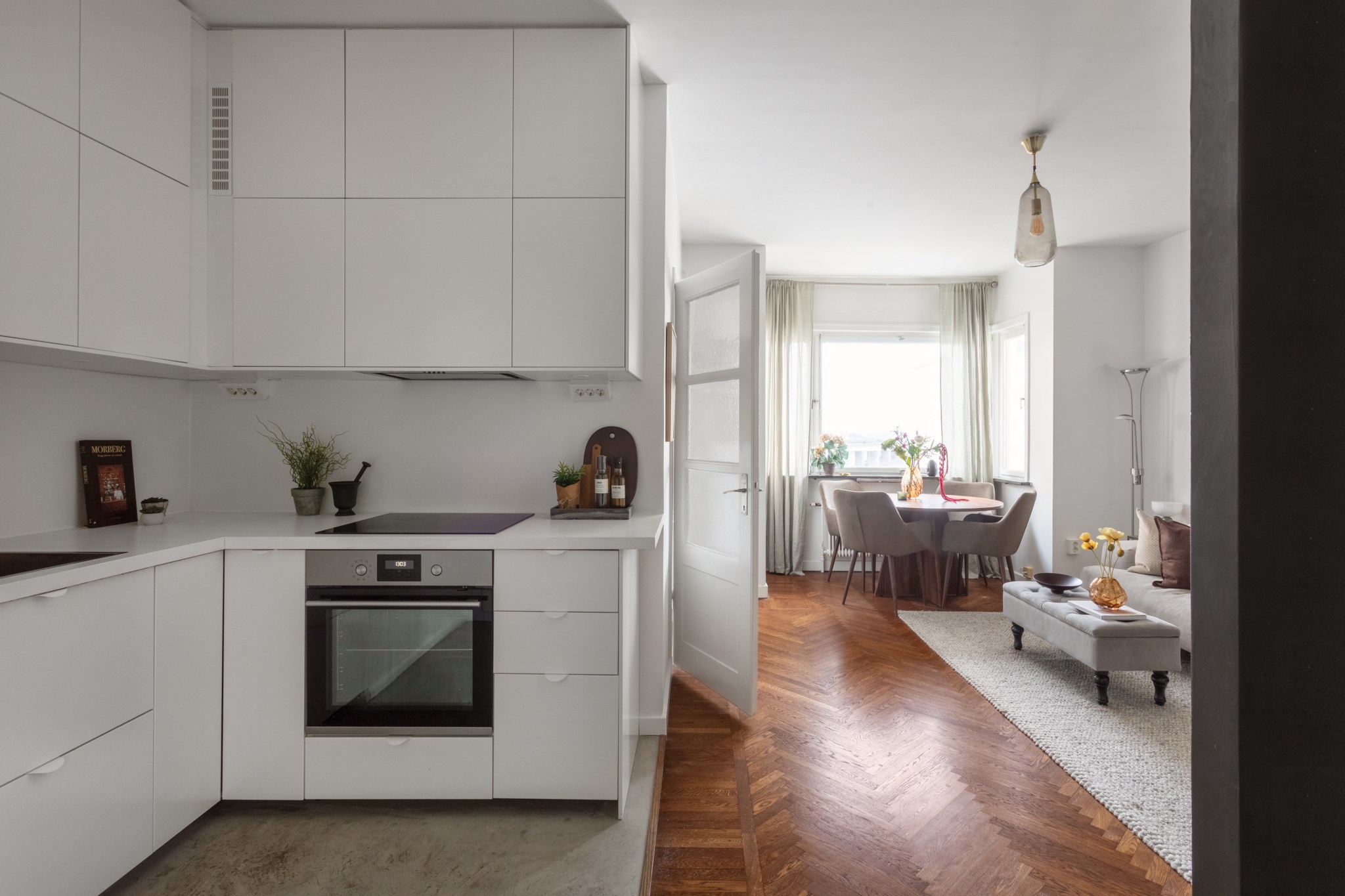 Ljust och rymligt vardagsrum med klassisk fiskbensparkett som ger rummet en tidlös elegans och vitmålade väggar. Rummet erbjuder gott om plats för både soffa, TV-möbel och matbord. Från vardagsrummet når du balkongen i soligt söderläge, där du kan njuta av solen från morgon till kväll. Öppna ytor mellan vardagsrum och kök skapar en inbjudande och social atmosfär.