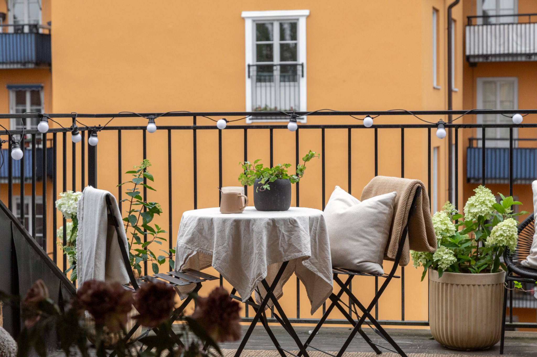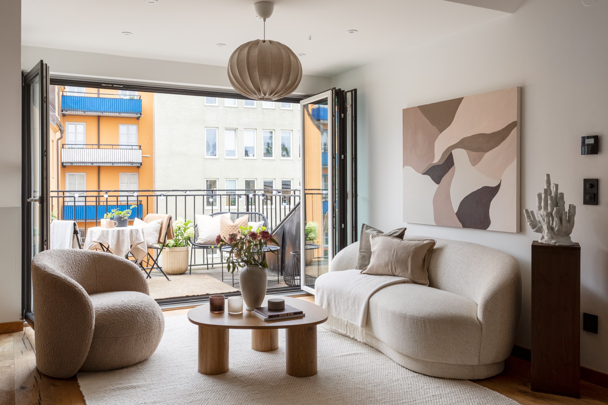 Våningen präglas av ljus och rymd med fönster i två väderstreck och en planlösning som inbjuder till samvaro. Det stora vardagsrummet och det exklusiva köket samspelar i en öppen disposition där matlagning och umgänge flyter samman. Härifrån nås även den generösa terrassen – en privat oas mot gården där du kan skapa din egen grönskande plats för vila, middagar och varma sommarkvällar. En fjärrstyrd markis över terrassen ger både skön skugga under soliga dagar och en ombonad känsla på kvällen.