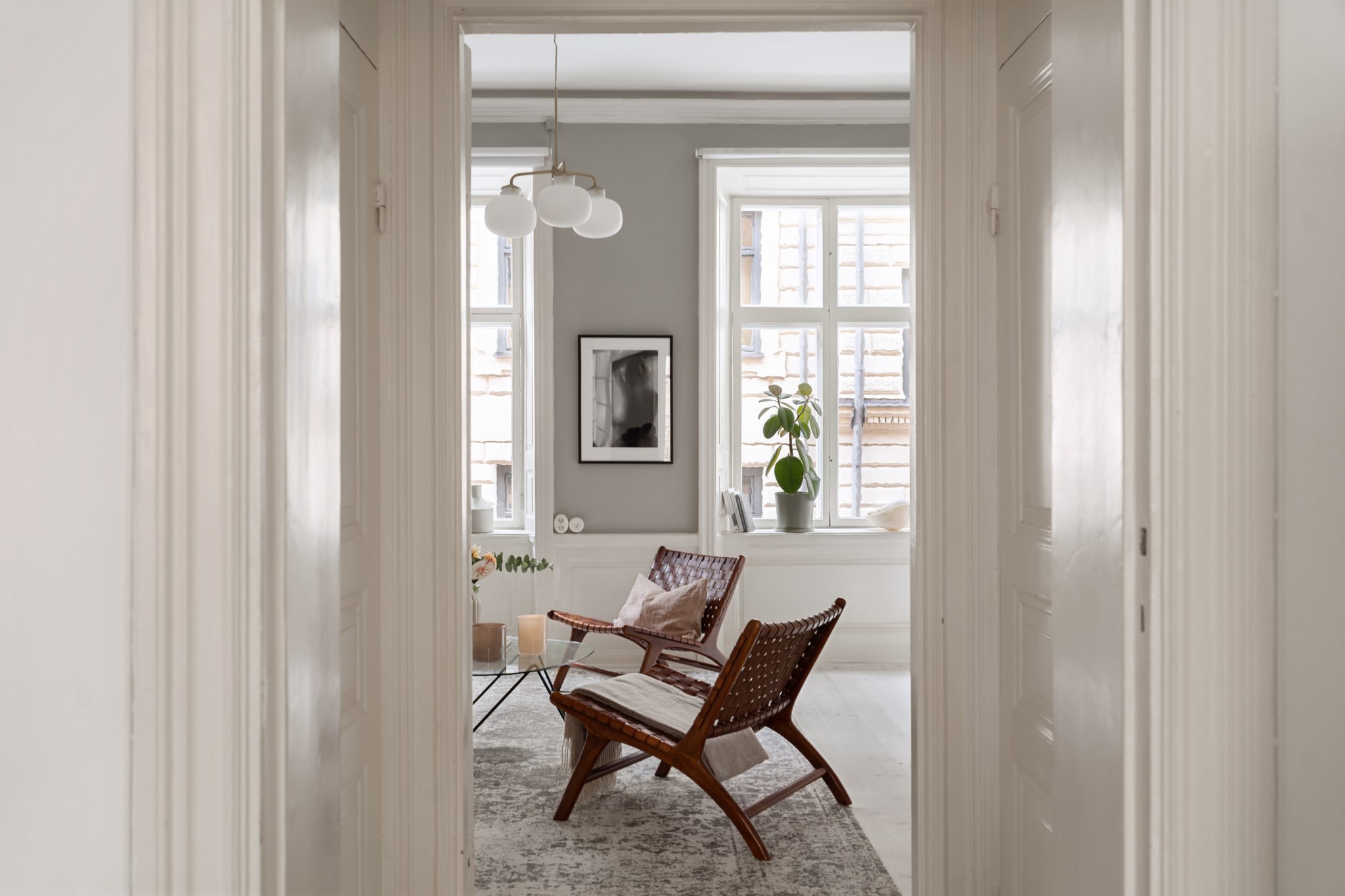 - Hall med ingång via vackra pardörrar och plats för avhängning vid klädhängare. Praktisk förvaring i skåp ovan badrummet. Hårdvaxade och pigmenterade furugolv samt vitmålade väggar och tak. Ovan dörren till sovrummet finns ett fönster som ger gott ljusinsläpp till hallen.