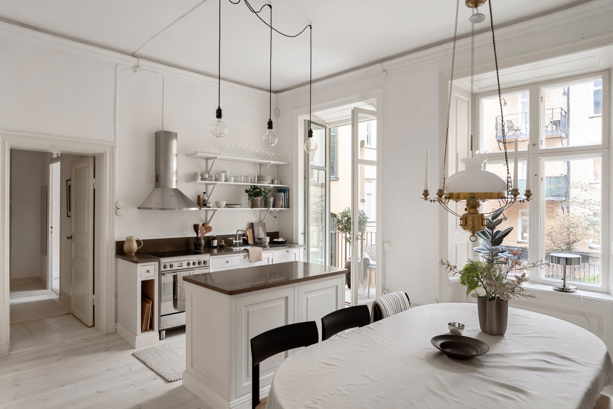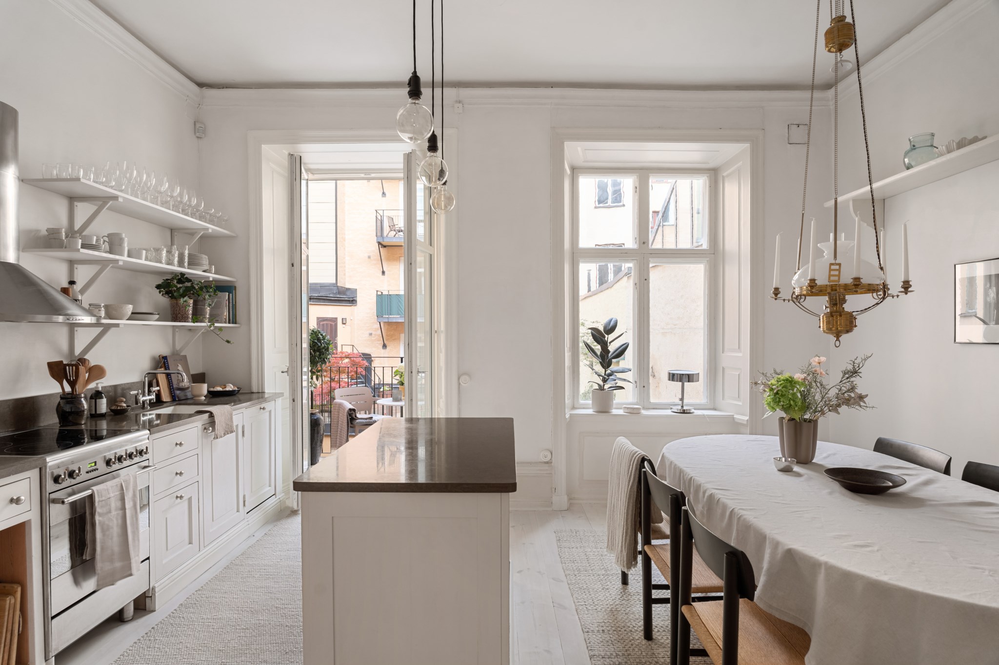 Planlösningen är ljus och genomgående från gården till gatan, den är utmärkt disponerad och utgör en del av husets gamla paradvåning från 1700-talet. Härligt, öppet och platsbyggt sällskapskök som snickeritillverkats och inretts i klassisk och lantlig stil och ger en känsla av svunna tider. Bänksskivor i gotländsk kalksten och komplett maskinell utrustning. Köket inbjuder till middagar och tillställningar i goda vänners lag. Här finns utgången till balkongen som ger en härlig förlängning av köket och som därmed förenar ute med inne.