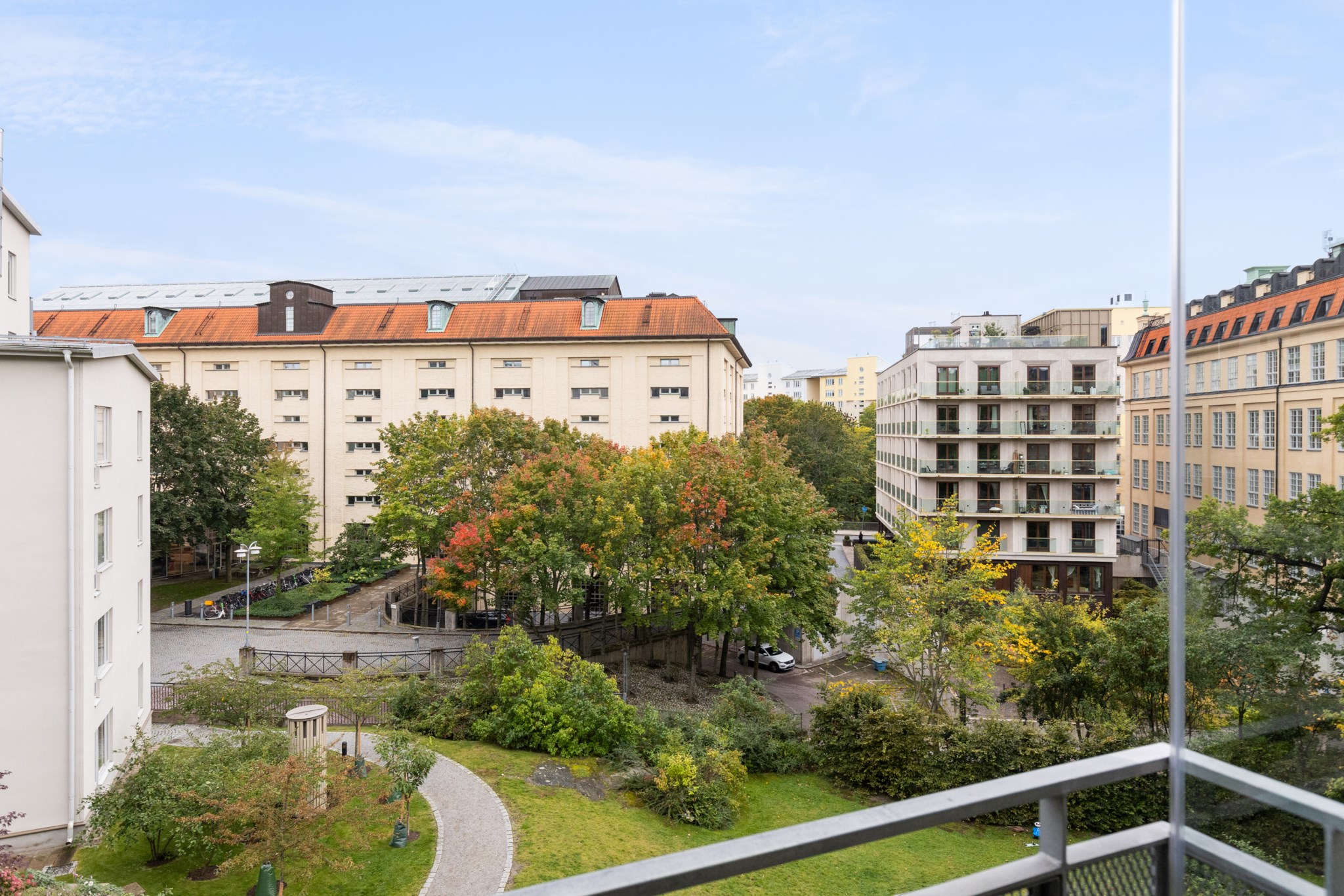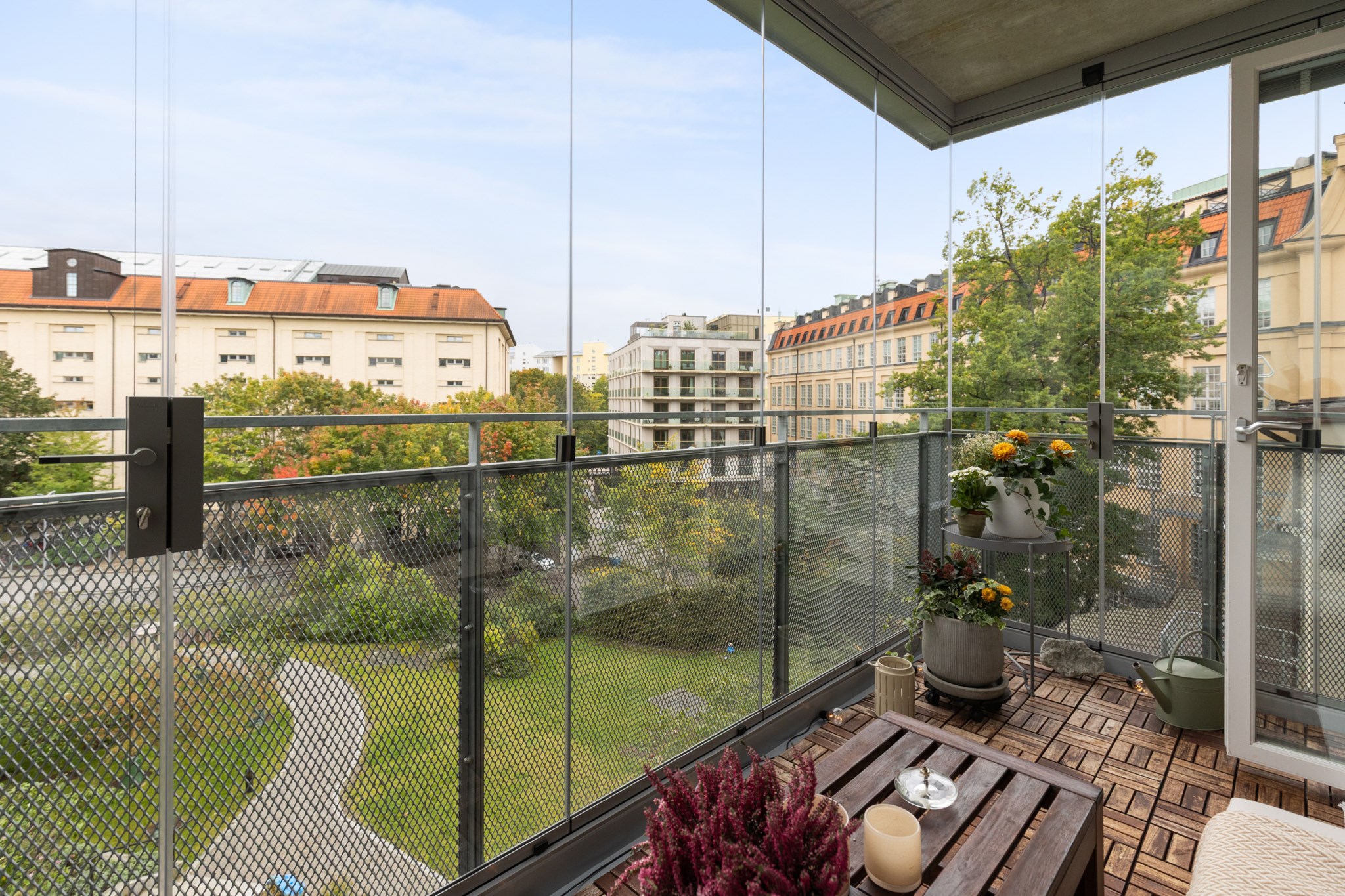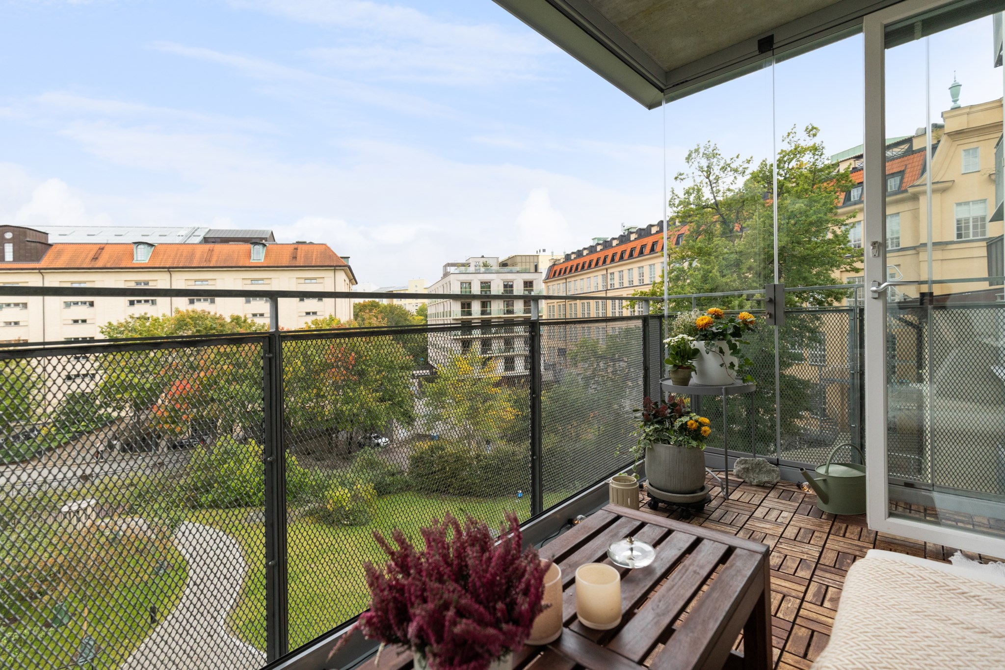 Balkongen har ett magiskt och lugnt läge mot föreningens innergård och gamla Tobaksmonopolets praktfulla byggnad – i en skön kontrast till den nyproducerade fastighet vi befinner oss i. Här kan man under sommarhalvåret njuta av solen från morgon till kväll. Gott om plats för önskat möblemang och planteringar.