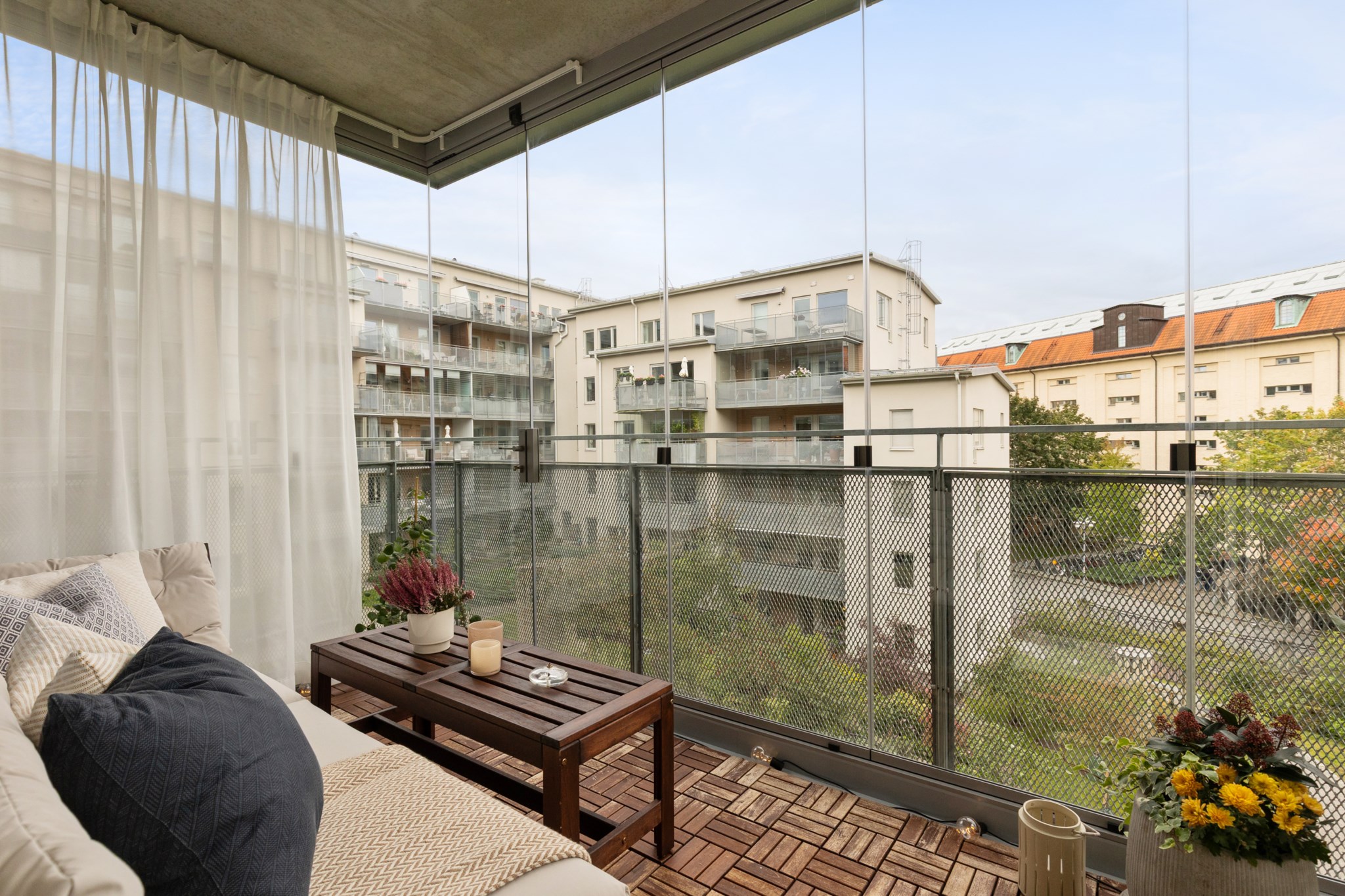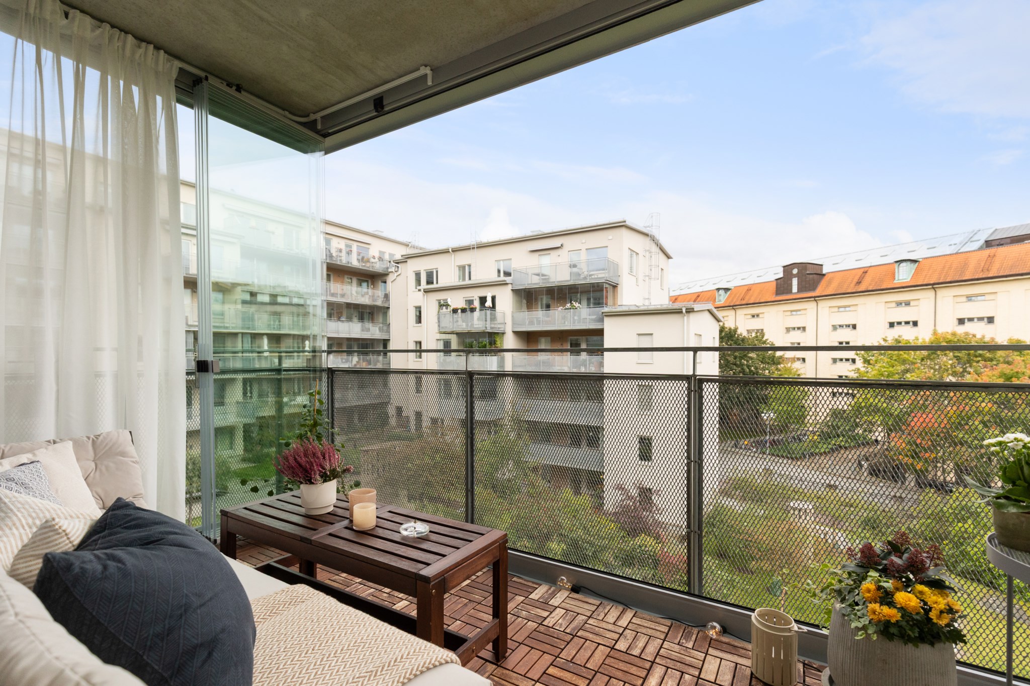 Balkongen är inglasad och blir som ett extra rum samt en förlängning av sällskapsrummet och kan med fördel användas året om men vid varma sommardagar kan man välja att öppna upp glaset.