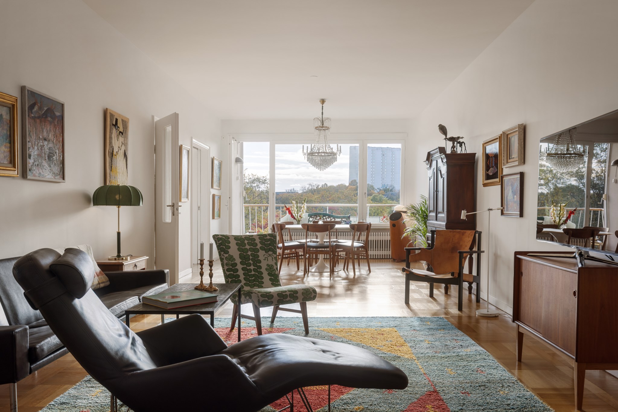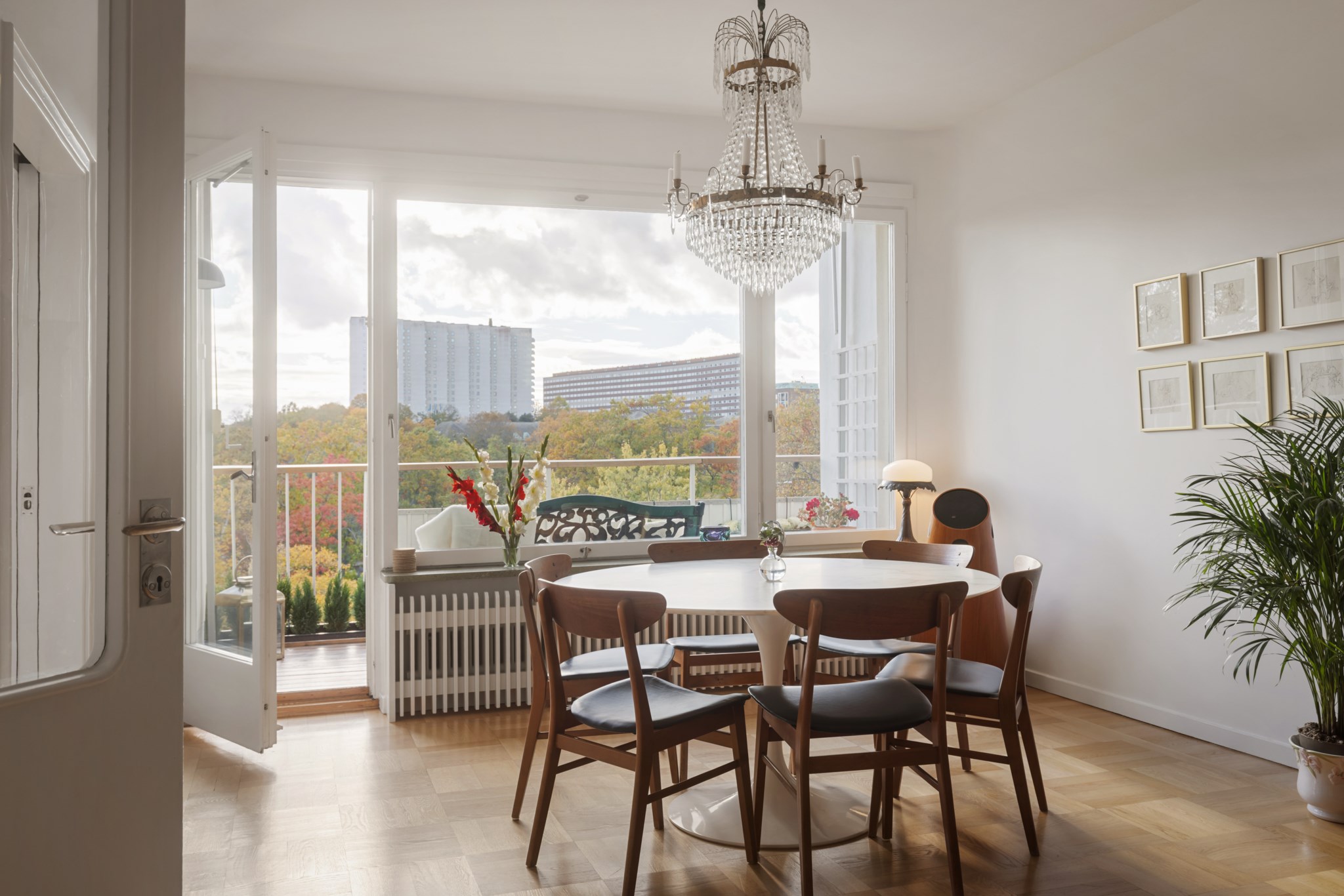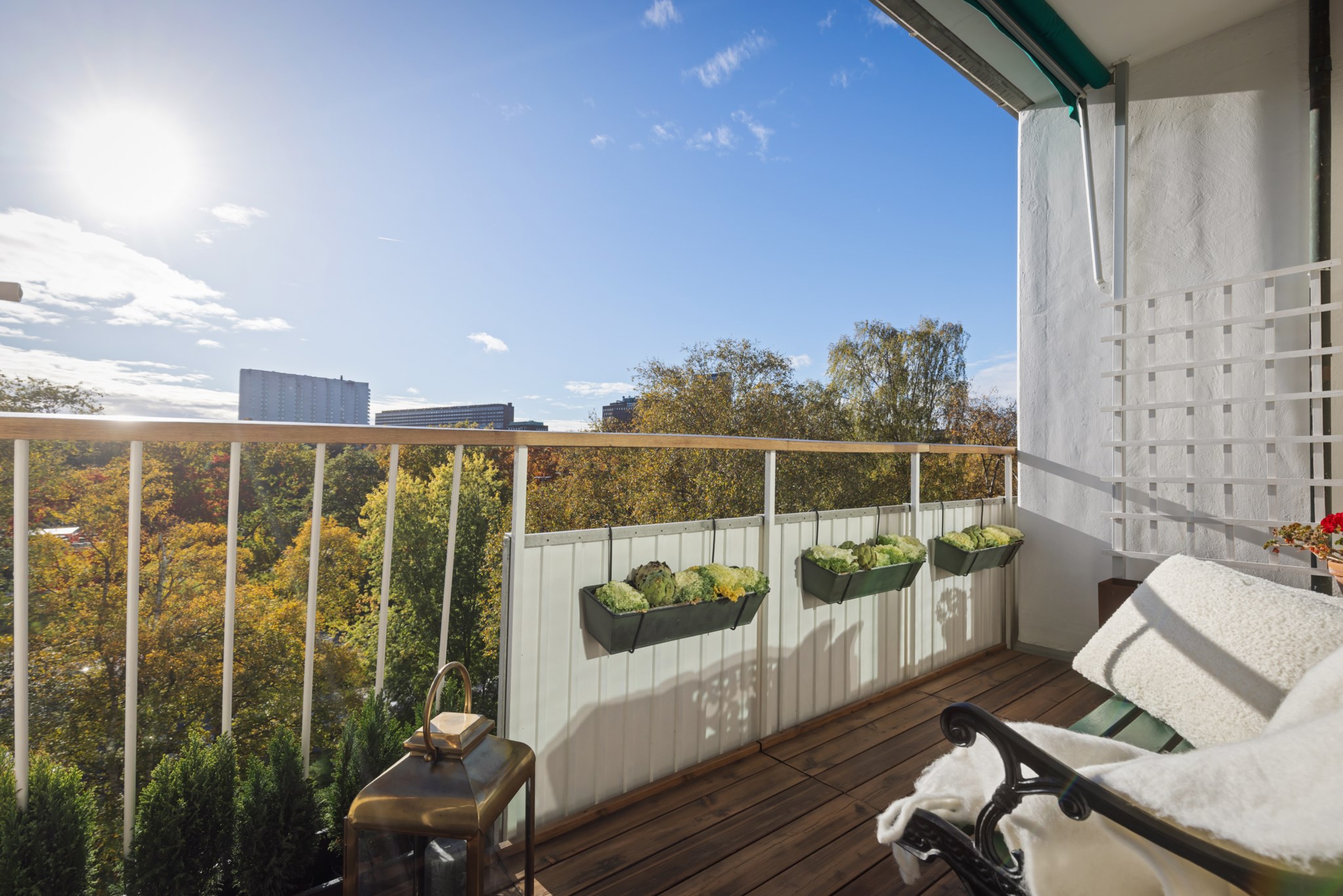Stor balkong i söderläge med fri utsikt över Rålambshovsparken och Norr Mälarstrand – en grönskande vy som skiftar vackert med årstiderna. Här sitter du på första parkett mot stadens mest levande kvarter, med plats för både möblering och växter. En trivsam förlängning av vardagsrummet under årets varmare månader.