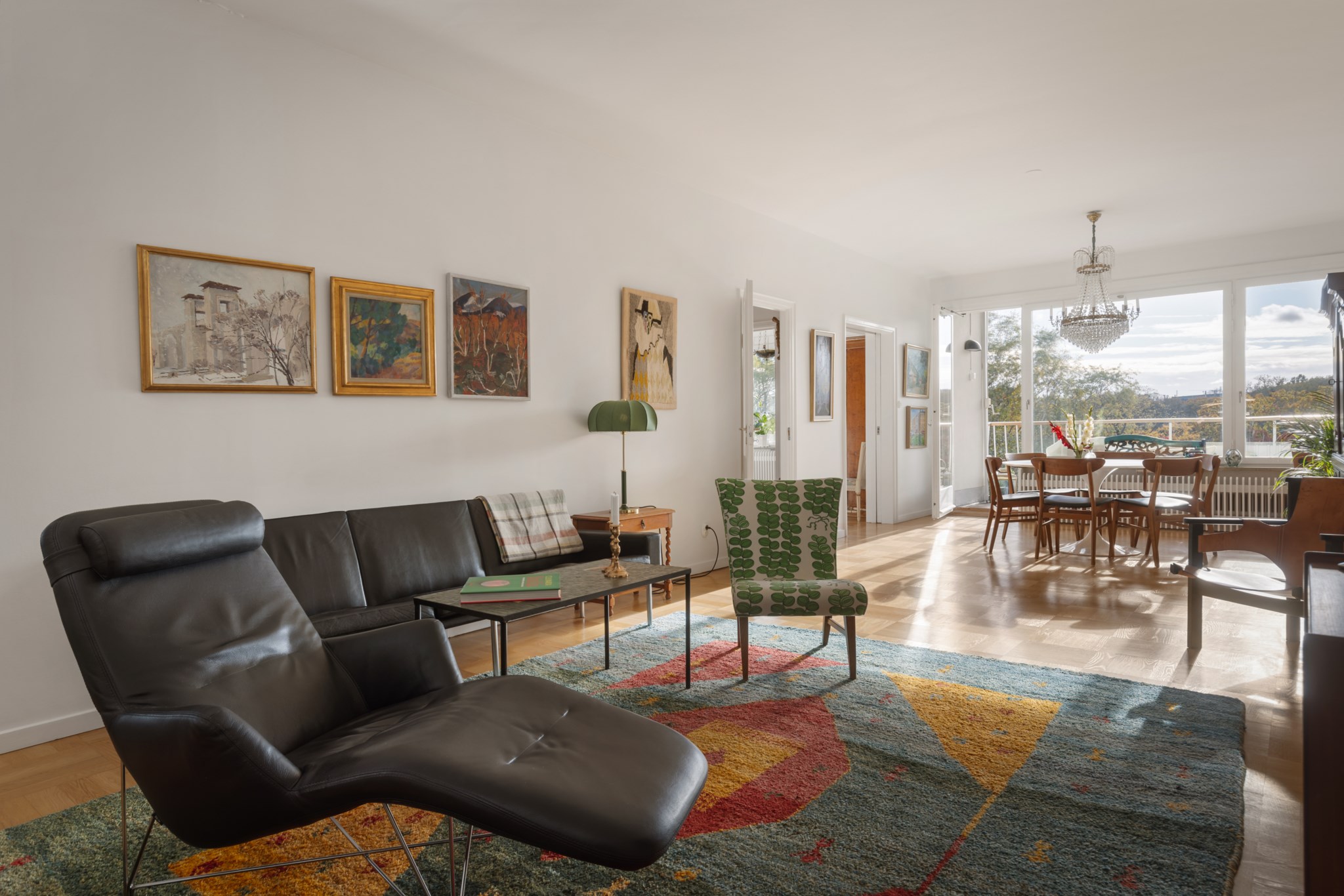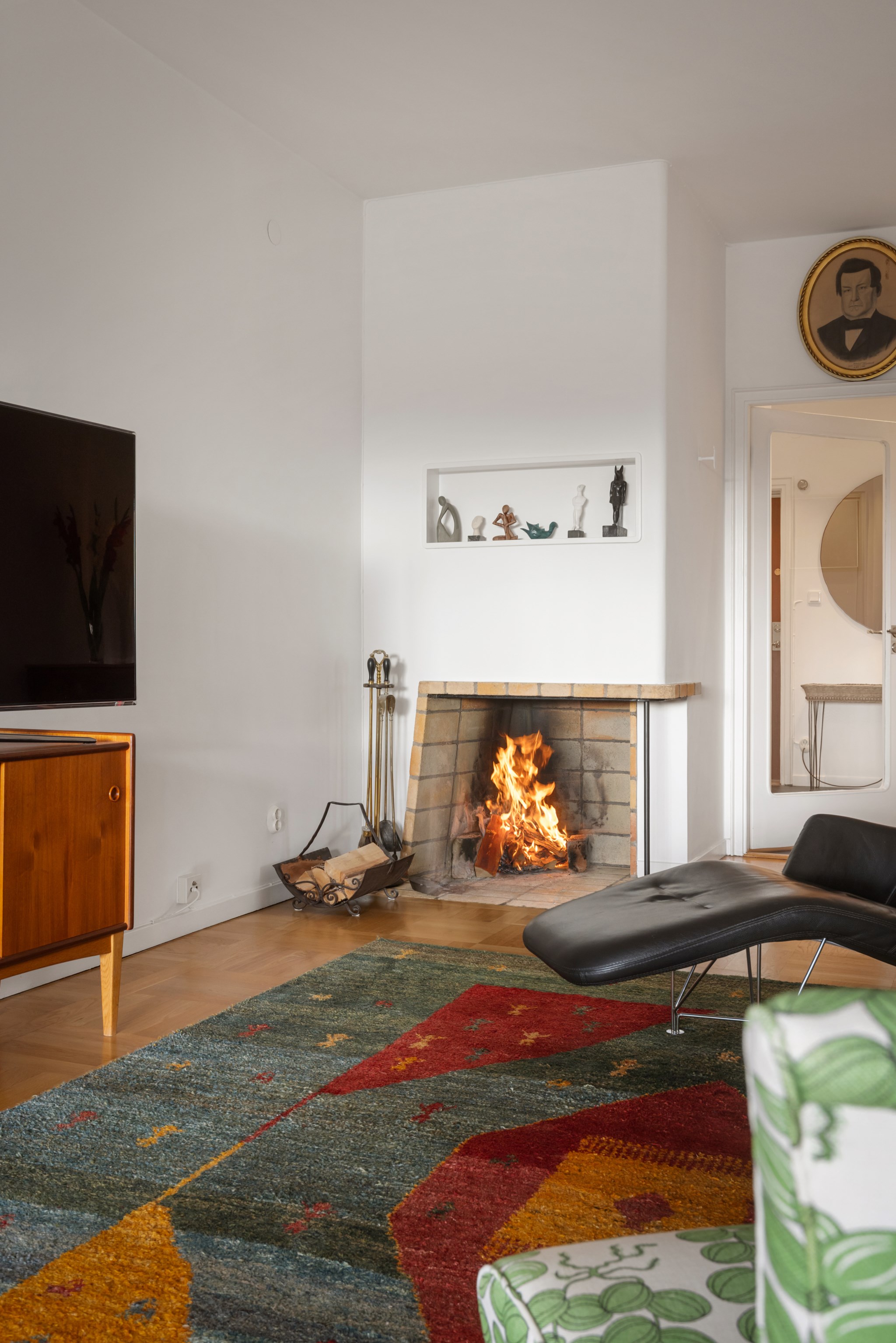Ett vardagsrum som verkligen bjuder in till umgänge – generöst tilltaget med plats för både soffgrupp, fåtöljer och ett stort matbord. Den fungerande öppna spisen skapar värme och atmosfär, medan de vackra fönsterpartierna ramar in rummet och släpper in rikligt med ljus. Härifrån nås även bostadens balkong. Rummet pryds av vacker stavparkett och ljusmålade väggar – en klassisk och inbjudande kombination som lyfter helheten.