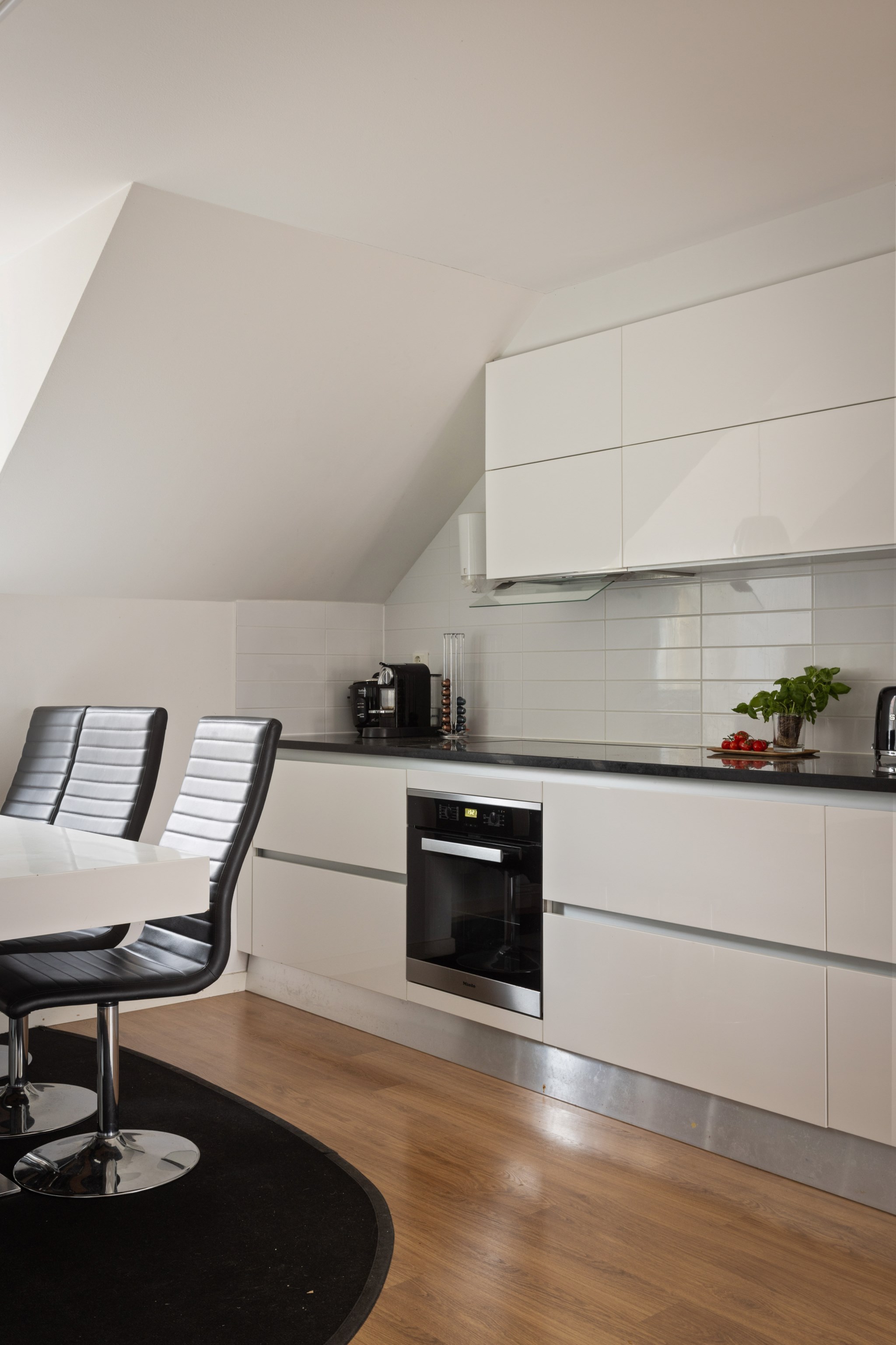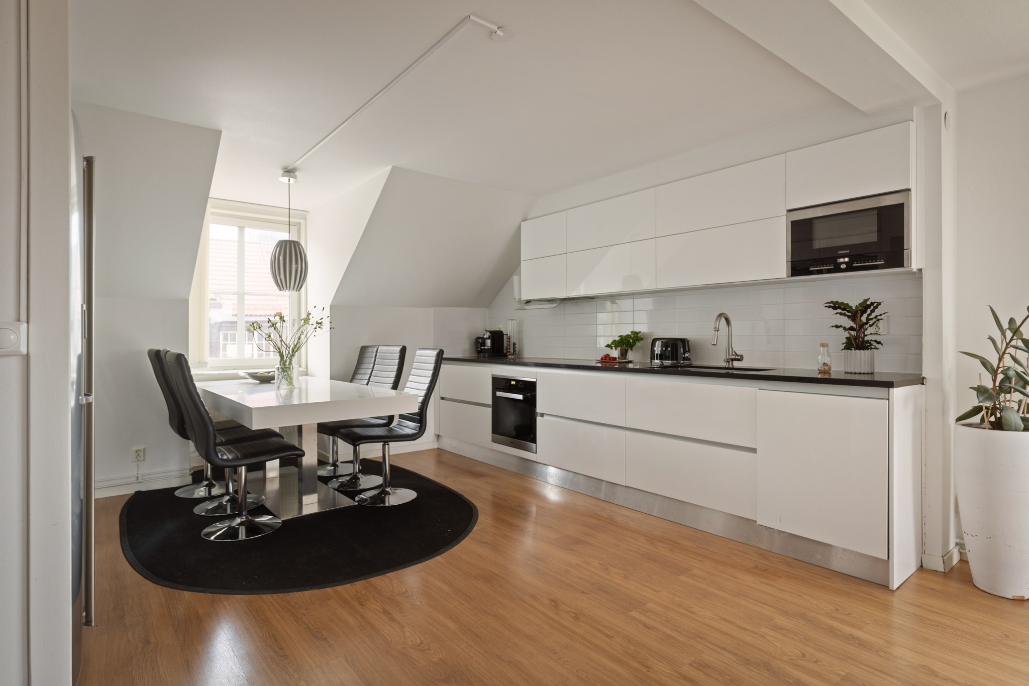 Köket har en välplanerad disposition med gott om plats för ett större matbord för 6–8 personer intill fönstret. Generösa arbetsytor och god förvaring gör rummet både praktiskt och inbjudande. Köket i ett stilrent och välhållet skick, fullt utrustat med diskho, diskmaskin, ugn, spis, kyl och frys. De vinklade taken framhäver den karaktäristiska vindskänslan och samspelar väl med bostadens stil.