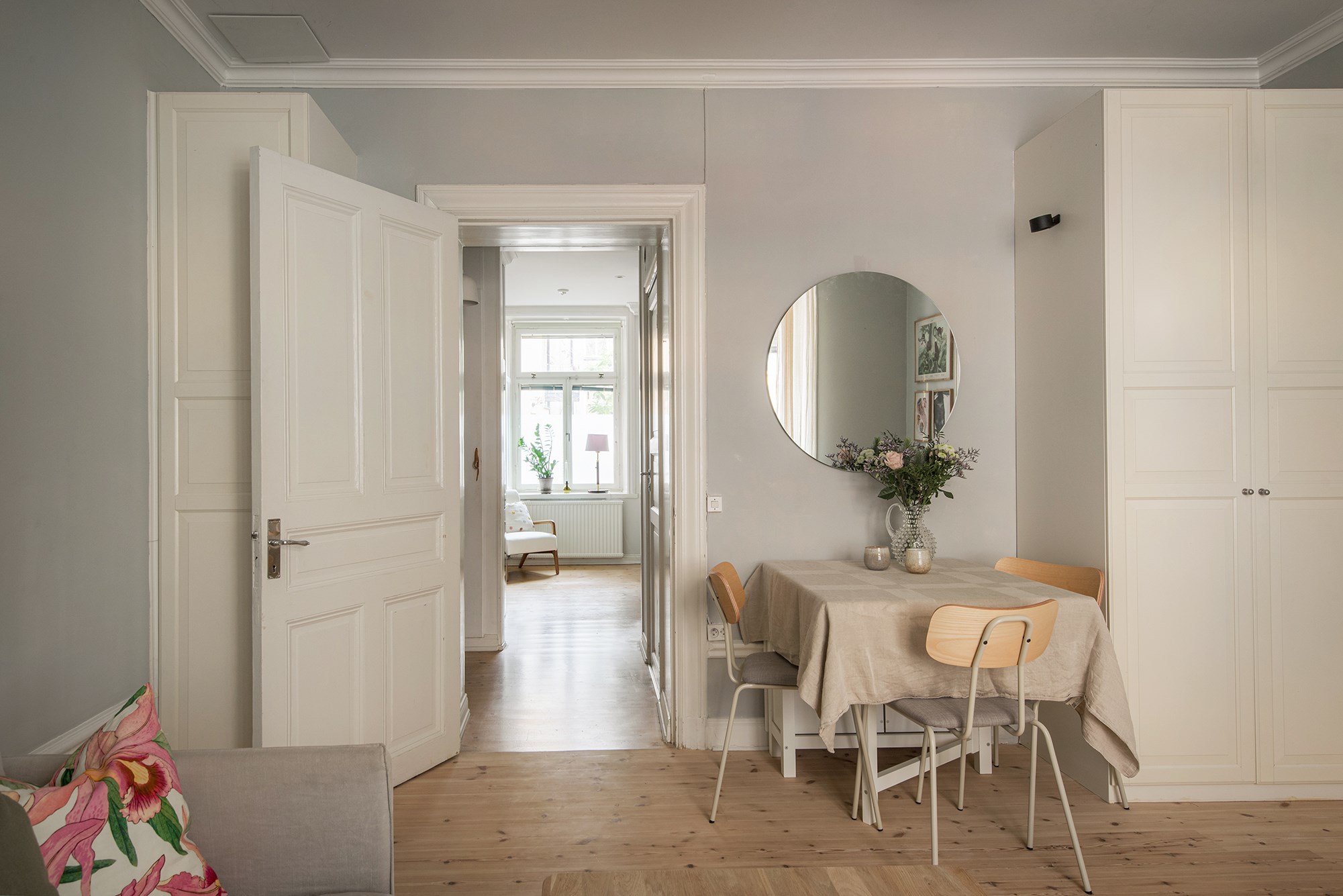 Ljuvligt sällskapsrum med generösa umgängesytor. Högt fönster med djupa speglade nischer ger fint ljusinsläpp och ytan är lättmöblerad med gott om plats för soffgrupp, middagsmöbel och övrig möblering. Bra förvaring garderober.